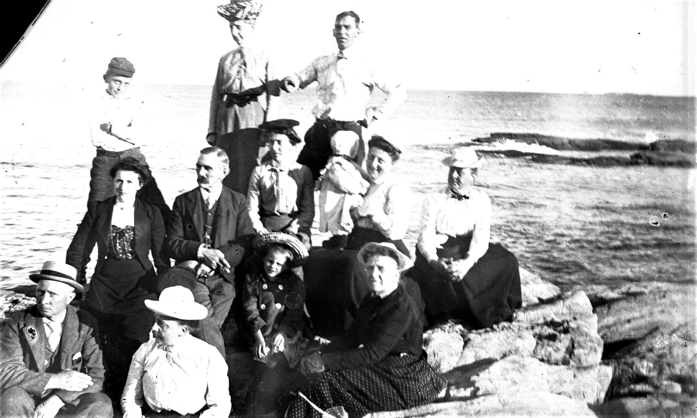 Glass-plate negative of thirteen people posing for a group photo at Old Orchard Beach, ME.