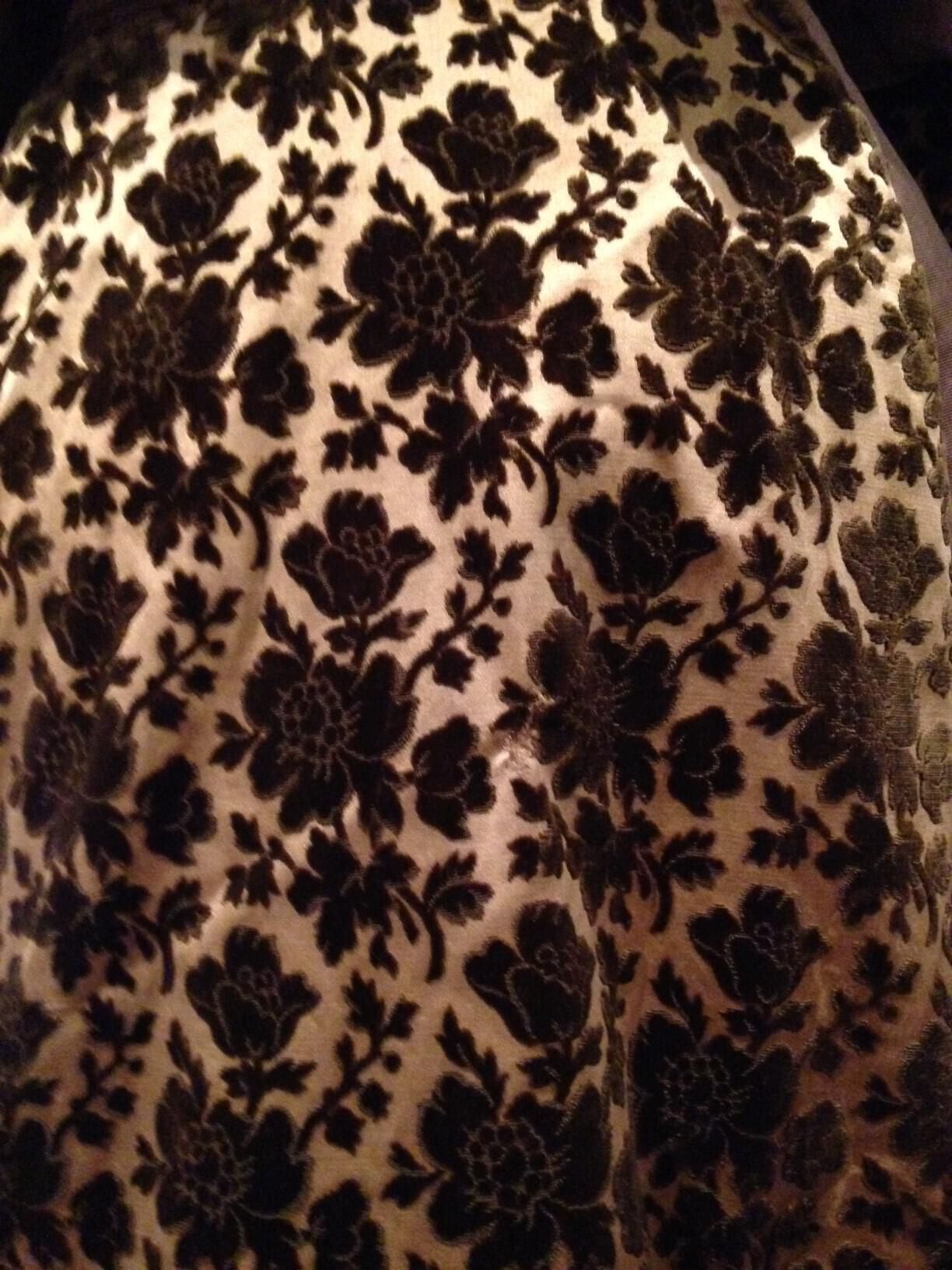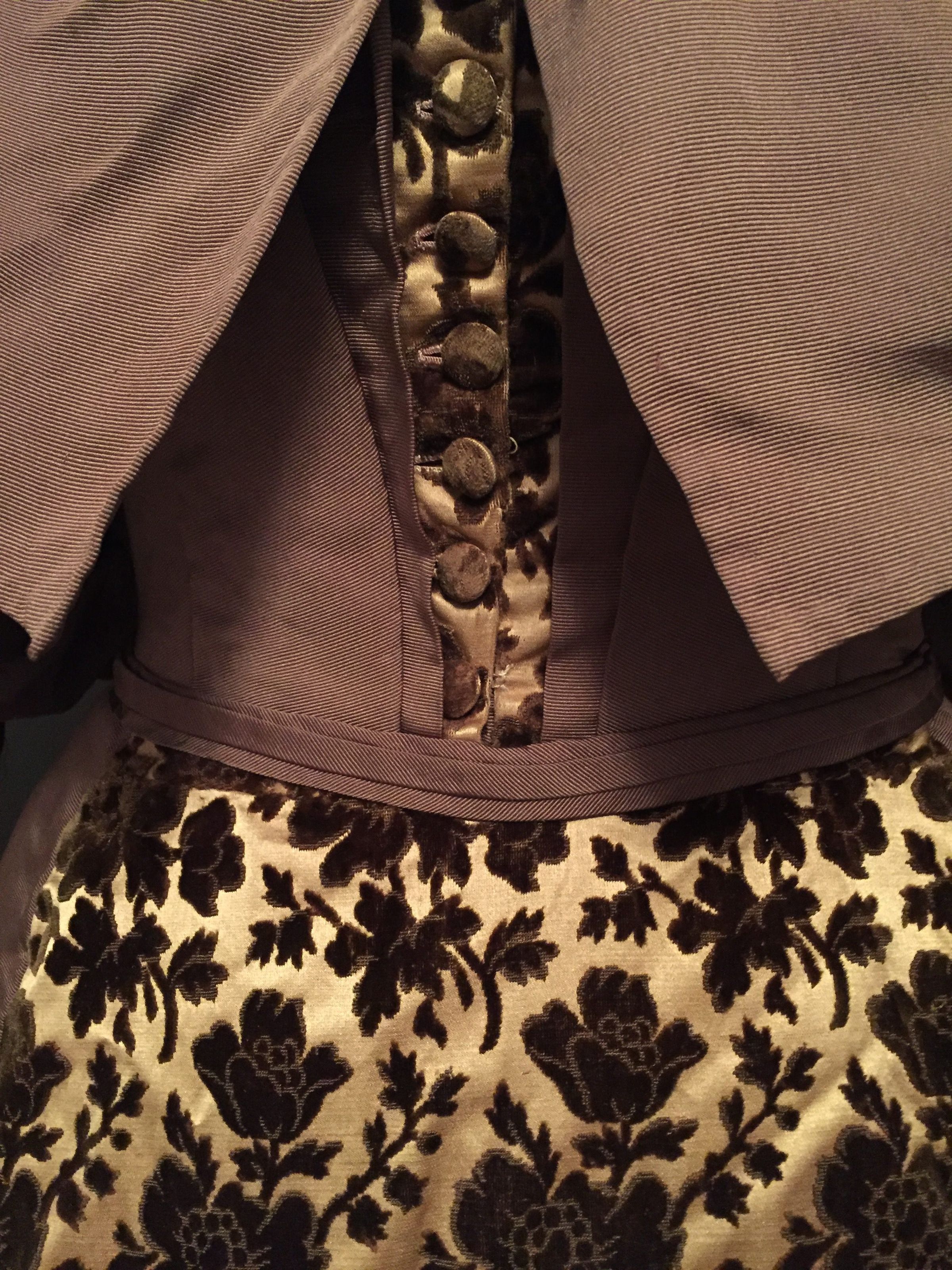 Faille is a type of fabric in which the weaving process creates a ribbed finish. It has a soft drape that lends itself beautifully to the full sleeves and very large collar ruffle of this dress, and to the small ruched band decorating the skirt. It is likely that the neckline has been altered since such an open line is unusual for a garment otherwise styled for daytime use, and the edge of the opening has loose threads inside hinting at the removal of fabric. It probably originally had a high collar. The star of the dress, however, is the sumptuous devorée velvet, the deep brown floral pattern revealed against the gold silk ground. Each fabric sets off the other to elegant effect.
