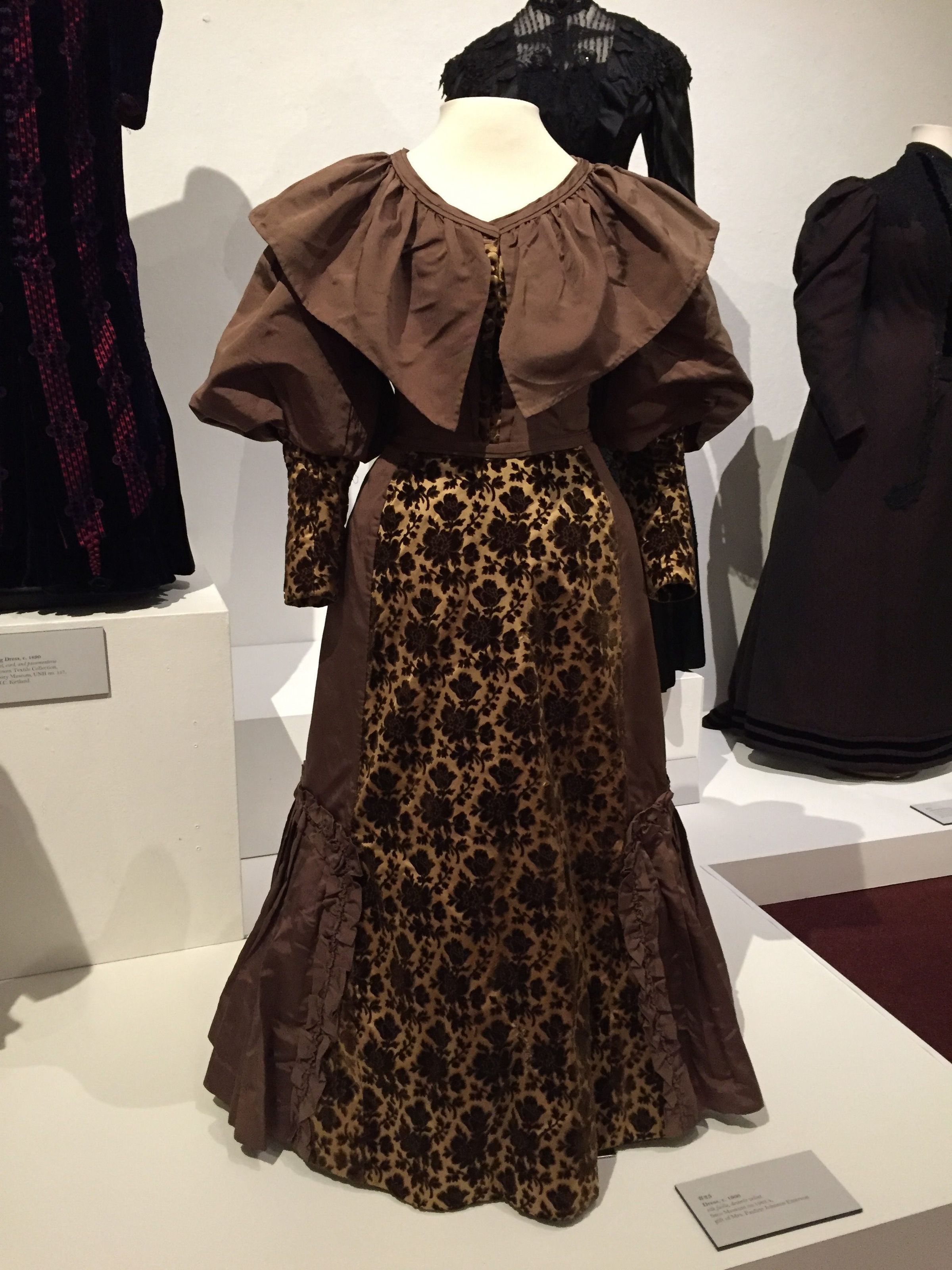 According to notes from the donor, this dress was worn by Mrs. Nettie Johnson Fairfield in 1900. However, with the enormous sleeves and the large ruffle, the style of this dress is more consistent with the late 1890s.