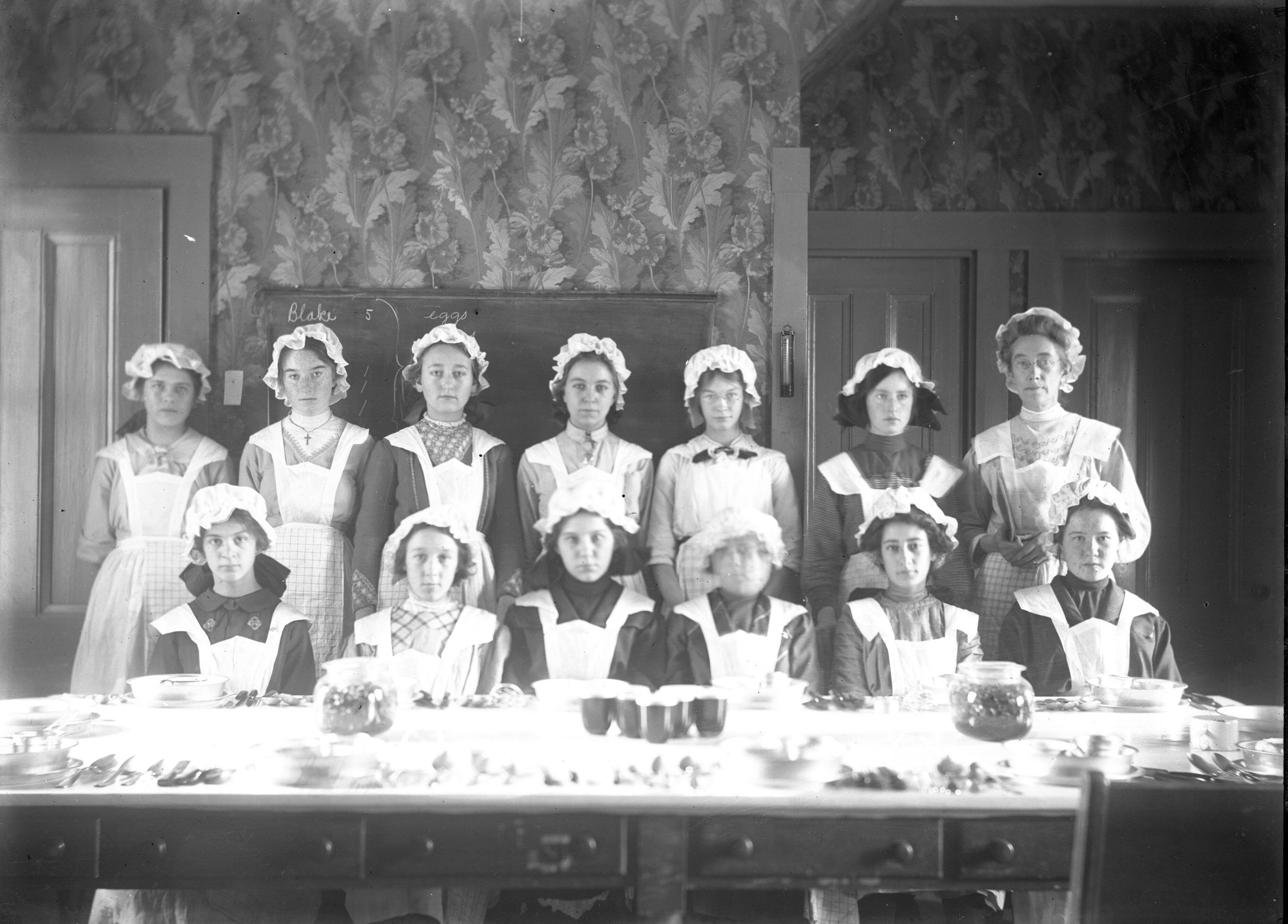 Glass plate negative photo of a cooking class. Possibly Thornton Academy students or a program by the Women's Educational & Industrial Union at 42 Beach Street, Saco in "Hamilton Hall" .