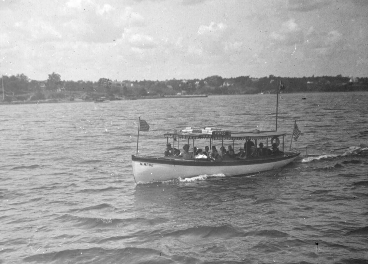 Glass lantern slide photograph of the boat Nimrod on the Saco River. "Nimrod on the Saco River, 1913" is written on the label on the plate. The Nimrod regularly carried passengers between Camp Ellis and Biddeford Pool. Oddly, there is a postcard from Charles Moody to his brother Fred Moody in the Moody postcard album collection in the Dyer Library Archives that features the same image, but the postmark date is "Sep. 5, 1910" - three years earlier than the date indicated on the slide.Made/Created