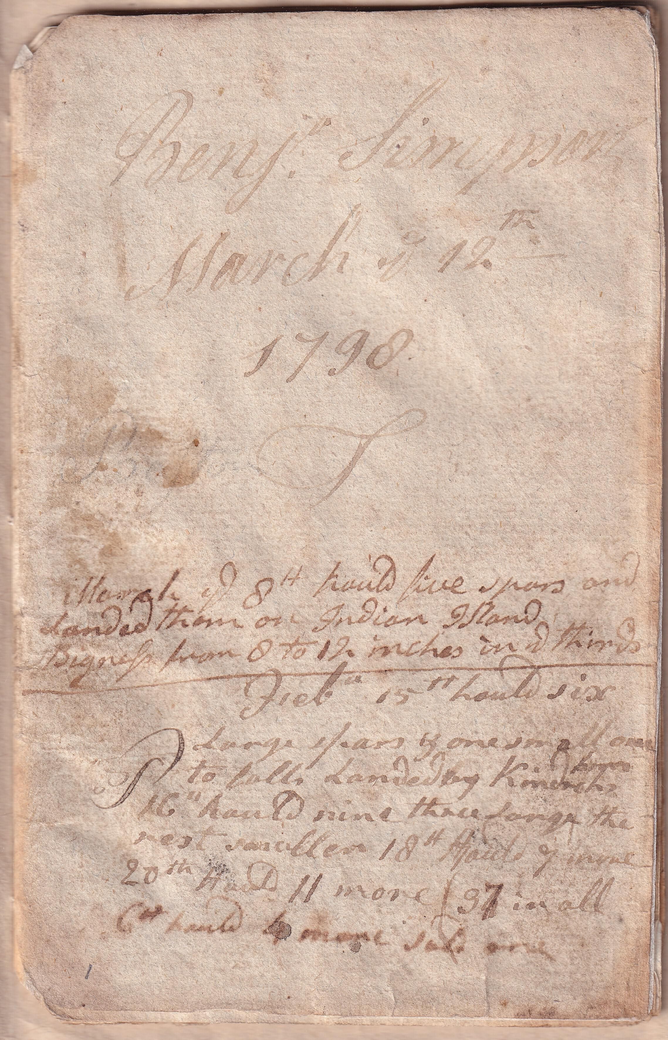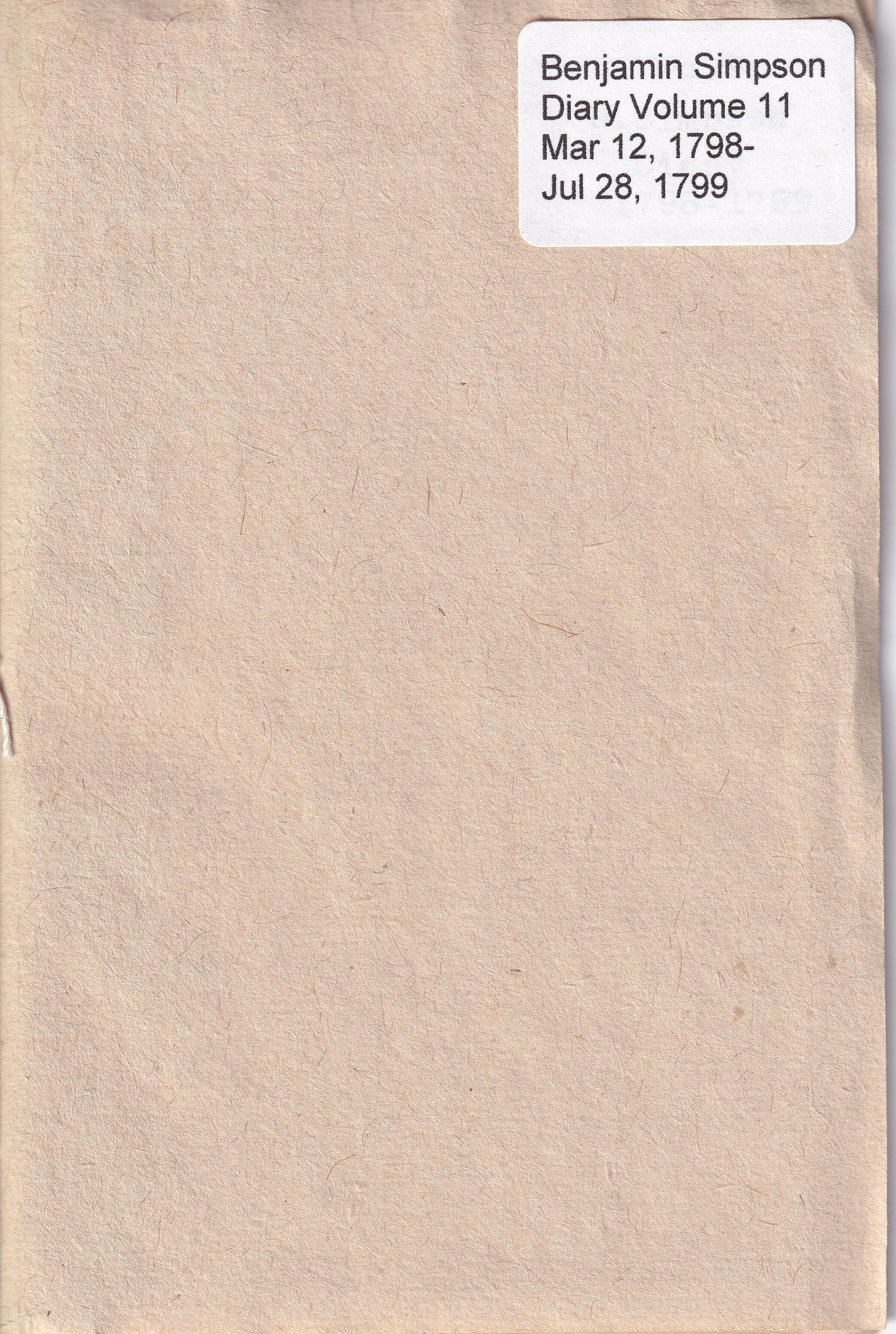 Eleventh volume of the diary of Benjamin Simpson of Saco, 1781-1849. This volume covers the period March 12, 1798 through July 28, 1799. It is handwritten in ink on rag paper with a handsewn binding; it is now housed in a modern paper cover. Most of the entries are a single line. The date is listed at the top of each page, with individual entries (without dates) listed below. Simpson noted his major task of the day and the weather. His entries reflect the seasonal nature of the work of a man who owned a farm but also was a skilled mason.