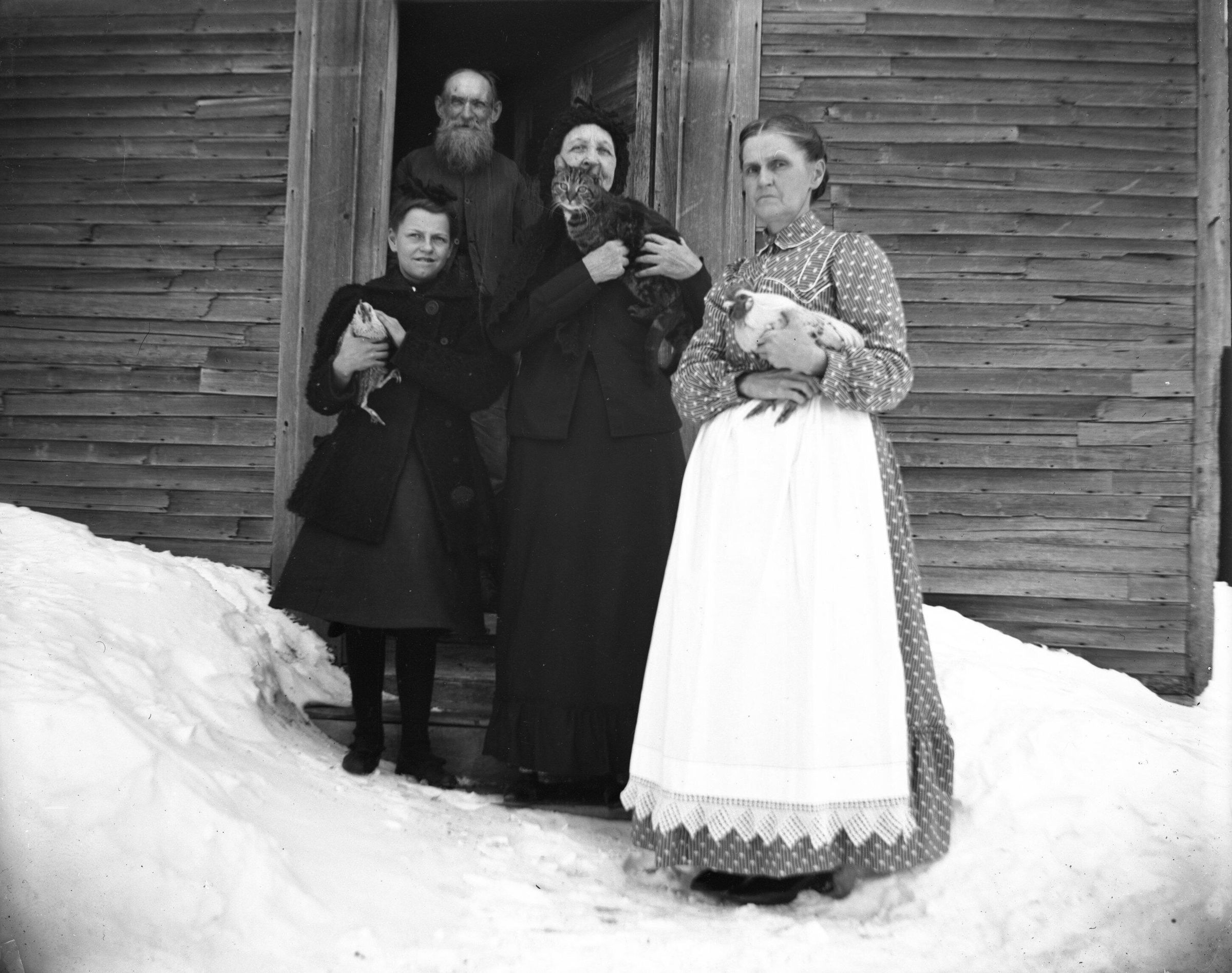 Glass plate negative photo of (from left to right) unidentified girl (holding a hen), Timothy Woodward, unidentified woman (holding a cat), and Almeda Usher Lane (Sarah Lane Hobbs' sister).