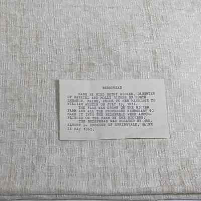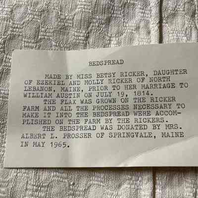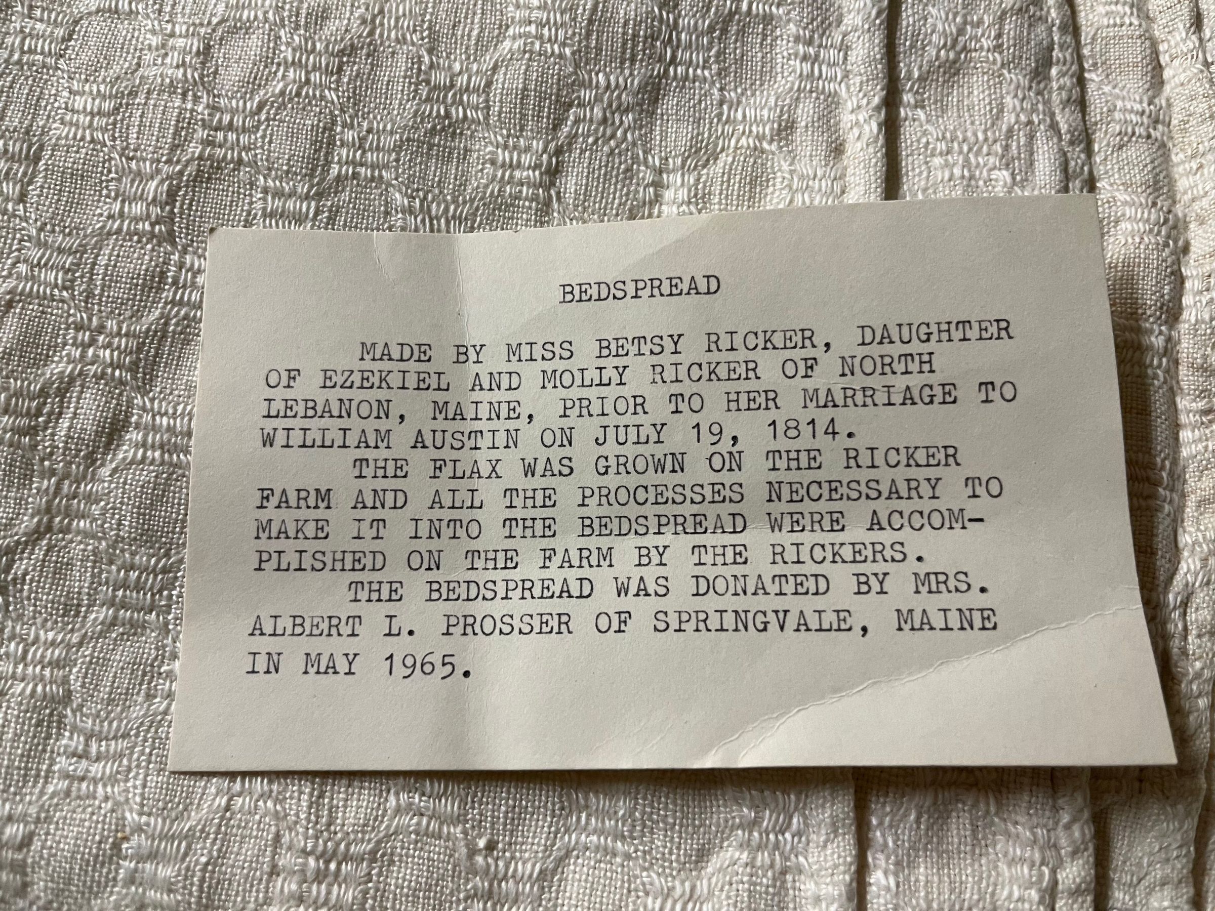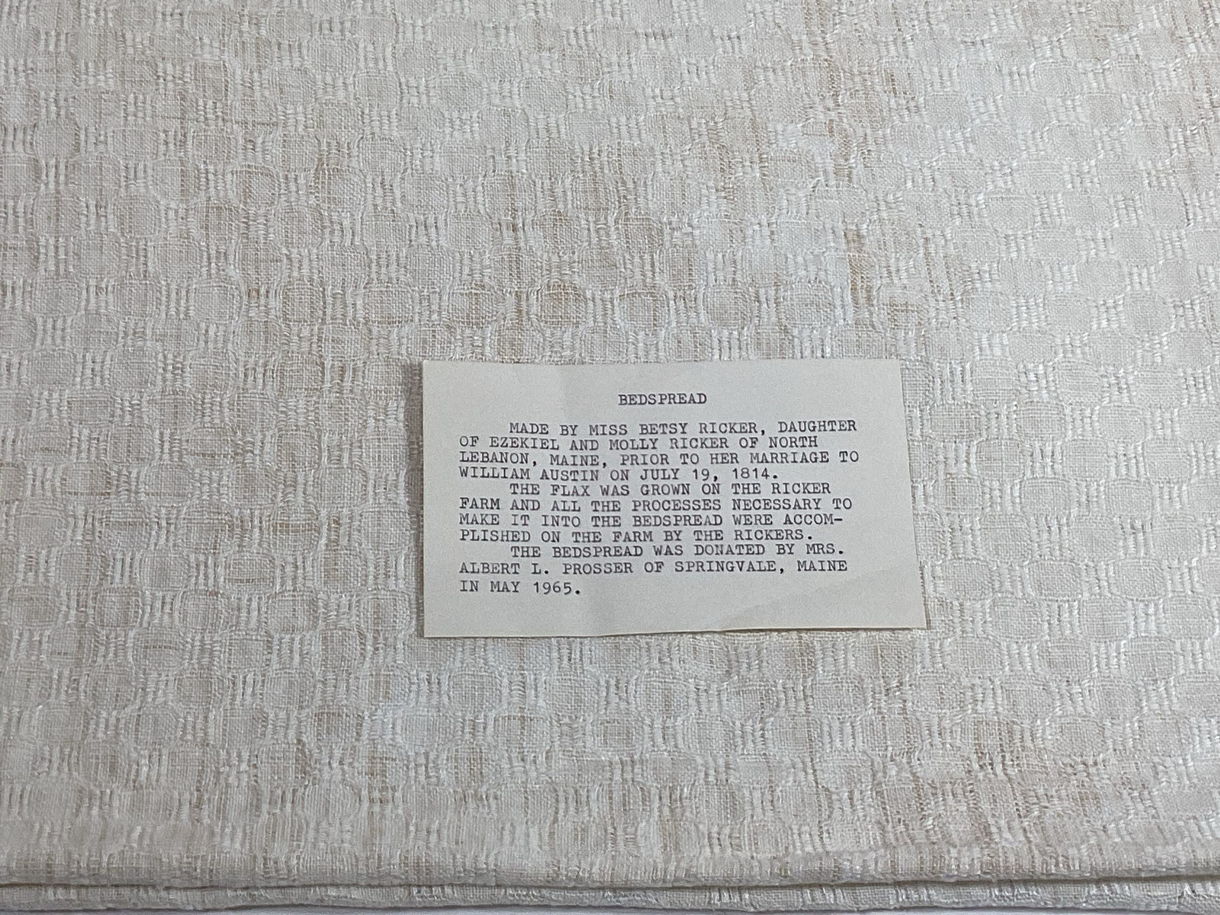 The history accompanying this coverlet (also called a counterpane) states that it was made by Betsy Ricker prior to her marriage to William Austin on July 19, 1814. According to the history, the flax was grown on the Ricker farm and all the processes necessary to make it into the bedspread were accomplished on the farm by the Rickers.