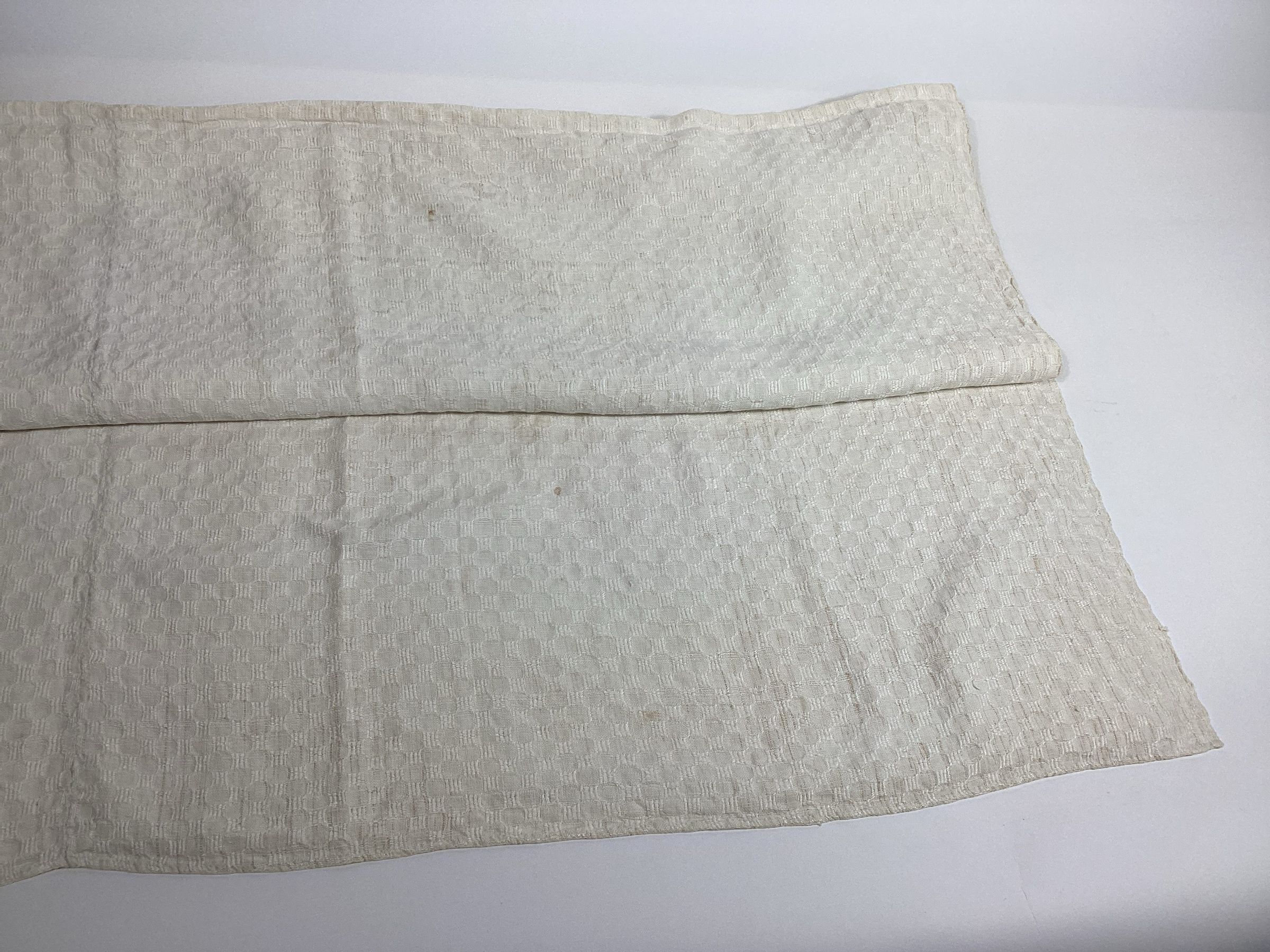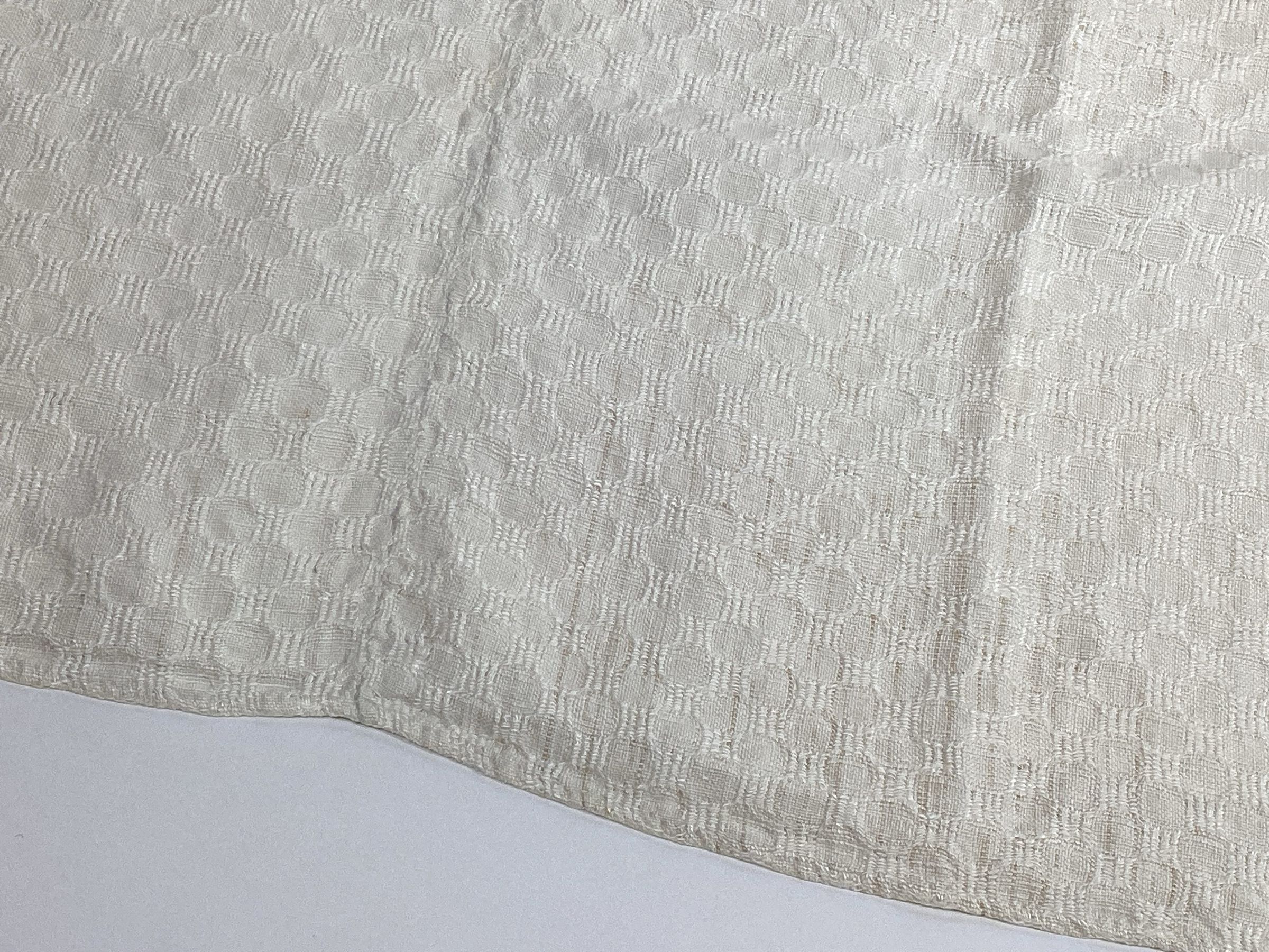 Betsy undoubtedly had a hand in most of the work although her primary involvement may have been in sewing the three lengths of cloth together side by side matching the pattern and hemming the ends. Weaving linen in such a fine pattern as the alternating blocks of plain and rib weave in a check (referred to as M’s and O’s) required skill and a great deal of patience. The end result was stunning as the silken appearance of the floating weft threads in the ribs contrasted with the areas of plain weave creating an illusion of depth and texture