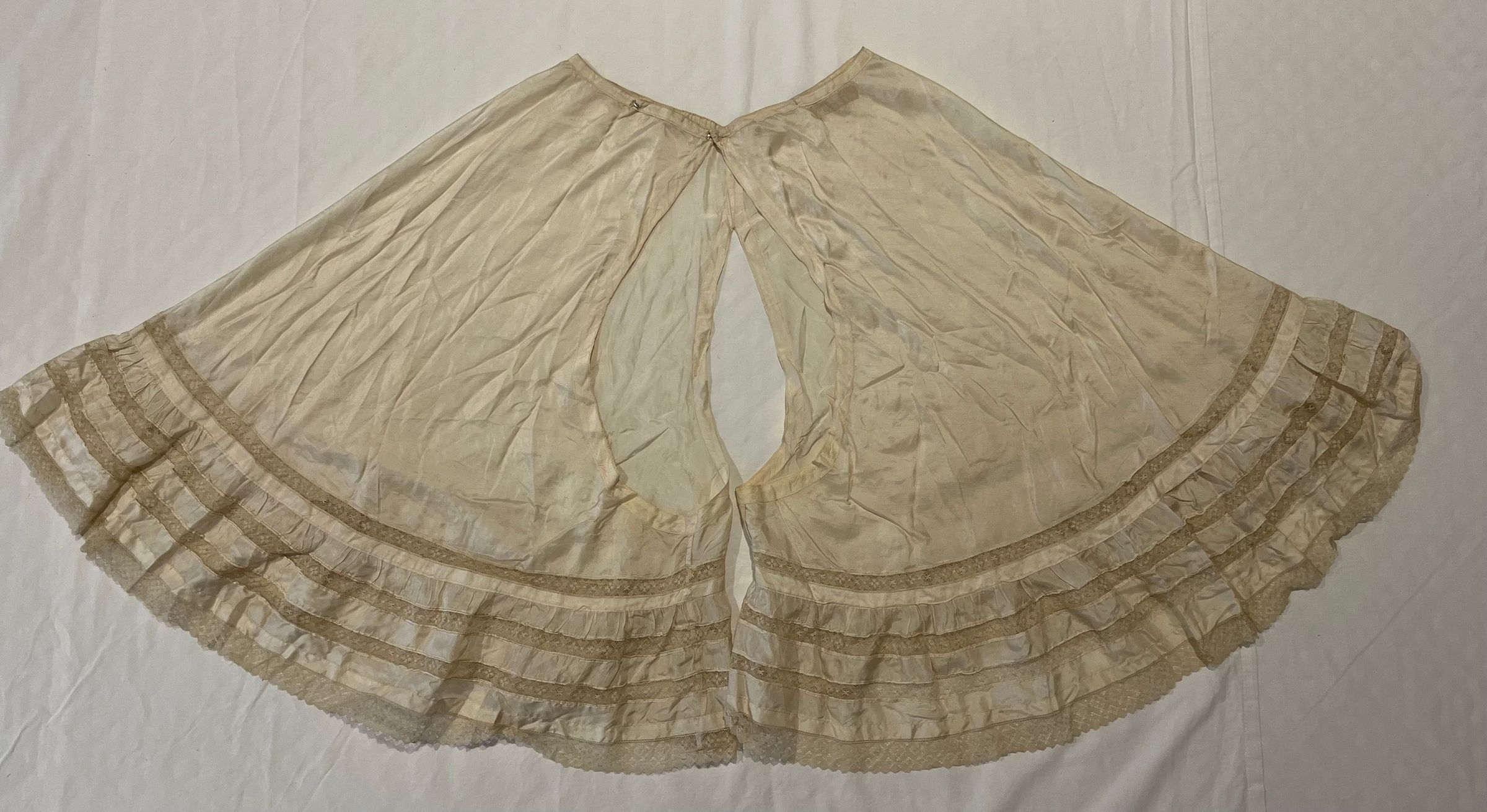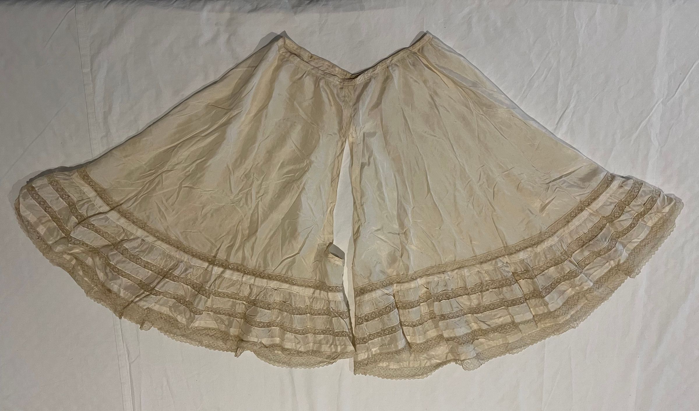 Cream colored silk underdrawers with lace trim. Joined at the waist with a fabric waistband. Open at the crotch and two-thirds down the legs. Very wide legs with three rows of narrow lace inserts and a wider band of lace at the hem. Closes in the back with hooks and eyes.