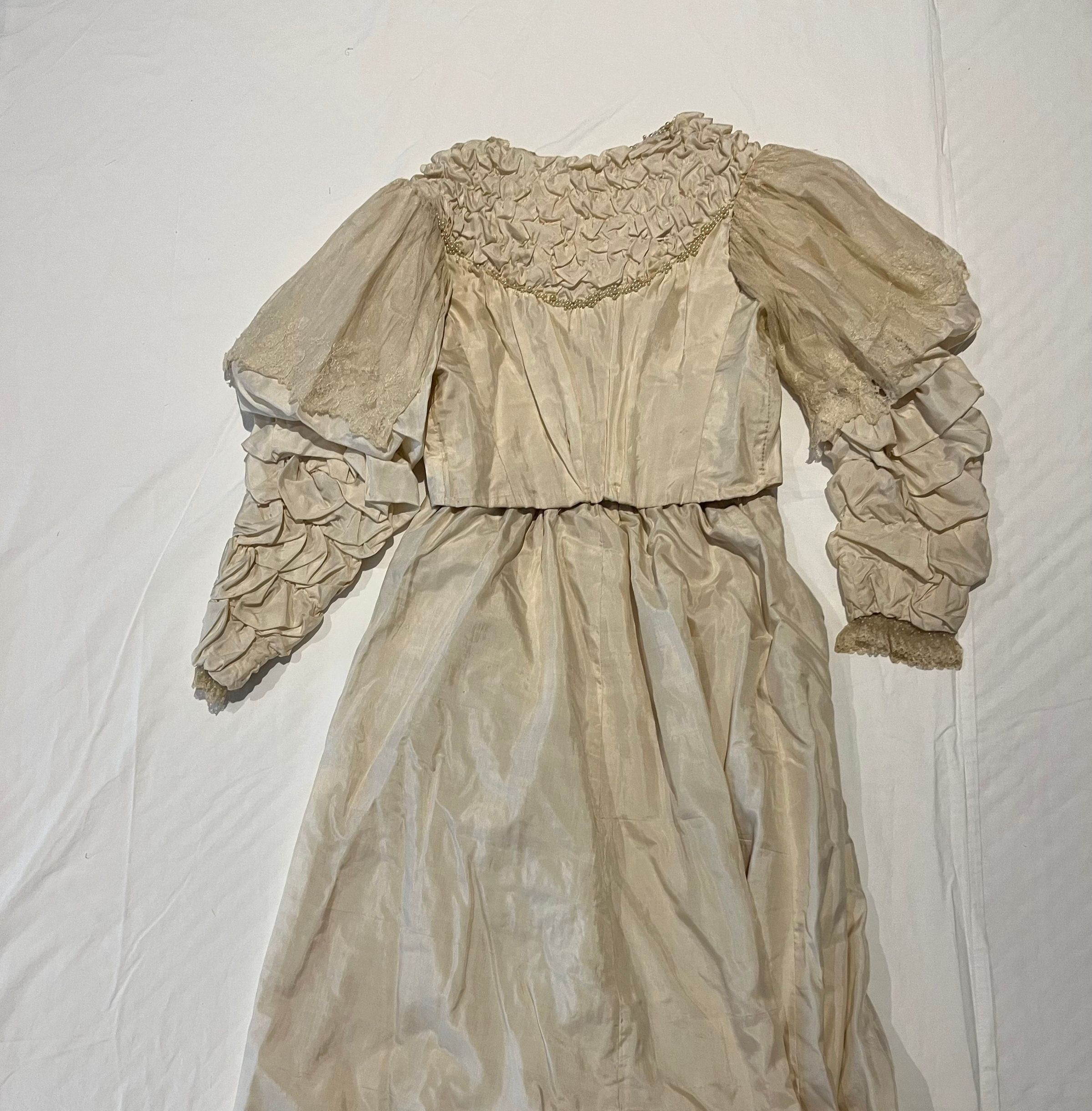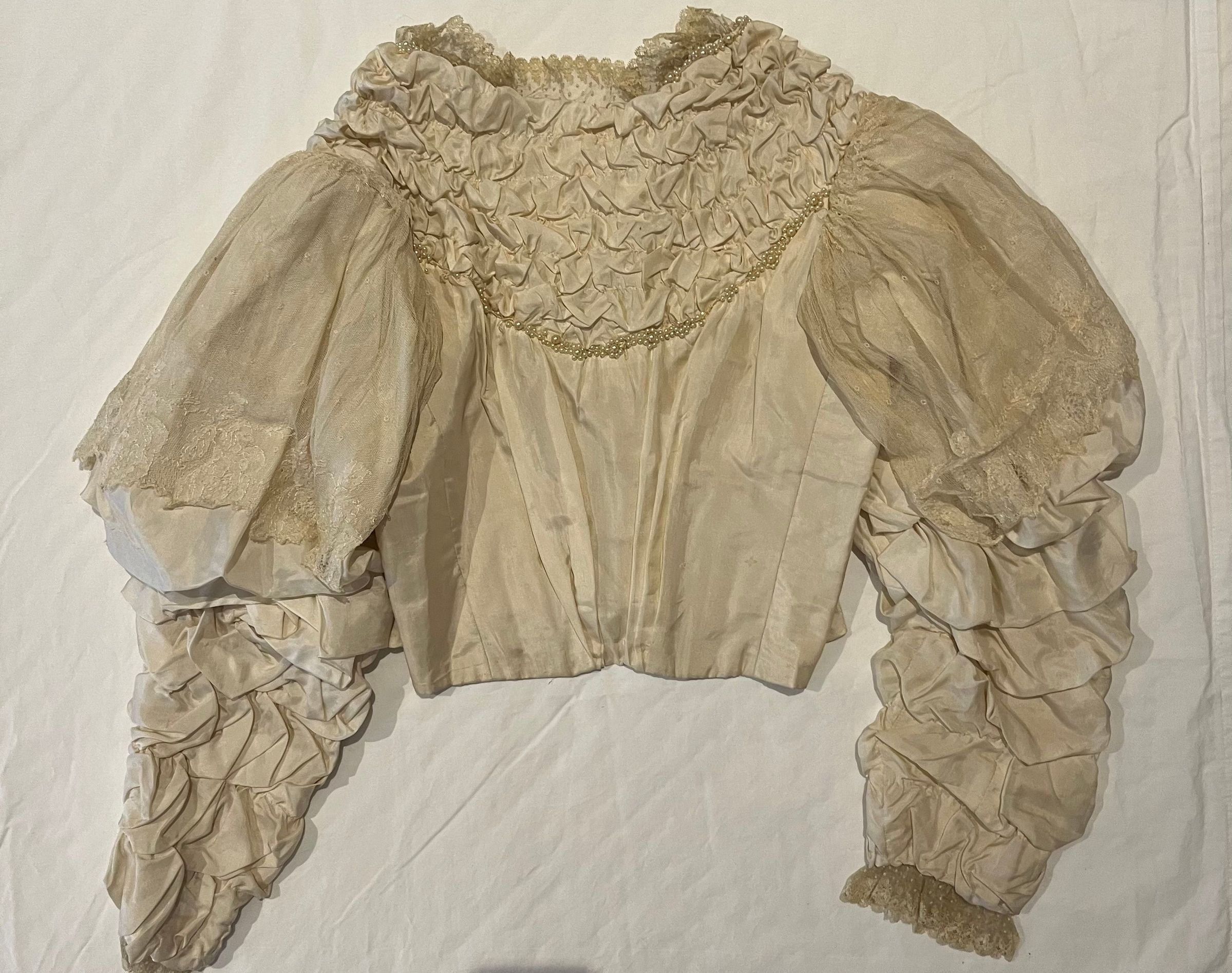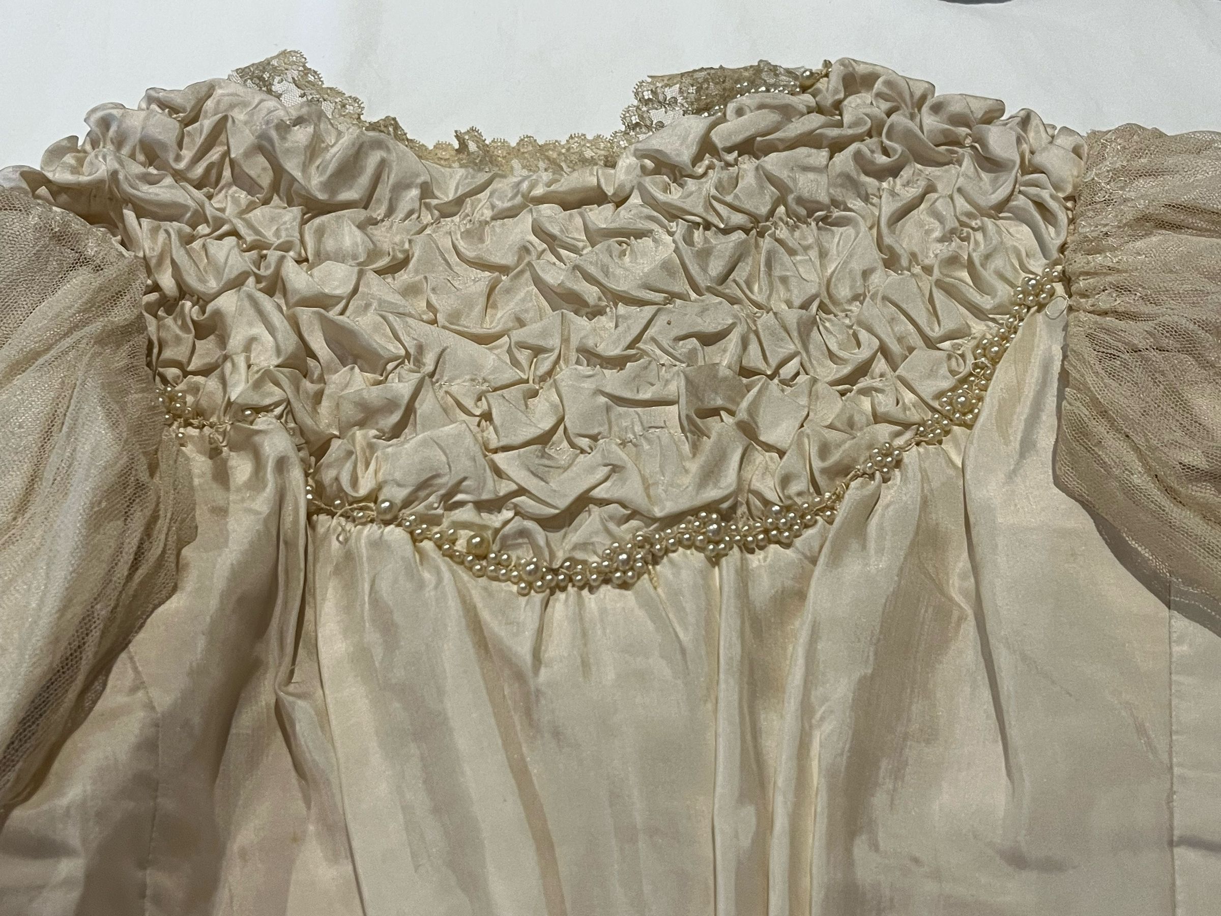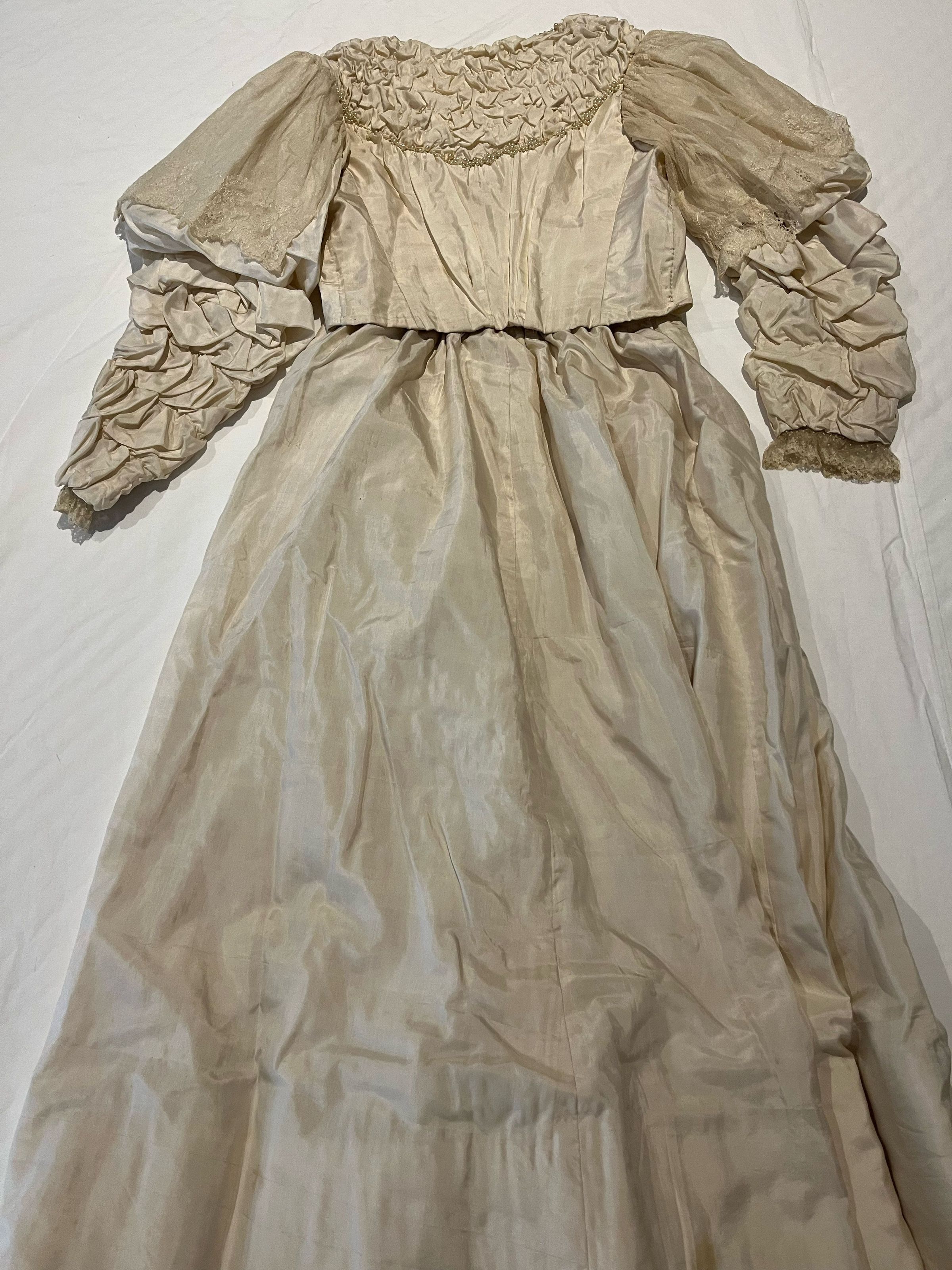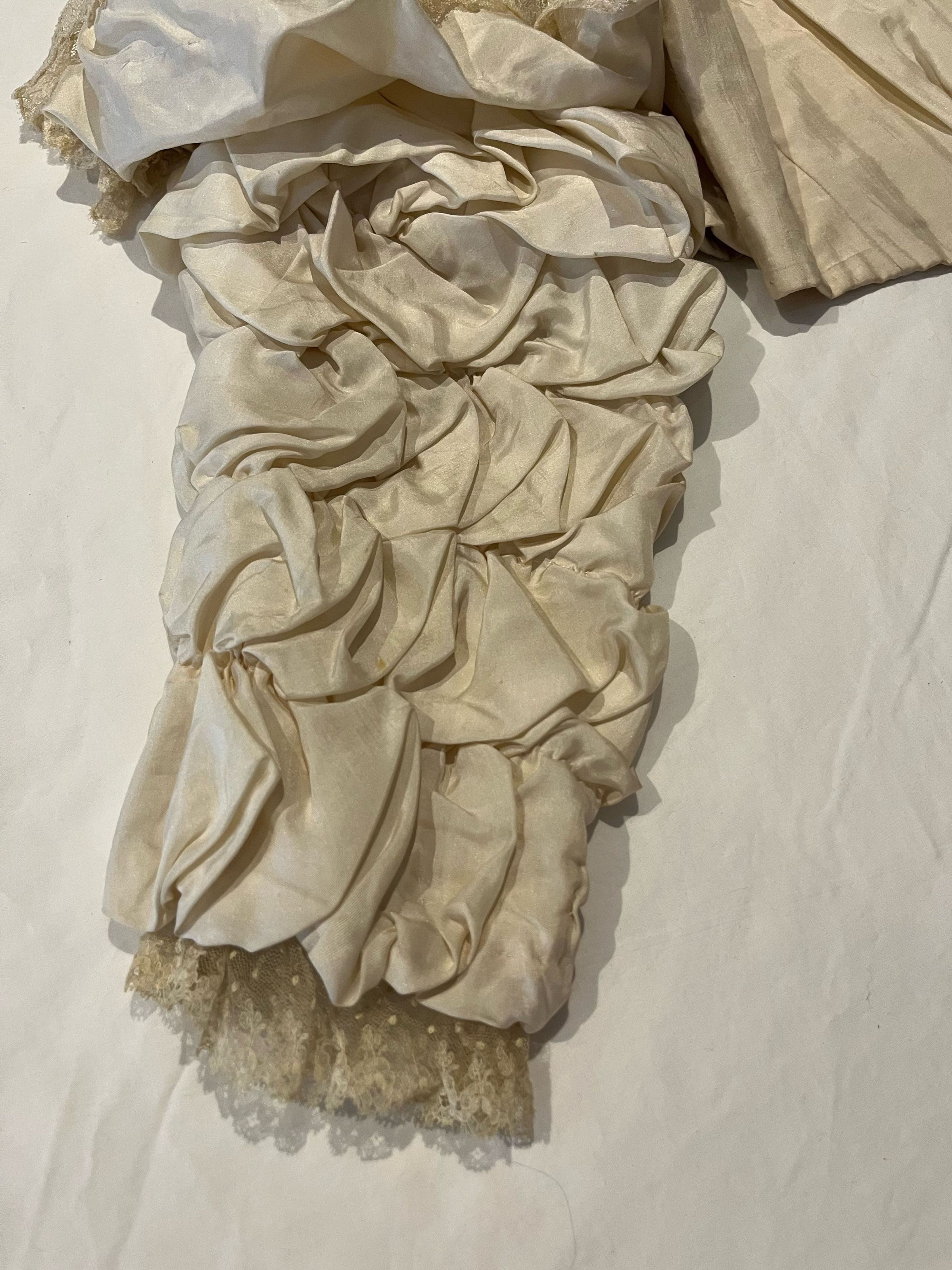 Wedding gown, Isabel (Cummings) Buker, ivory colored silk satin consisting of a full skirt gathered into a twill waistband and stiffened with two layers of lace-trimmed crinoline at the hem. A fitted bodice is attached to the skirt with brass hooks and eyes. The bodice has a round neckline trimmed with a soft lace standing collar. Ruching defines the yoke of the bodice: round in front and V-shaped in the back, both feature large and small pearls sewn at top and bottom of the yoke. The sleeves are full and soft at the top and are gathered into five rows of ruching down the forearm, ending with the same lace at the cuff. Ten inches of gathered lace cover almost the entire upper sleeve. The back of the bodice is secured with hooks and eyes.Dimensions