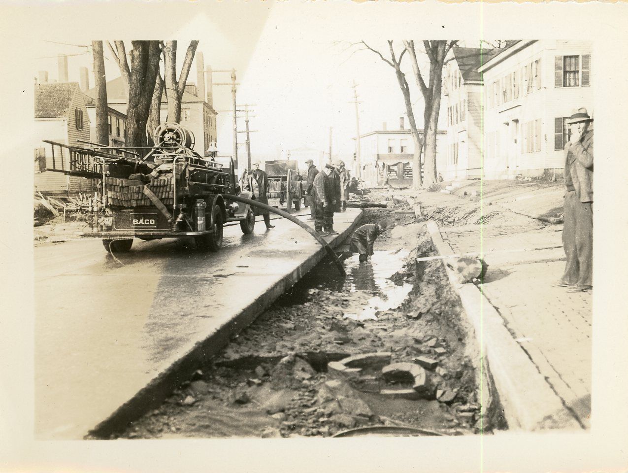 Black and white print photograph of firefighters draining Saco River flood water from street. From the Sawyer House Collection.