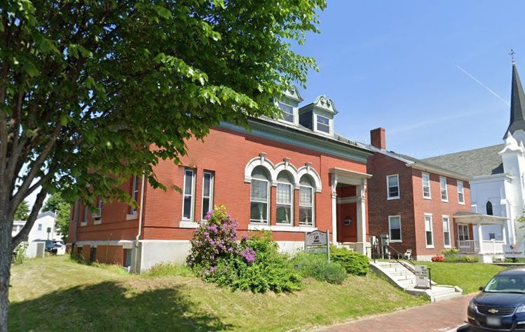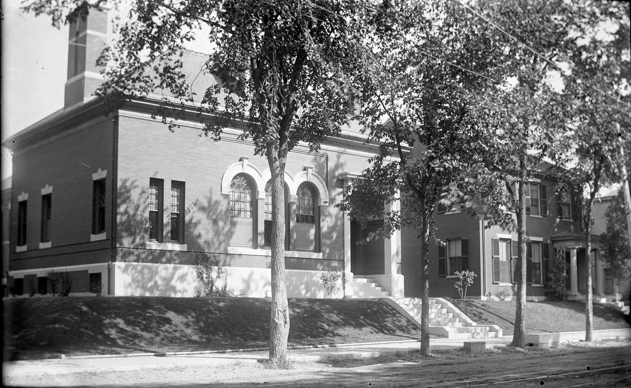 Glass plate negative photo of the old Dyer Library on Main Street (now Stepping Out Dance Center). The James Curtis House (1827) can be seen on the right. The Old Dyer Library was built in 1893 by architect Horace G. Wadlin. Previously the library operated out of the basement of City Hall. In 1955, the library moved to the Deering Mansion. The location has been a dance studio for many years.