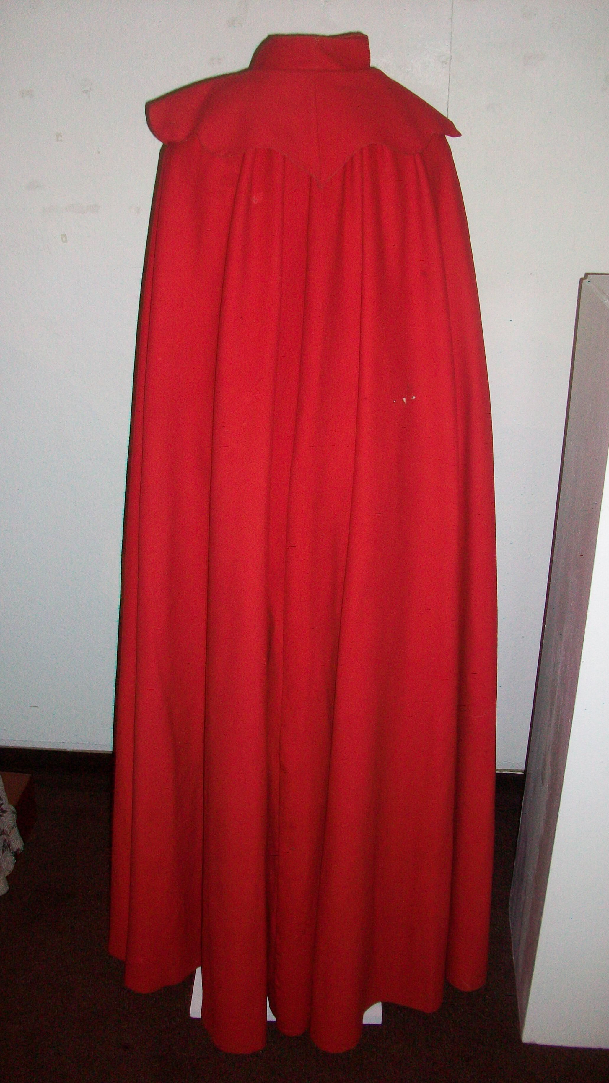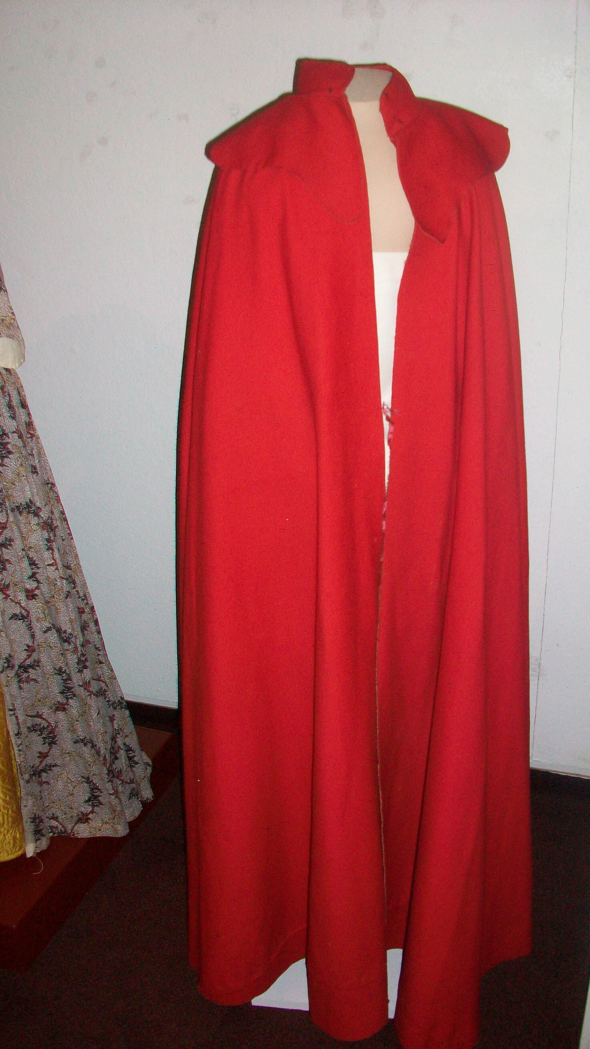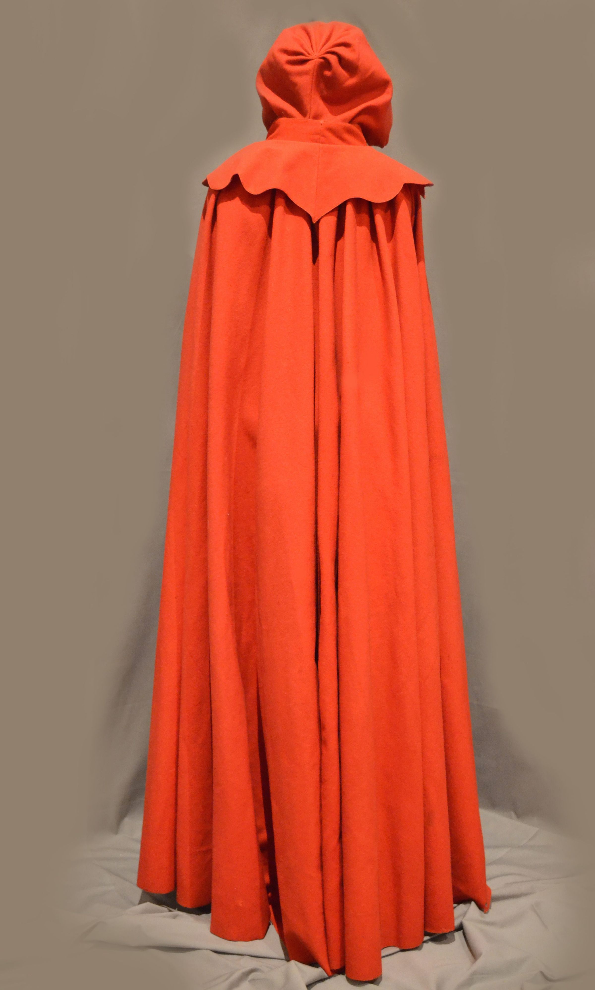 This cloak is made of wool broadcloth, which was woven on a wide 60” loom. After weaving, the cloth was fulled, or deliberately shrunk, napped to make the surface fuzzy, and then shorn close to the surface to create a dense, almost waterproof fabric. Broadcloth's compact nature also meant that it would not ravel when cut, making it unnecessary to finish edges. Although many cloaks had attached hoods, this one has a separate hood made of the same fabric. The lower edge of the hood is unbound, unlike the edges of the shoulder cape, perhaps indicating that it was designed to be worn tucked under the stand-up collar of the cloak. The diameter of the hood is also on the small side, especially when compared to the size of the black silk cloak of the same date, so it is also possible that the hood was made later.