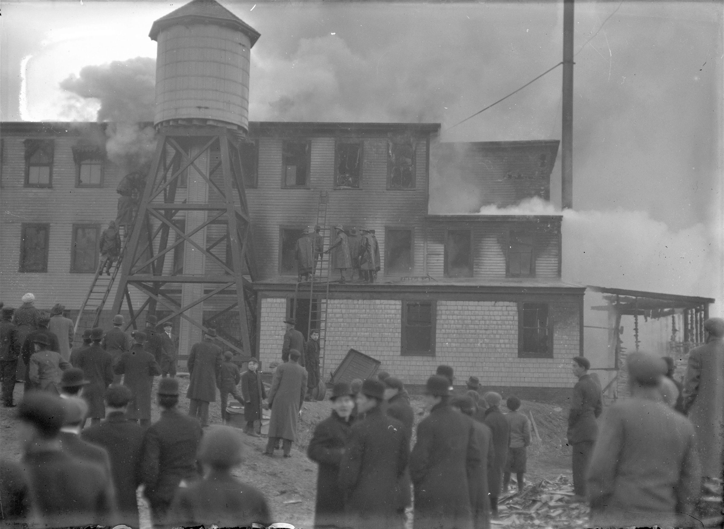 Glass plate negative photo of firefighters on a ladder at a window near a water tower with a crowd looking on. The Somesville fire in Saco occurred on September 15, 1908.