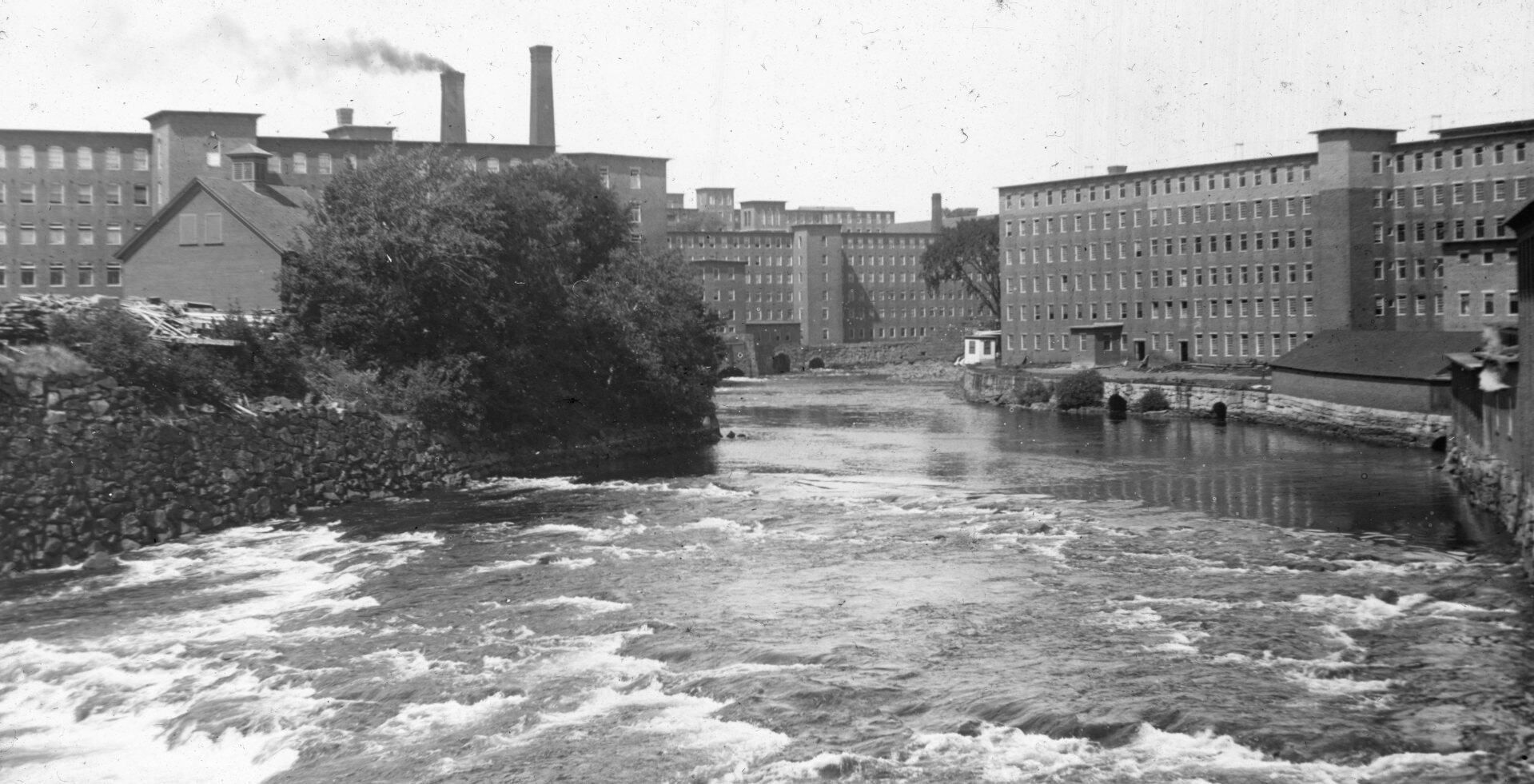 Glass lantern slide photograph of a view of the Saco River passing between Biddeford (left side) and Factory Island (right side).