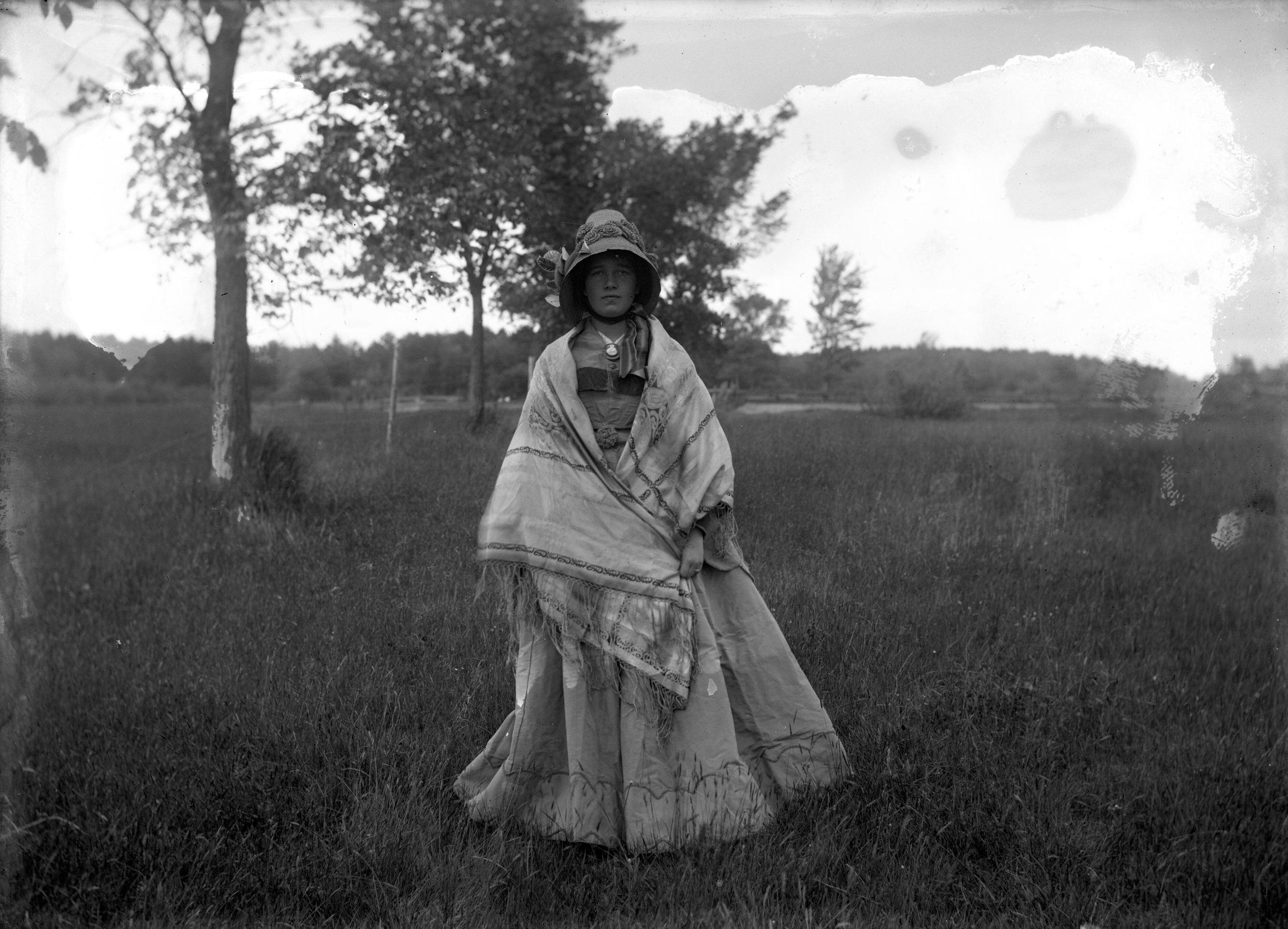 Glass plate negative photo of an unidentified young woman dressed in period costume from the Thornton Academy Centennial Celebration, June 19, 1913. Thornton Academy put on a "History of Saco" pageant to celebrate the founding of the school. (Also see 2021.24.85 though 2021.24.90)