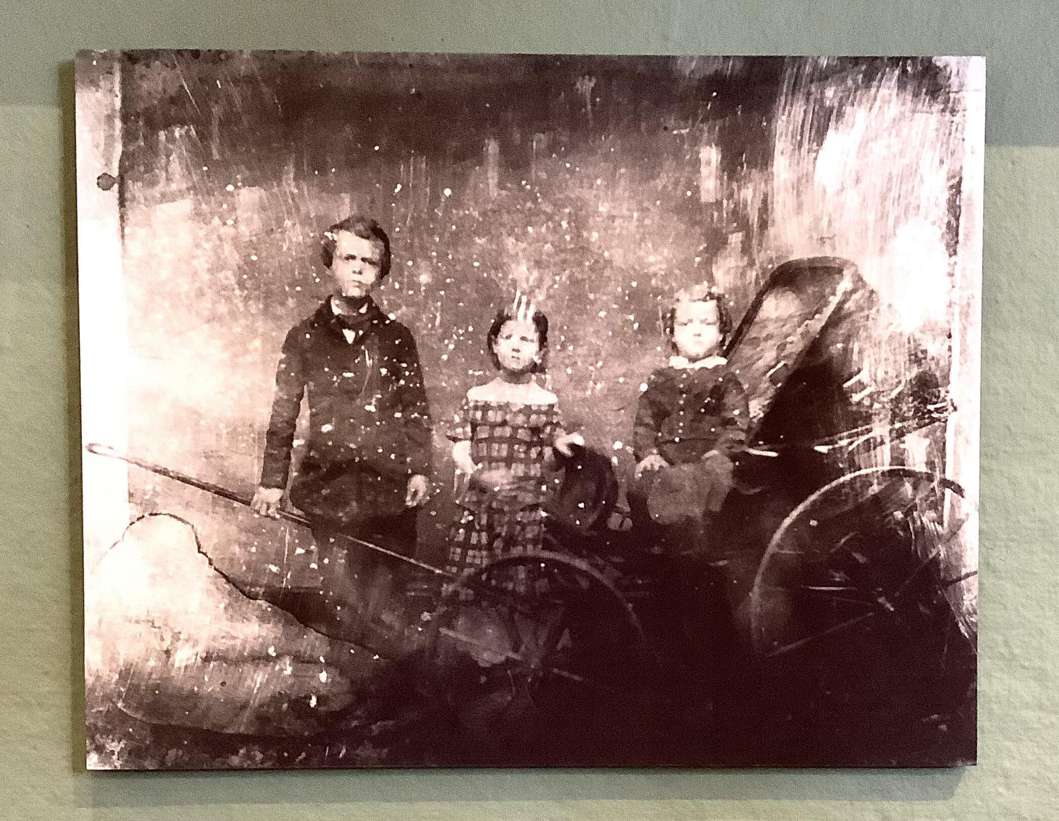 Although Bradbury's usual method was to work from sketches, in the case of this painting he used a daguerreotype instead [a copy of which is on the right]. In the 1850s, photography was still rather new and few painters at the time used photographs as a source for their work. In the daguerreotype, there are three children seated in a small carriage that lacks a horse, while in the painting there are four. The Owens had four children: George born in 1843, Lucy born in 1857, William born in 1850, and Isabelle born in 1852. Lucy died at age eight in 1855, so the daguerreotype must have been taken after that date. Bradbury probably included her in the painting at her parent's request.