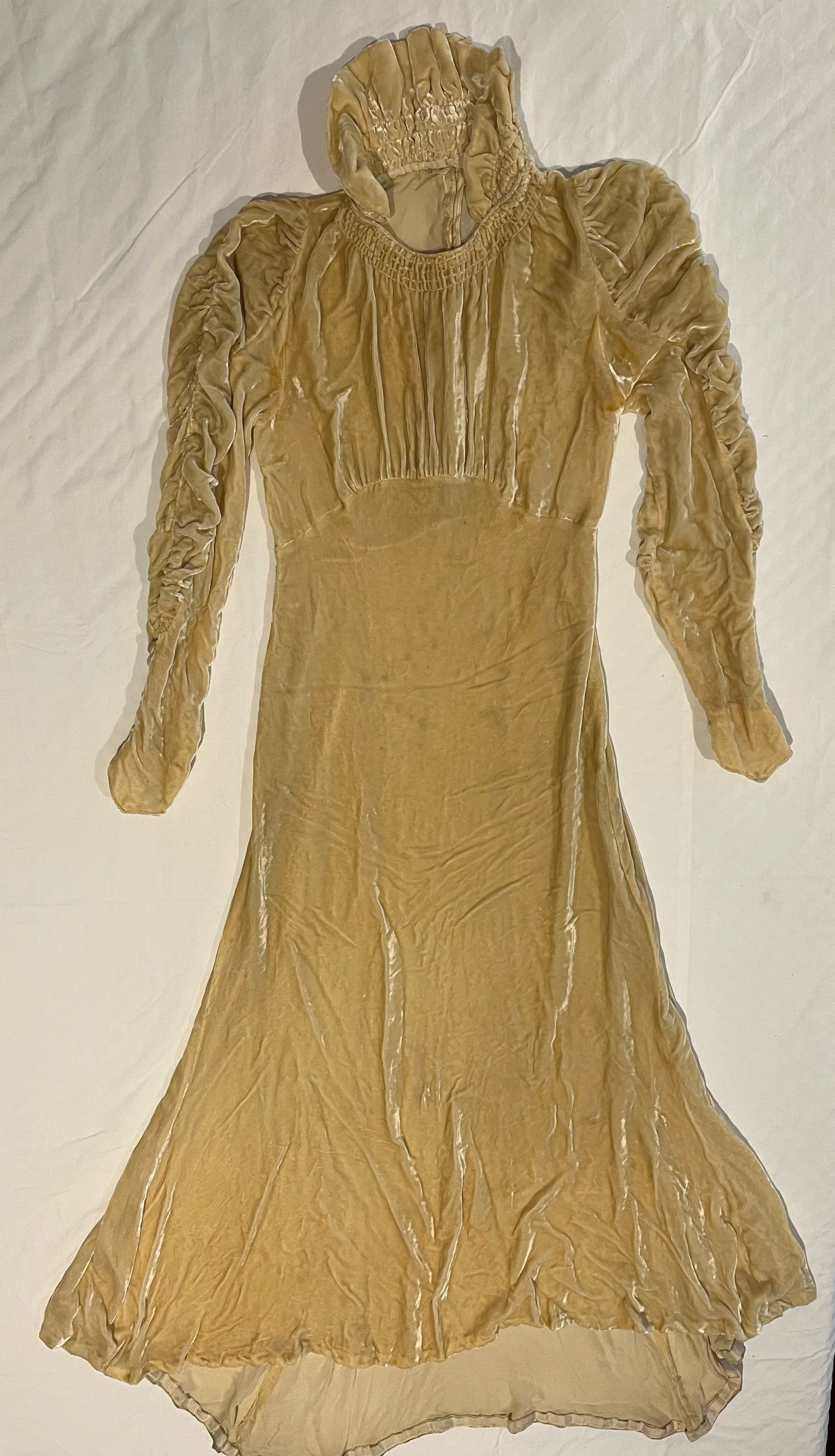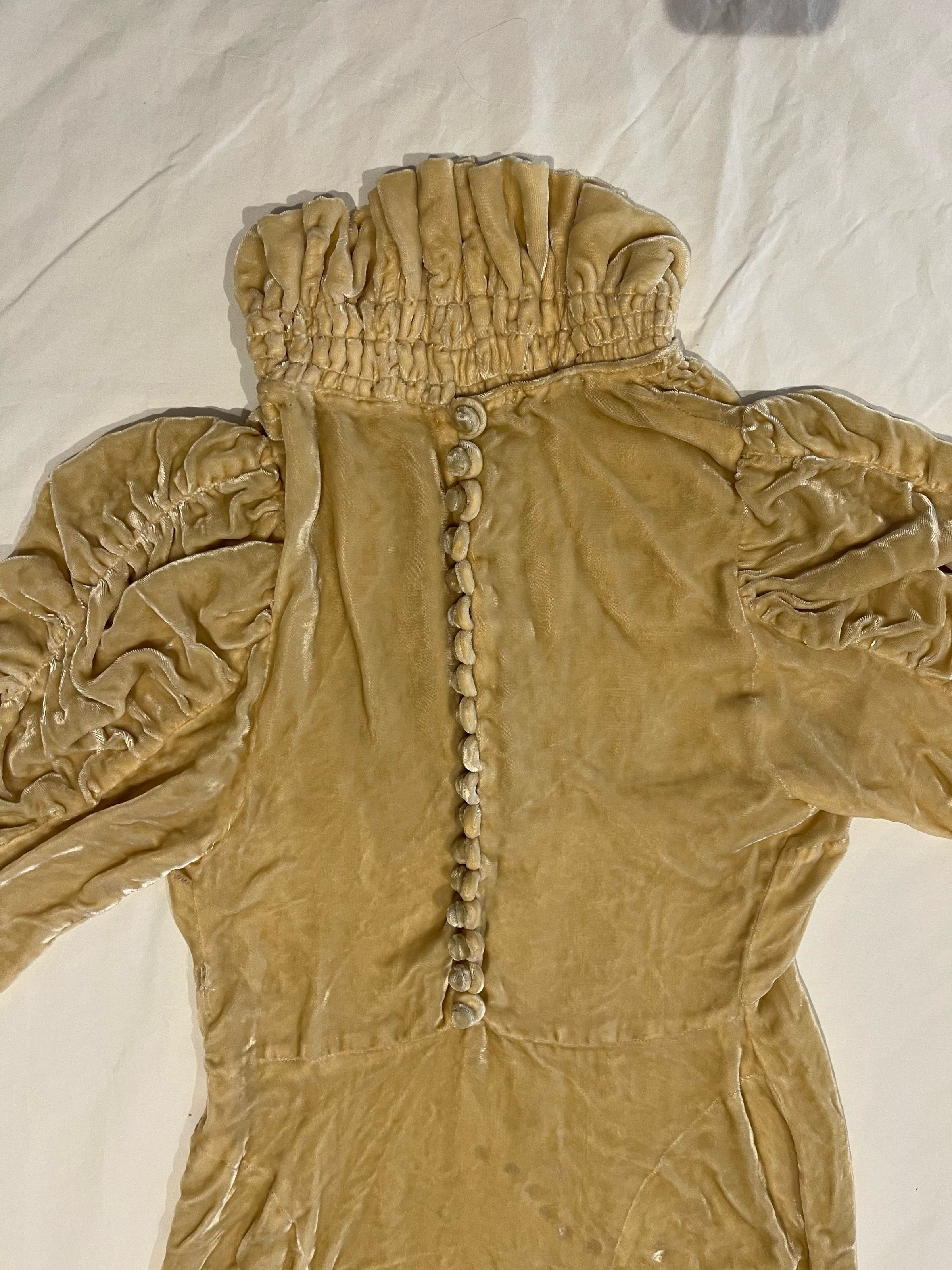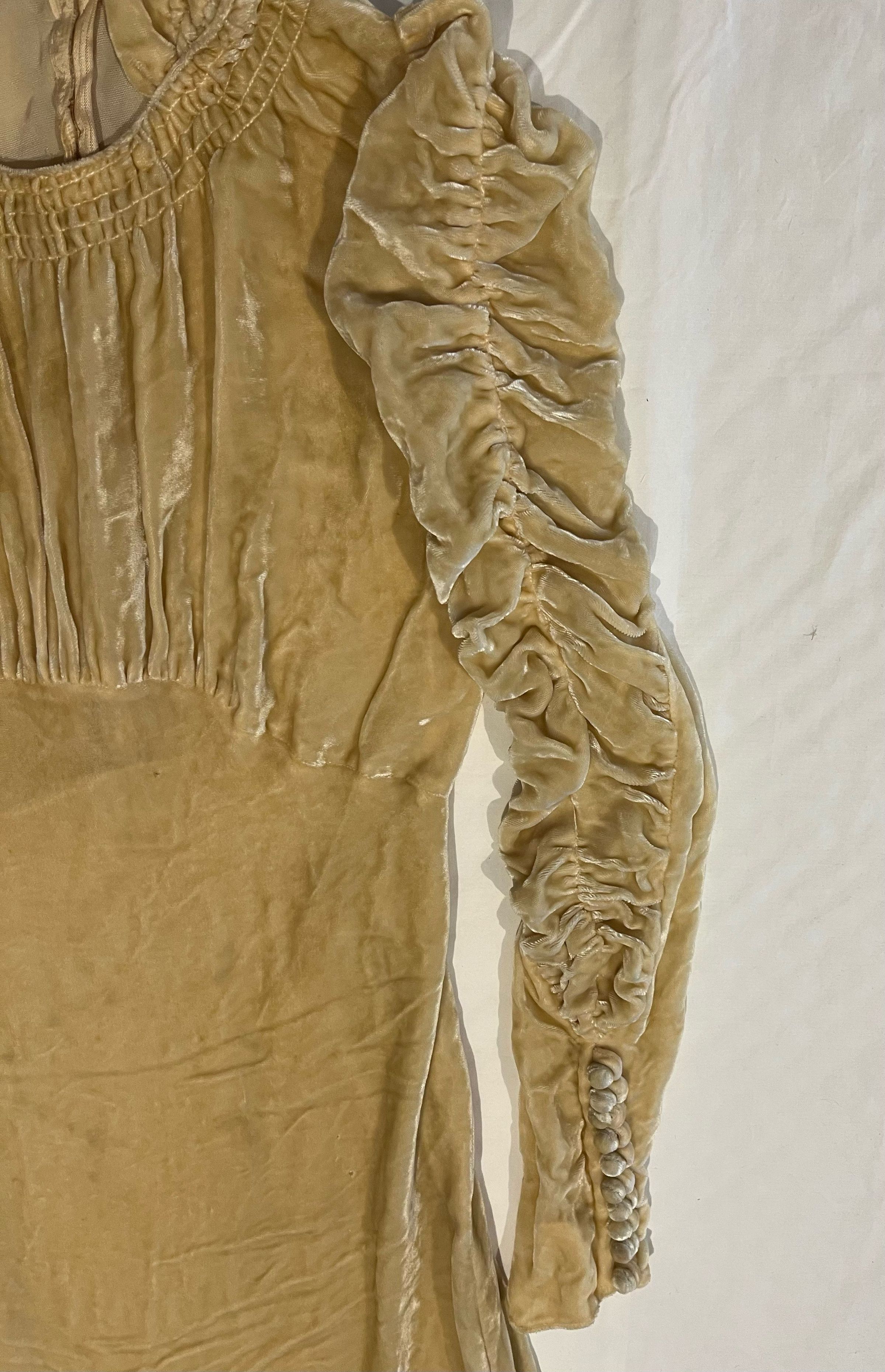 Butterscotch colored silk velvet bias-cut evening gown. High standing collar at the back of the neck with several rows of gathers; supported by four stays. There are a series of small snaps at the right side seam of the neck to allow the wearer's head to fit through the neck opening. Closes down the back with a series of fabric-covered buttons. Sleeves are full at the top, gathered down the outside, narrowing below the elbow to a tight sleeve which end in a point over the back of the hand. The lower section has a row of fabric-covered buttons. Curving waist seam above the natural waistline. There is an opening at the right waist that closes with snaps. The back of the skirt has princess seams curving away from the waistline. Weighted hem with a slight train.