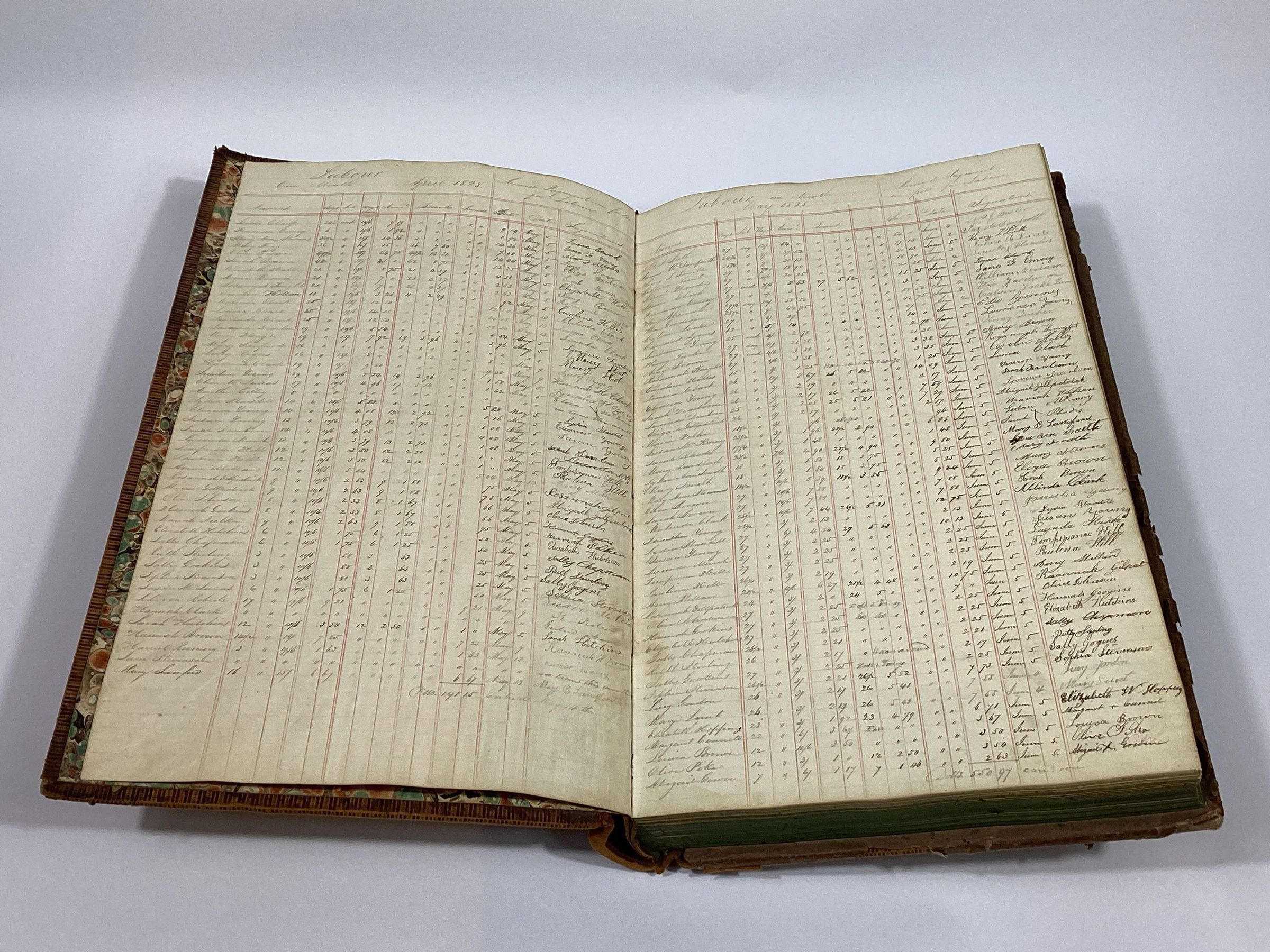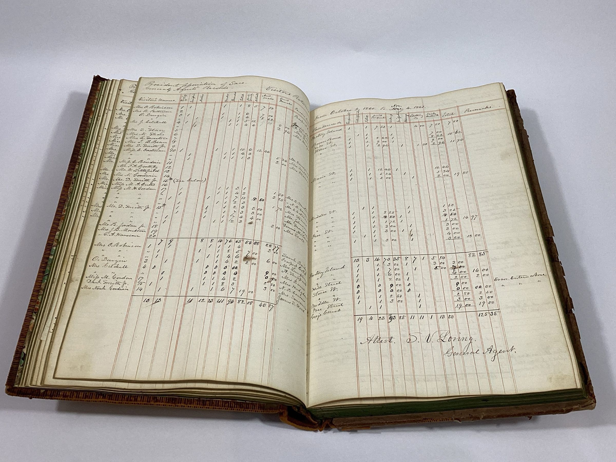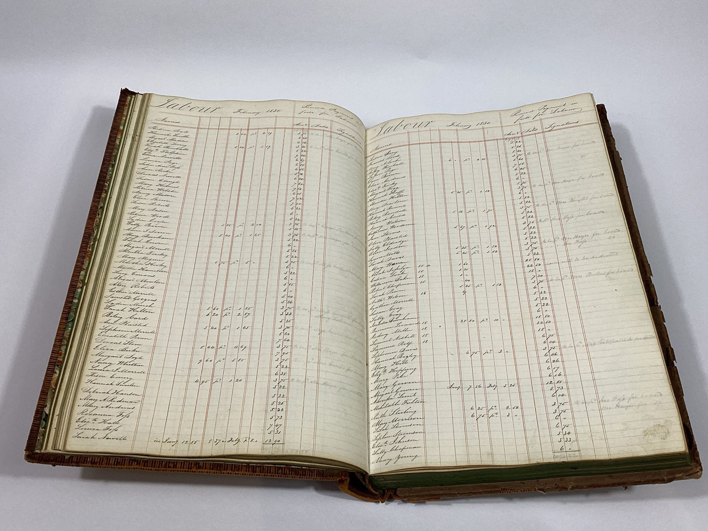 In 1826, a group of investors from Boston and Saco established the Saco Manufacturing Company, the first textile factory in Saco. The company built a seven-story wooden cotton mill, company boarding houses, and began construction on a canal from the head of the falls to the factory. Unfortunately, in February 1830, the factory and most of the workers’ housing was consumed by a disastrous fire. This ledger records the wage payments for the mill workers.