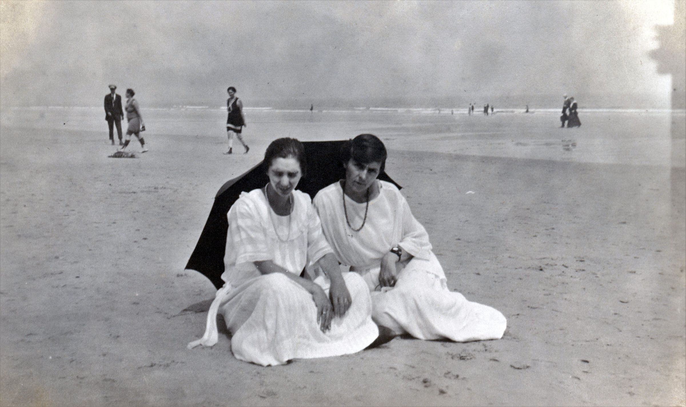 Photograph of two unidentified women on Old Orchard Beach. The woman on the left is wearing sunscreen on her face.
