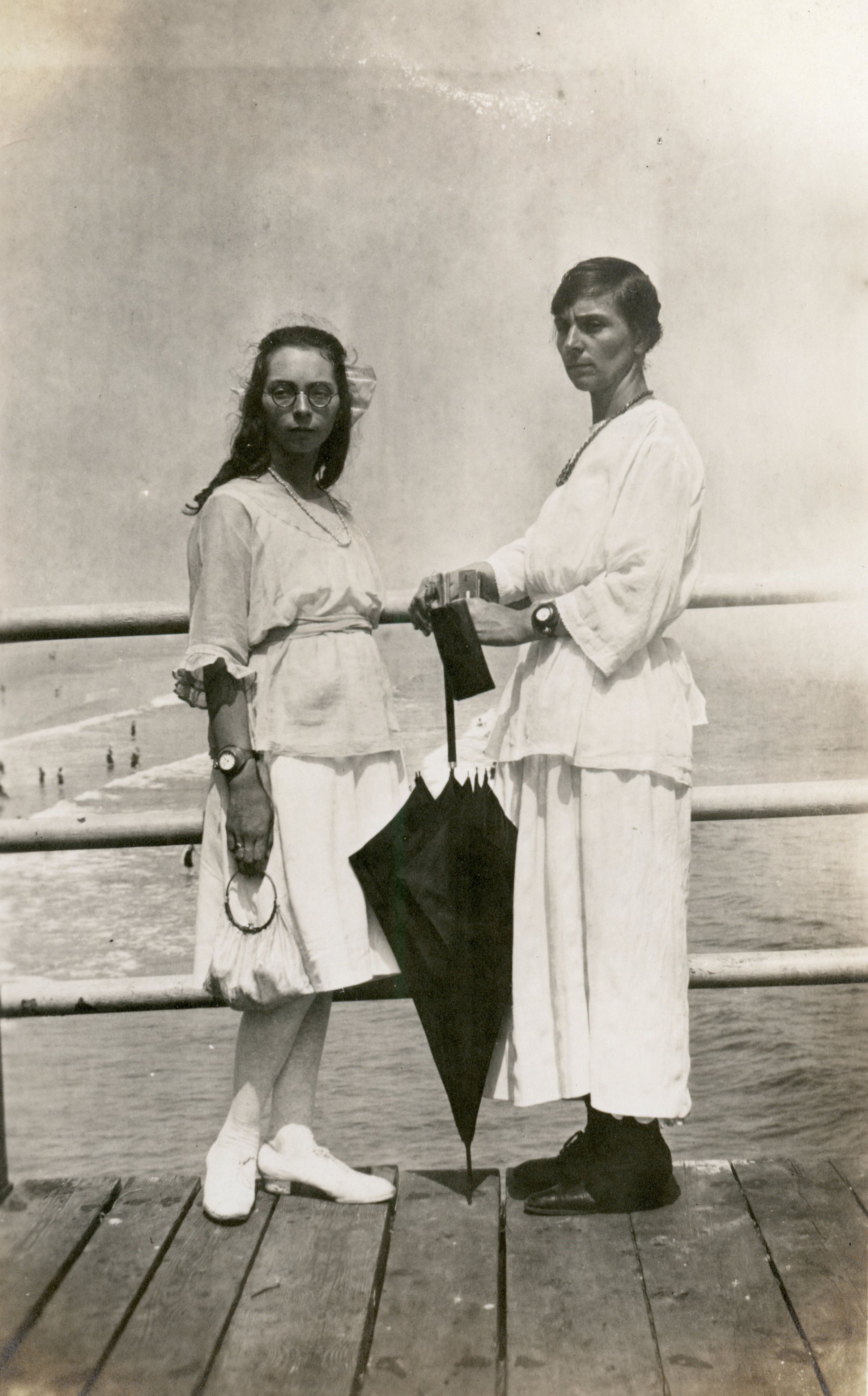 Photograph of two unidentified women standing on the Old Orchard Pier at Old Orchard Beach.