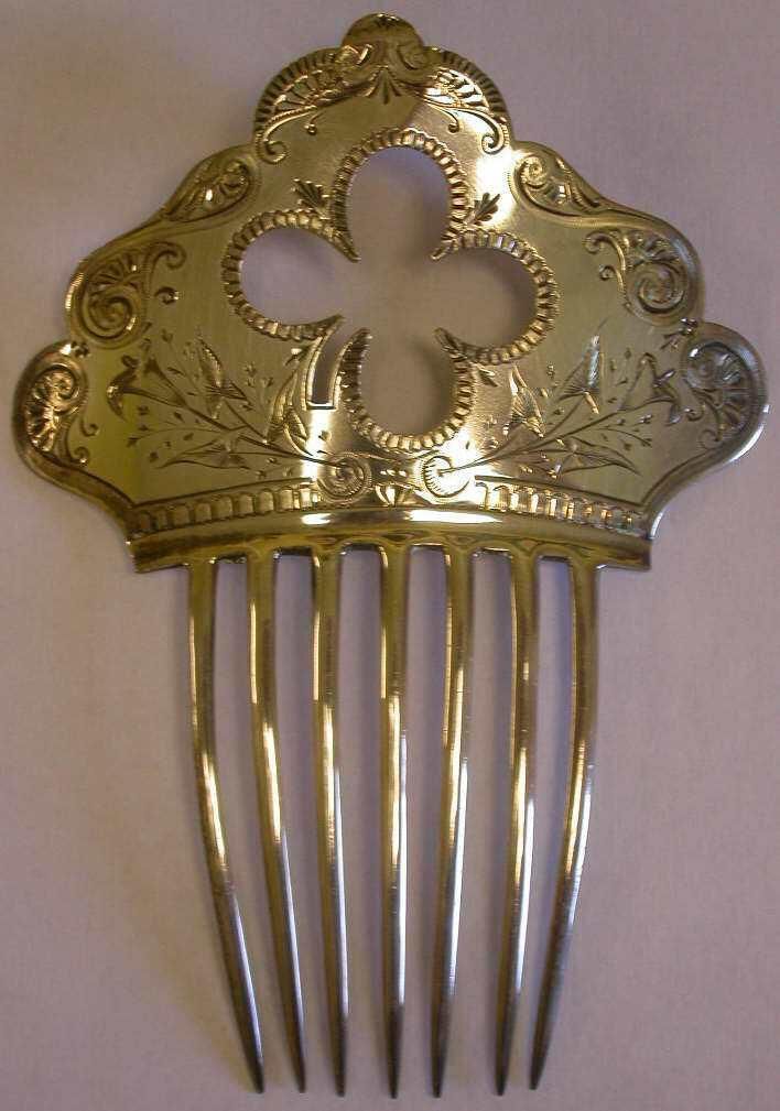 Sterling silver hair comb belonged to Kate Douglas Wiggin. Top section (3.75 X 2.50 inches high) is engraved with delicate design and cutout in center in shape of a shamrock. Seven teeth are 2 inches wide by 2.50 long. On the back is engraved A. Stowell Sterling. She wore it on many occasions. Once was while she was the guest of Alexandra College, Dublin, Ireland, during Queen Victoria's visit there in 1900. Also, in 1906 while visiting at the Vice Regal Lodge, Dublin, as the guest of Lord and Lady Aberdeen. The comb was given to Mrs. Simpson in 1924 by Miss Nora Archibald Smith following her sister's death on April 24, 1923 in England.Dimensions