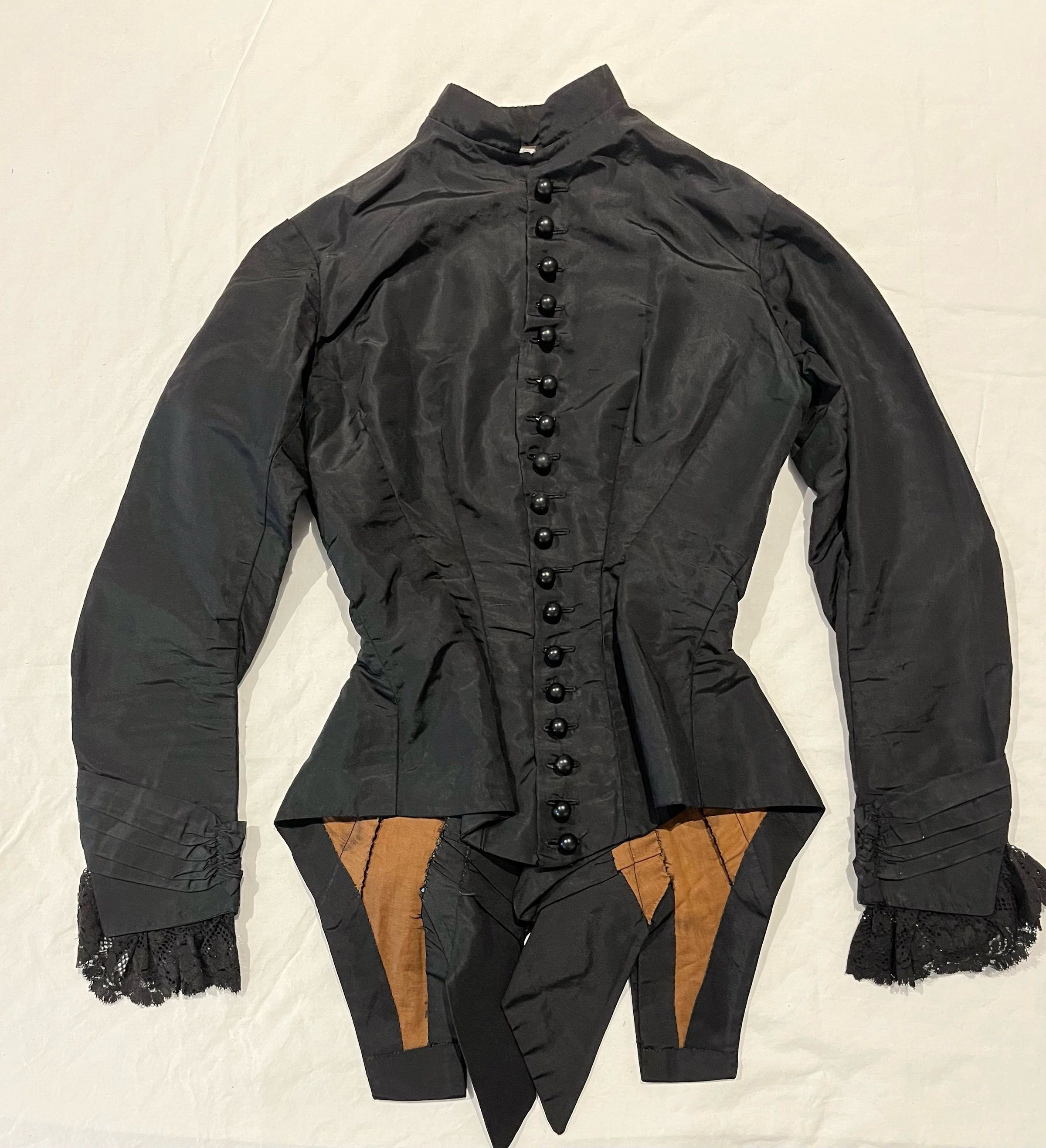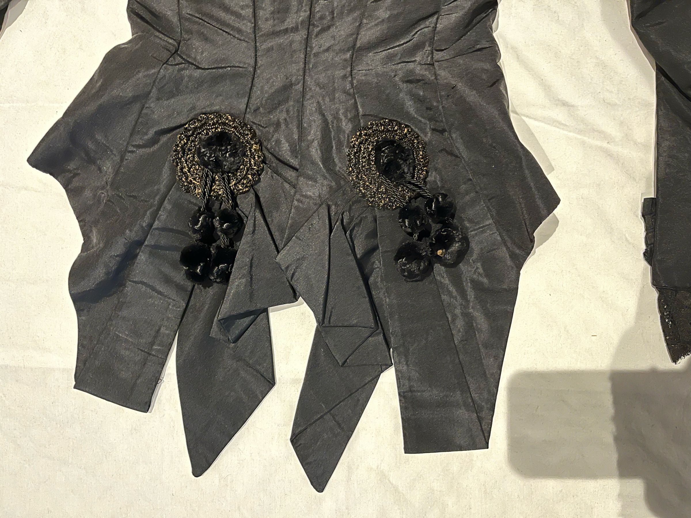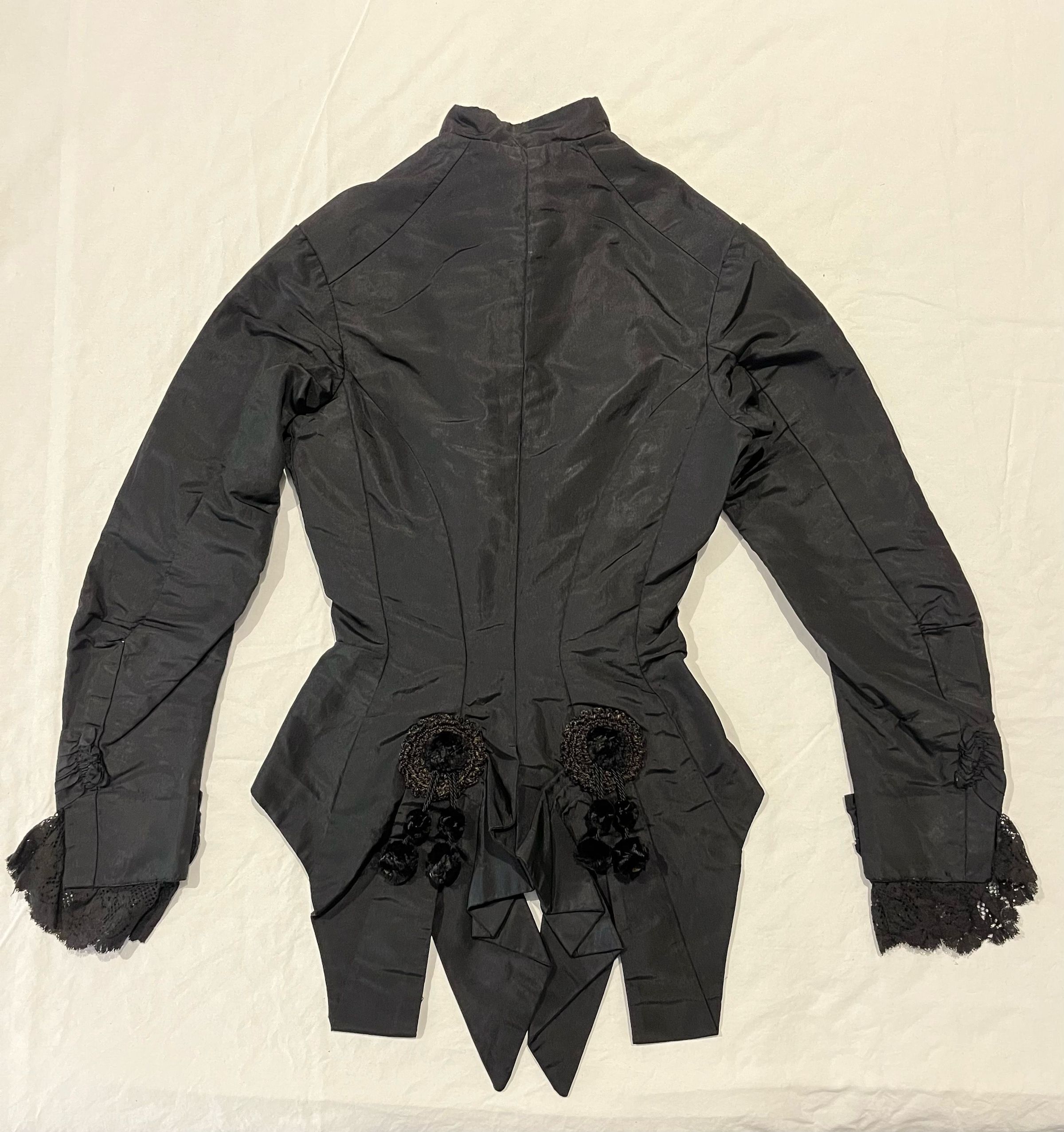 Black silk jacket. Closes down the front with 18 round ball buttons. Sewn on pleated fabric above the sleeve cuffs, which end with a ruffle of black lace. Back hem is longer and ends in two longer square tails with two smaller pointed tails in between. At the back waistline are two rosettes, each having two strings of pompoms, one large and one small, on each string.