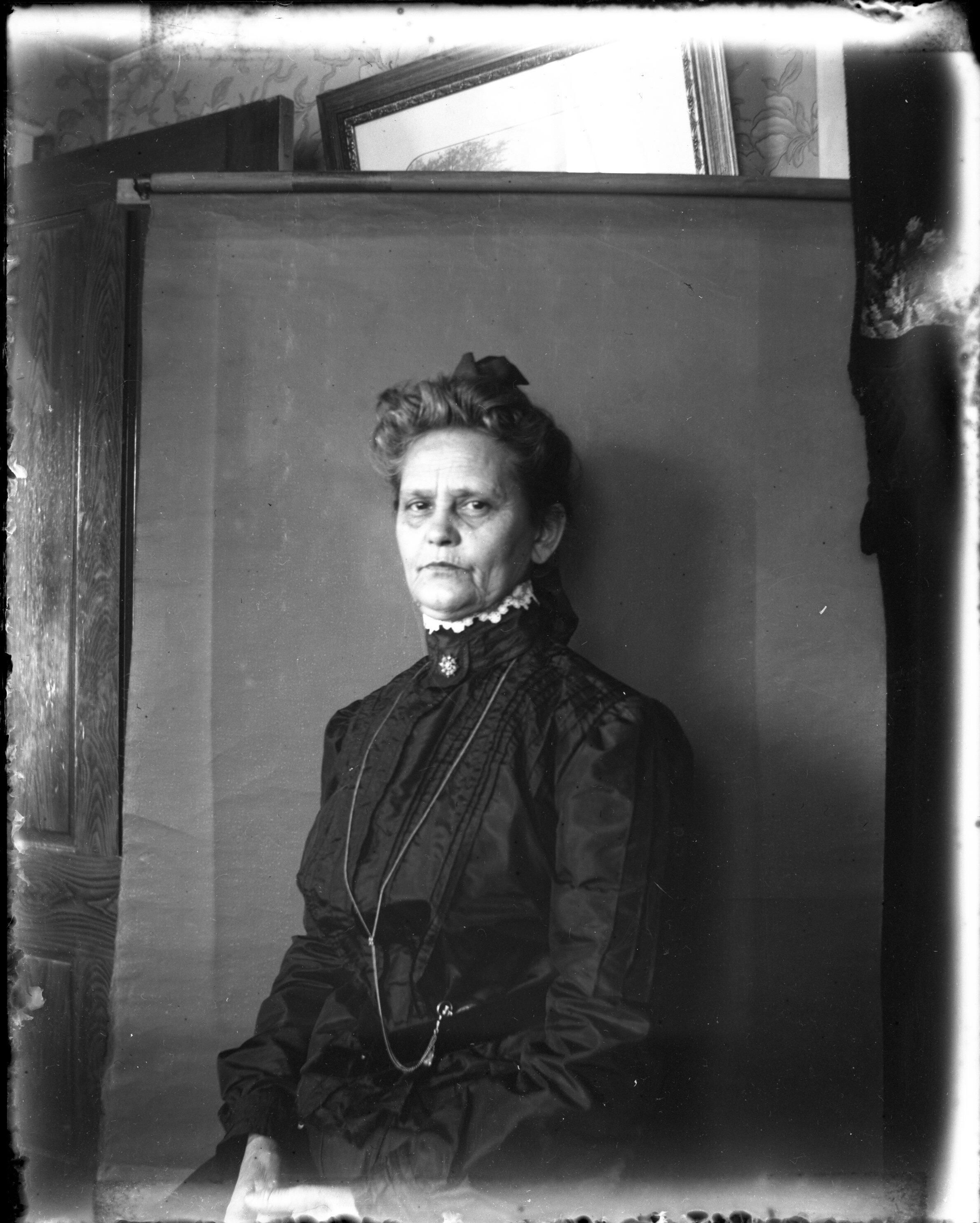 Glass plate negative photo of Sarah E. Lane Hobbs at her home at 31 Hill Street, Saco, circa 1907.