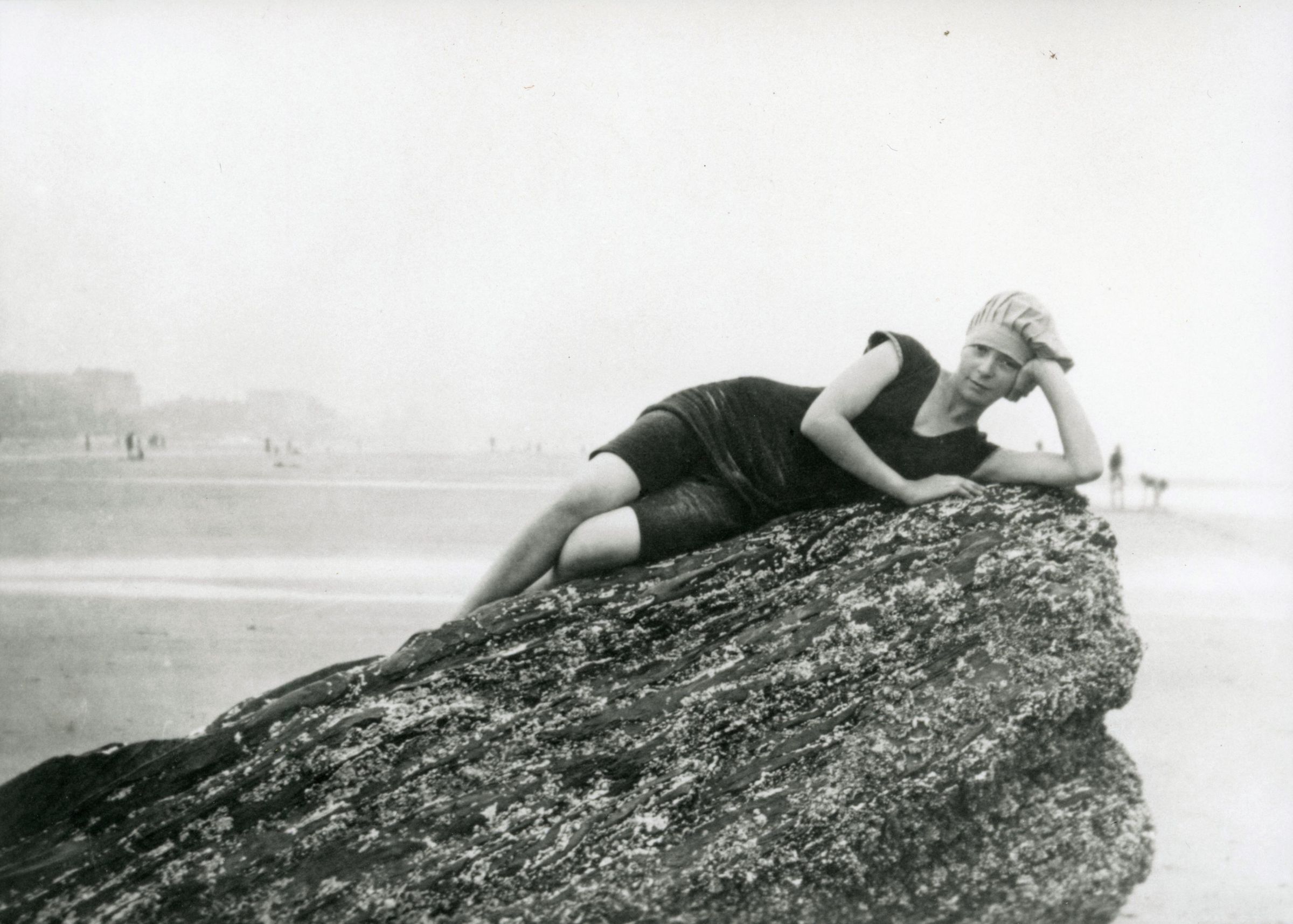Photograph of an unidentified woman lying on Googins Rocks at Old Orchard Beach.