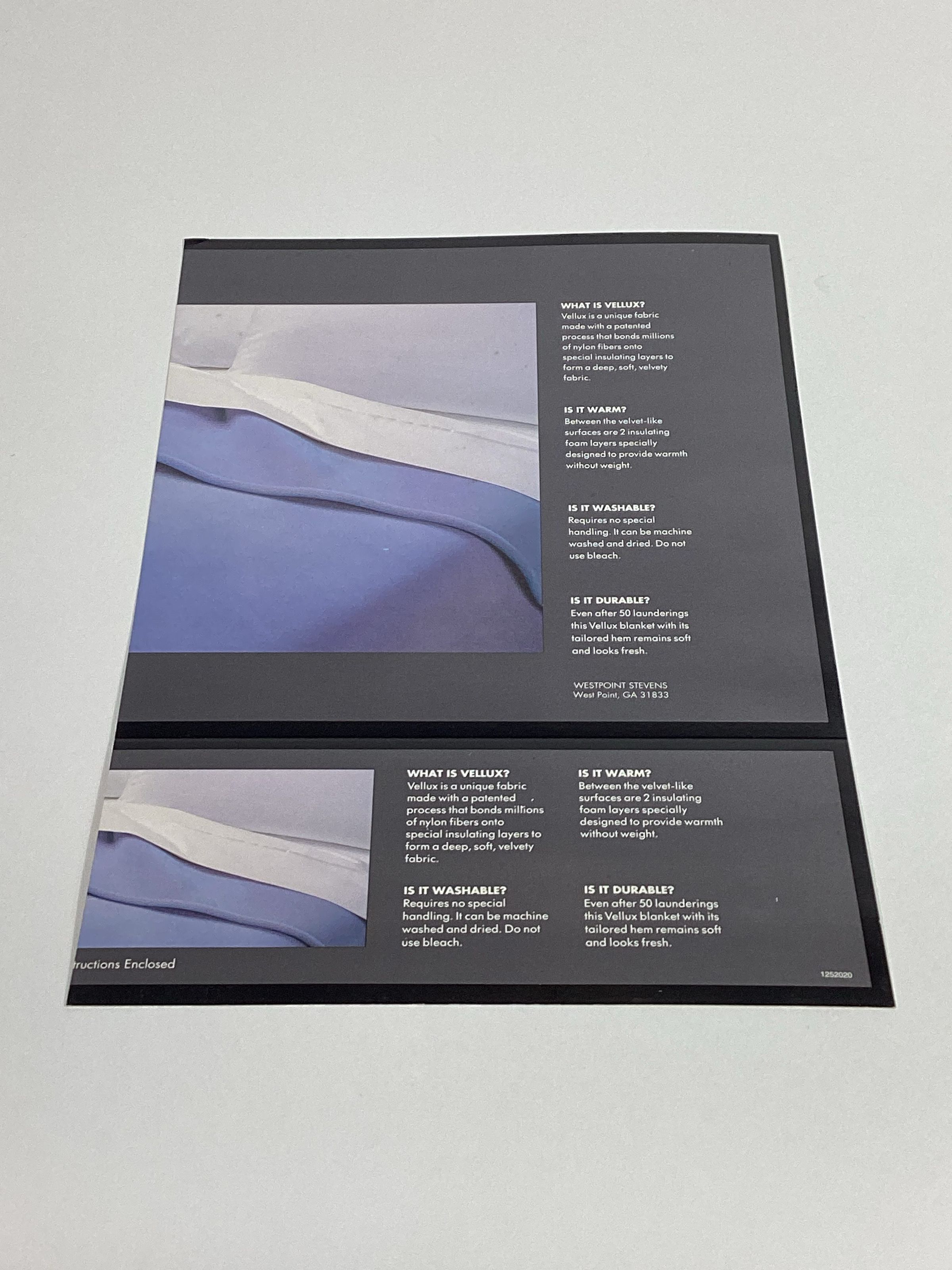 Vellux blanket package inserts marketed under the JCPenney Home Collection label. The blankets were manufactured by WestPoint Home in Biddeford, Maine.Made/Created
