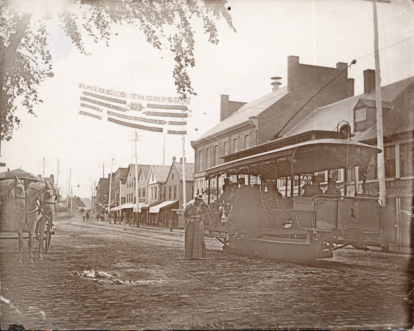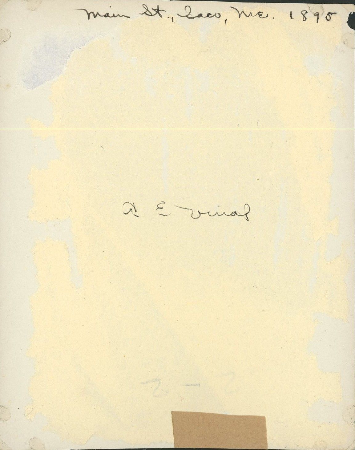Print photograph of Main Street in Saco, Maine taken in 1895. Banner captured in the photograph is for Paige & Thompson, a paint and decor store for houses. The photograph was taken by a member of the Stevens family, possibly owned at one point by A.E Vinal.Dimensions