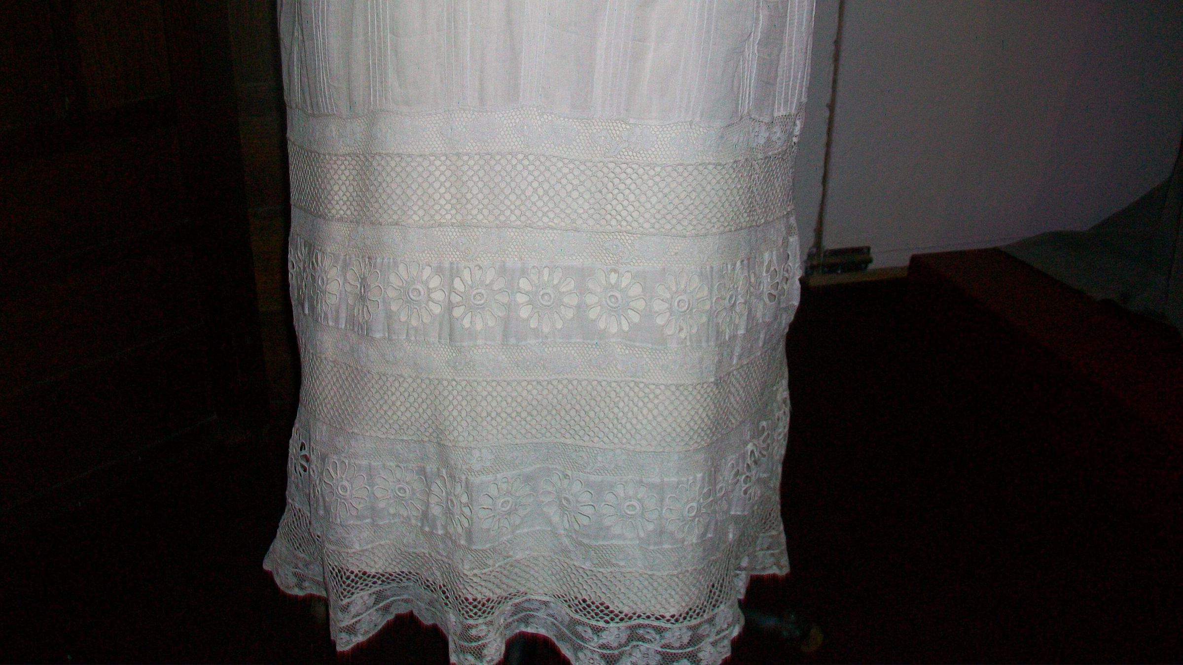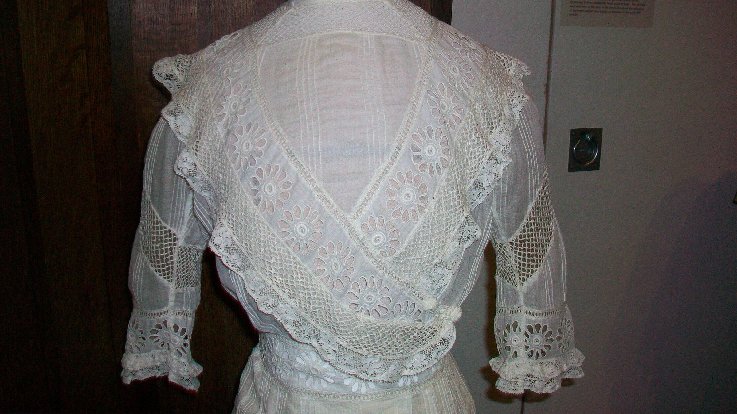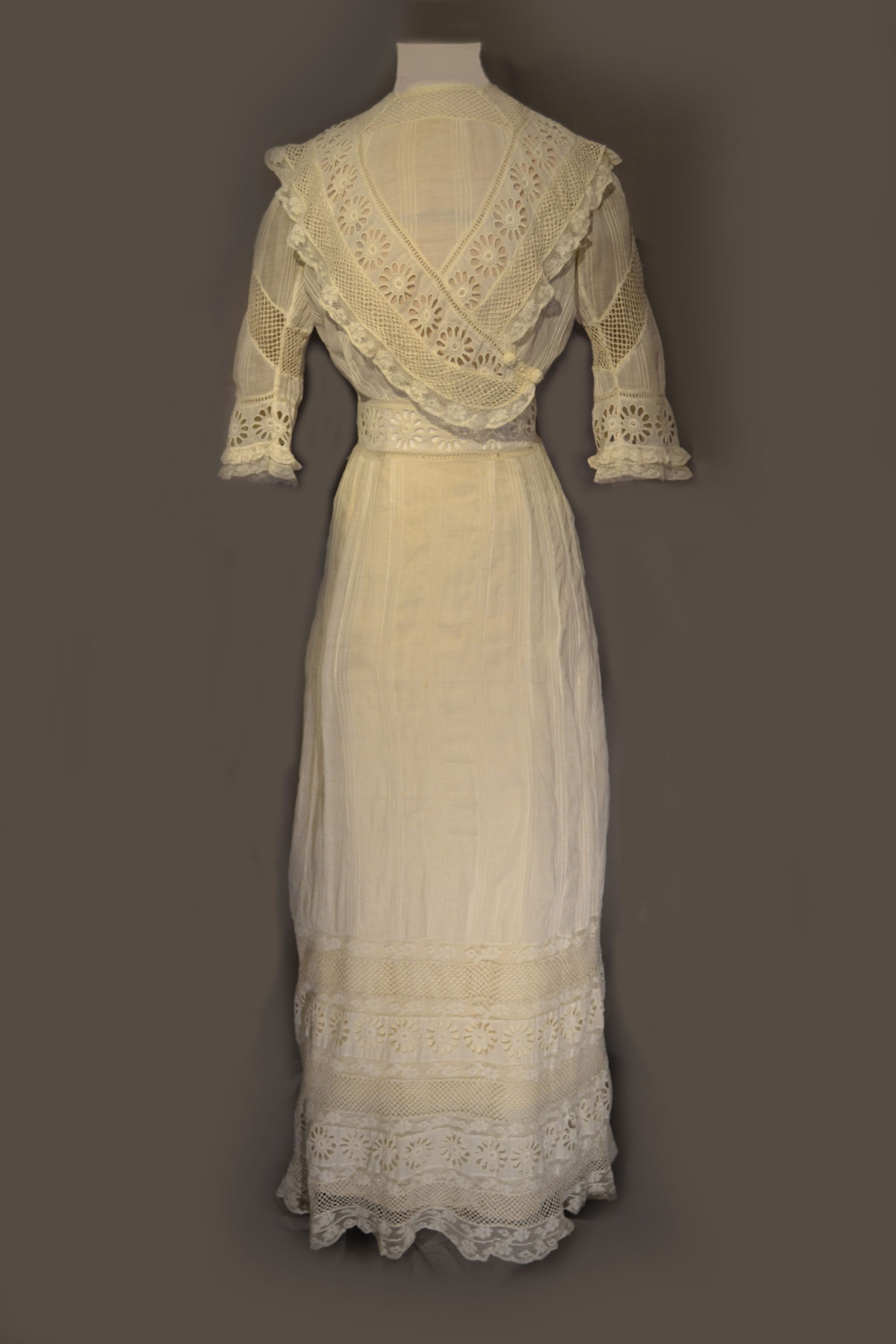 White cotton lawn dresses first became a staple of summer wardrobes around 1900; they continued to be stylish until about 1915. Trimmed with an array of ruffles, applique, lace inserts, and embroidery, they were covered with a wealth of decorative detail. However, they were also quite easy to make at home. Patterns were readily available, there was a wide variety of affordable machine-made lace on the market, and all that was required was a sewing machine, a nearly ubiquitous household appliance by this time, to put it all together. After the dress was stitched up, the lace trim was applied, the fabric underneath was cut away, and an elaborate-looking lace insertion was left behind. If this was too much trouble, or the necessary needle skills were lacking, it was always possible to simply order such a frock such as this from a mail order catalog. In the early 1900s, Sears and Roebuck offered a variety of white lace-trimmed summer dresses in a range of affordable prices ($5-$11).