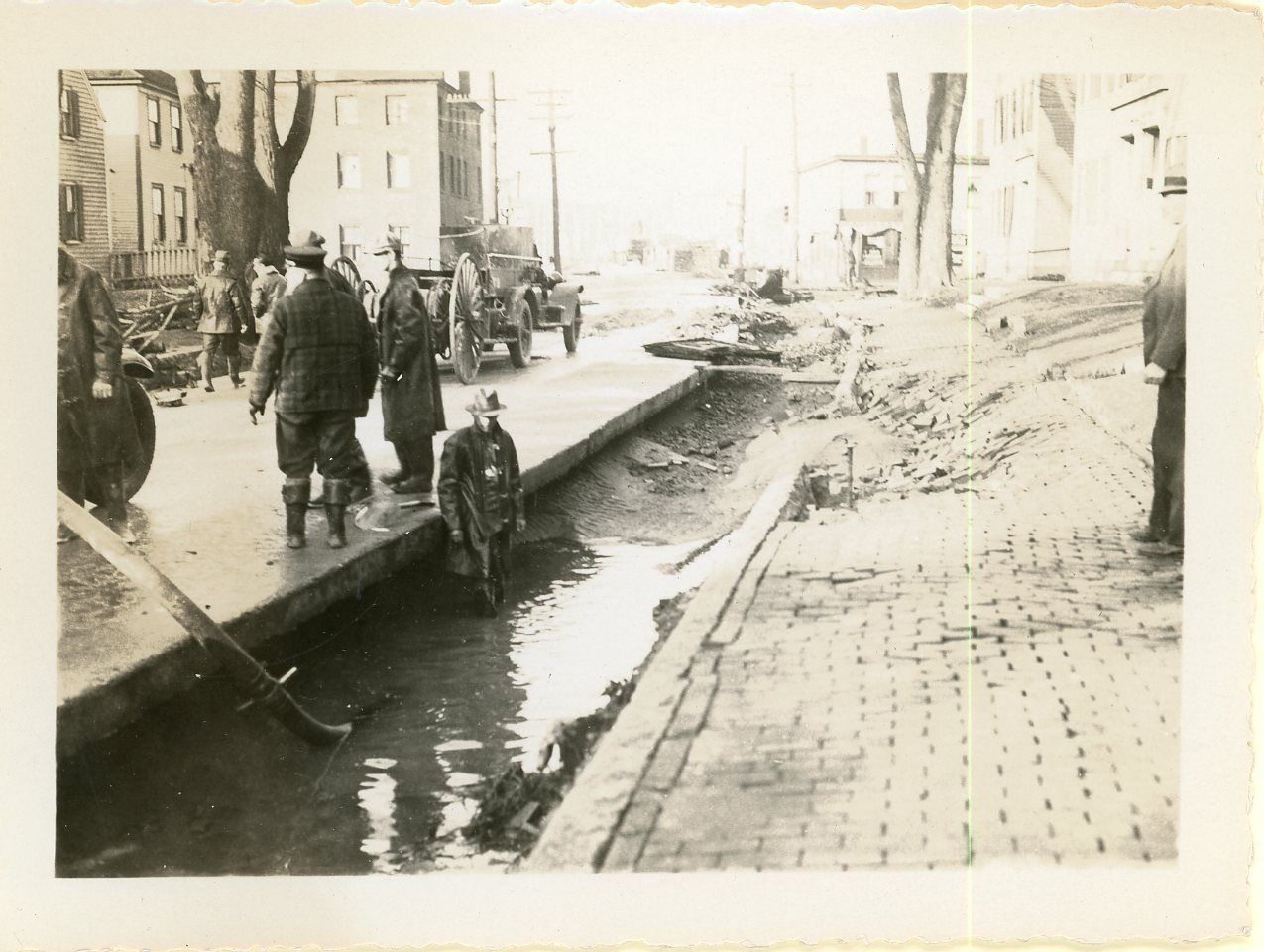 Black and white print photograph of firefighters draining Saco River flood water from street. From the Sawyer House Collection.