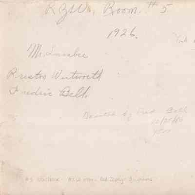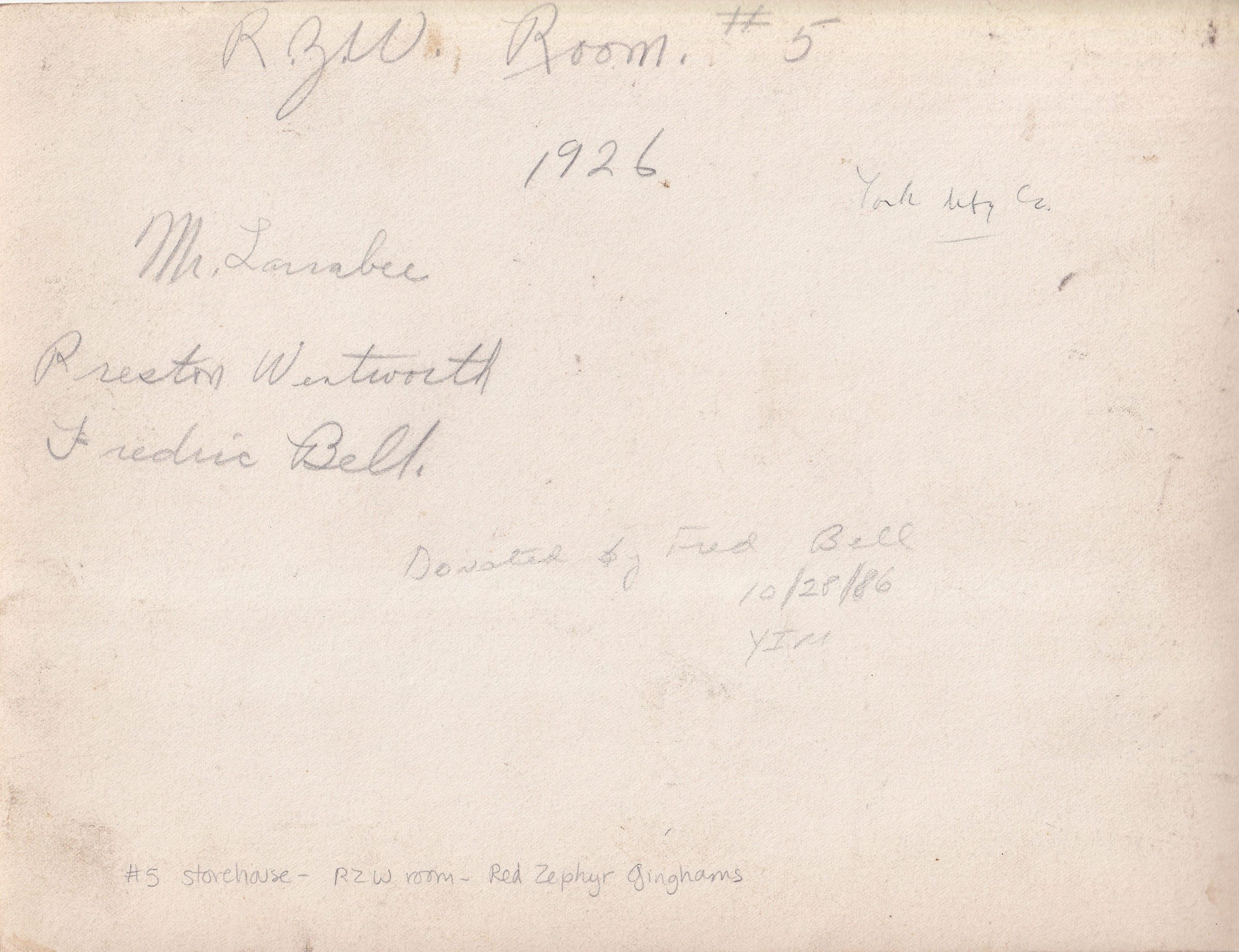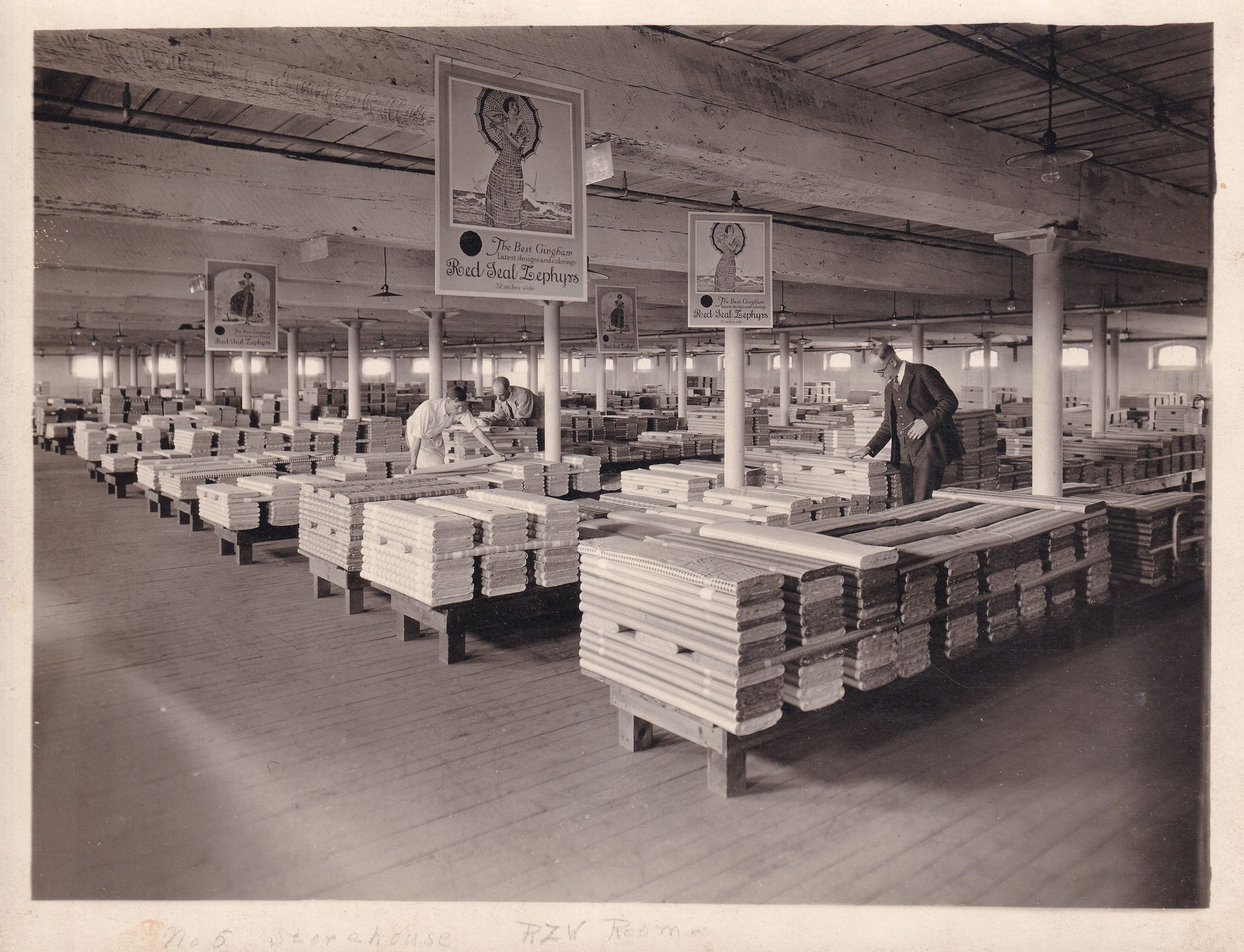 Room in Storehouse Number 5 full of bolts of Red Zephyr Gingham fabric. The three people in the photograph are Mr. Larabee, Preston Wentworth, and Frederic Bell.