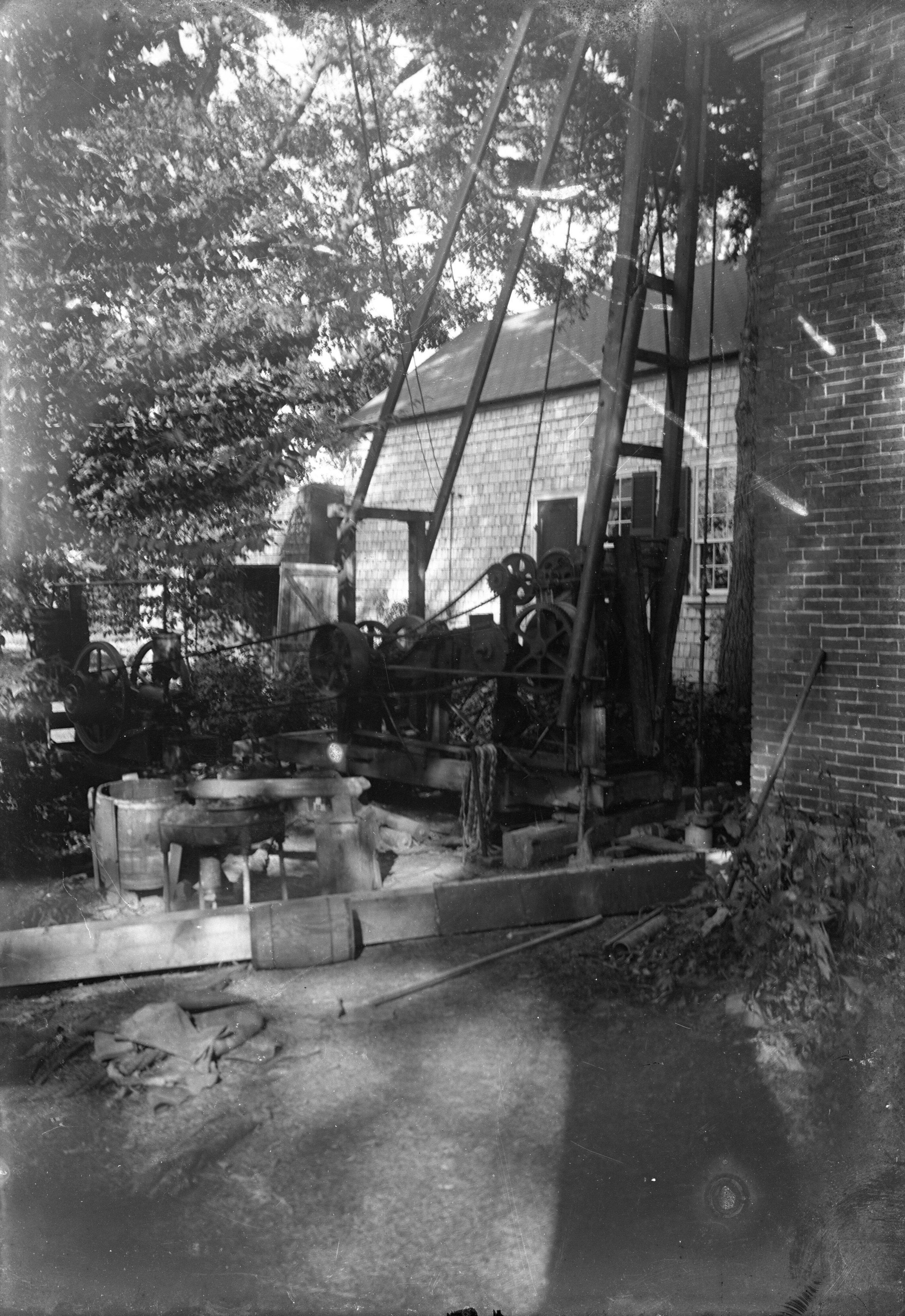 Glass plate negative photo of a well being drilled at the Bradbury property in Hollis, ME.