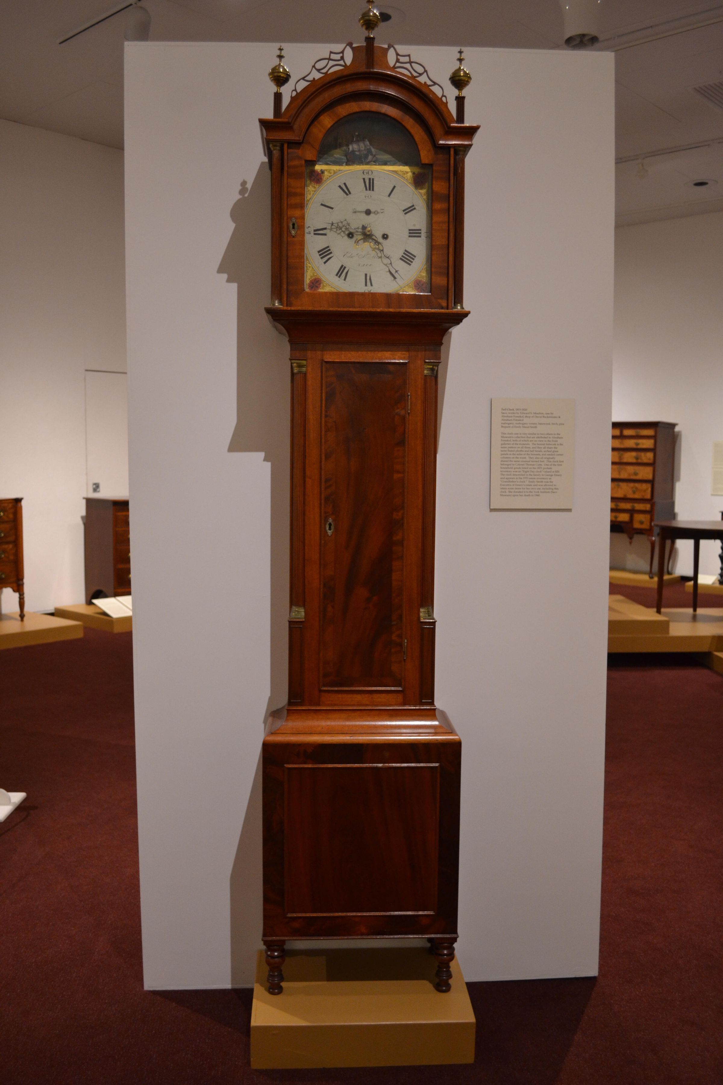 This clock case is very similar to two others in the Museum's collection that are attributed to Abraham Forsskol, both of which are on view in the front galleries of the museum. The bonnet fretwork is the same pattern on all three, and they all share the same fluted plinths and ball finials, arched glass panels in the sides of the bonnets, and reeded corner columns on the waist. They also all originally shared the same unusual turned feet. This clock first belonged to Colonel Thomas Cutts. One of the first household goods listed on his 1821 probate inventory was an "Eight Day clock" valued at $20. The clock descended in the family to George Emery and appears in his 1933 estate inventory as “Grandfather’s clock.” Emily Smith was the Executrix of Emery's estate and was allowed to retain some items for her own use, including this clock. She donated it to the York Institute (Saco Museum) upon her death in 1960.