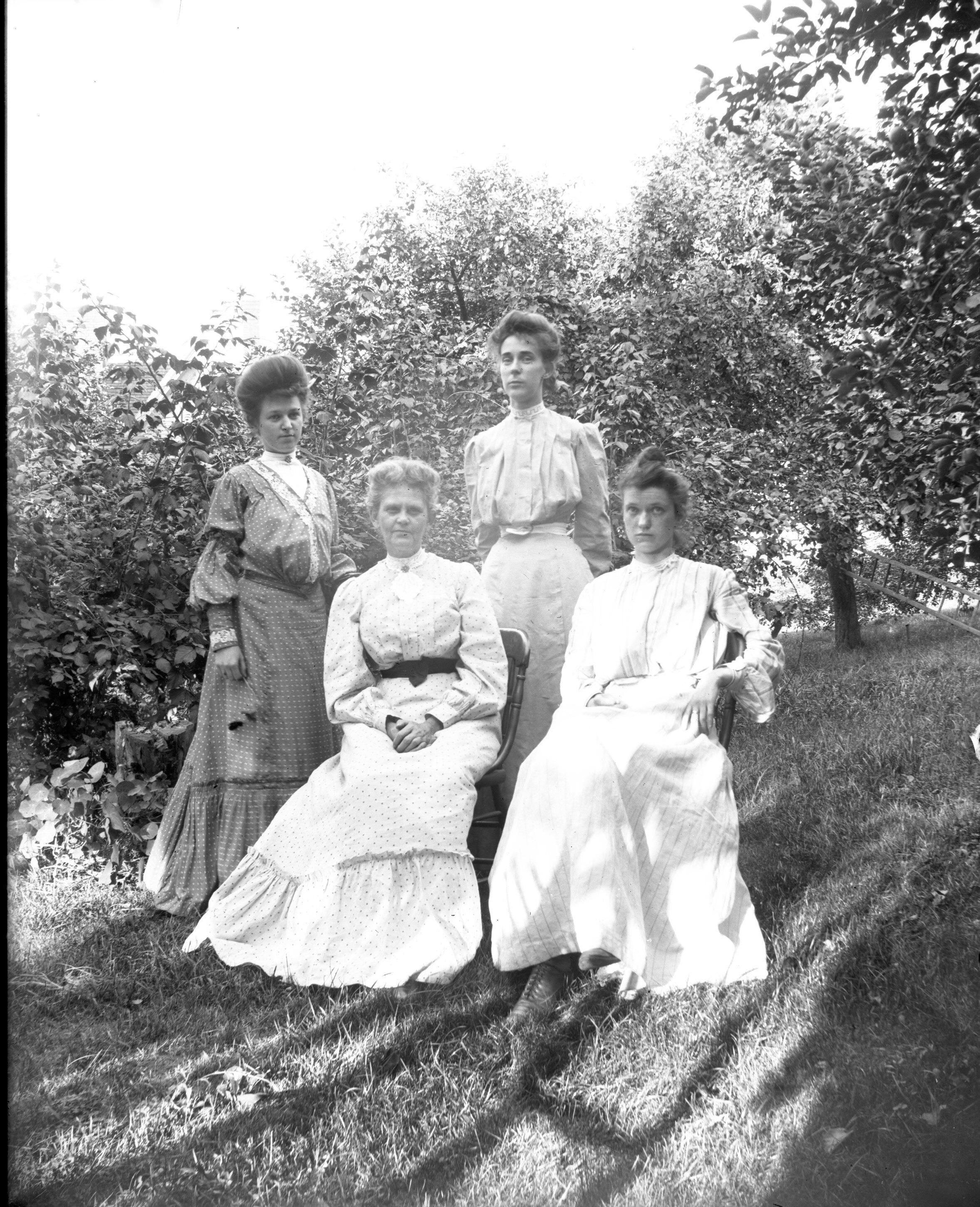 Glass plate negative photo of (from left to right) Eunice Amanda Hobbs Staples, Sarah E. Lane Hobbs, Cora Ethyl Young Hobbs and Lewie Francis Young - at Sarah's home on Hill Street, Saco. About 1910.