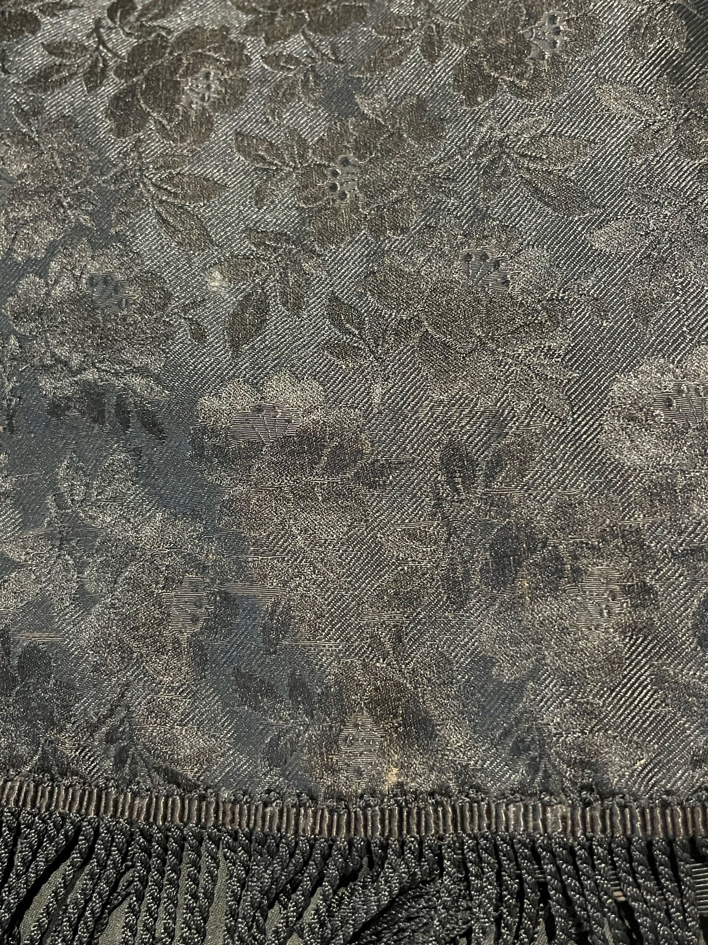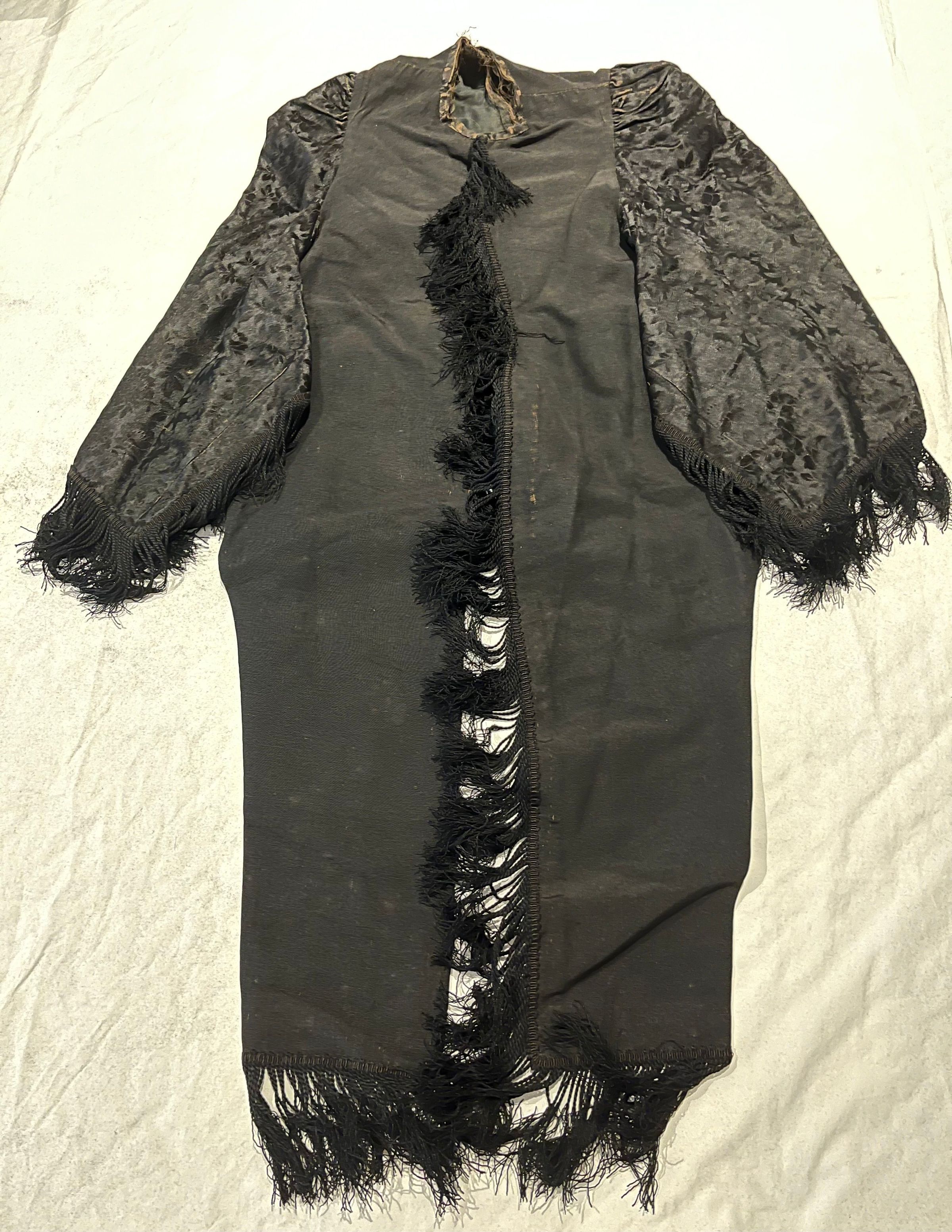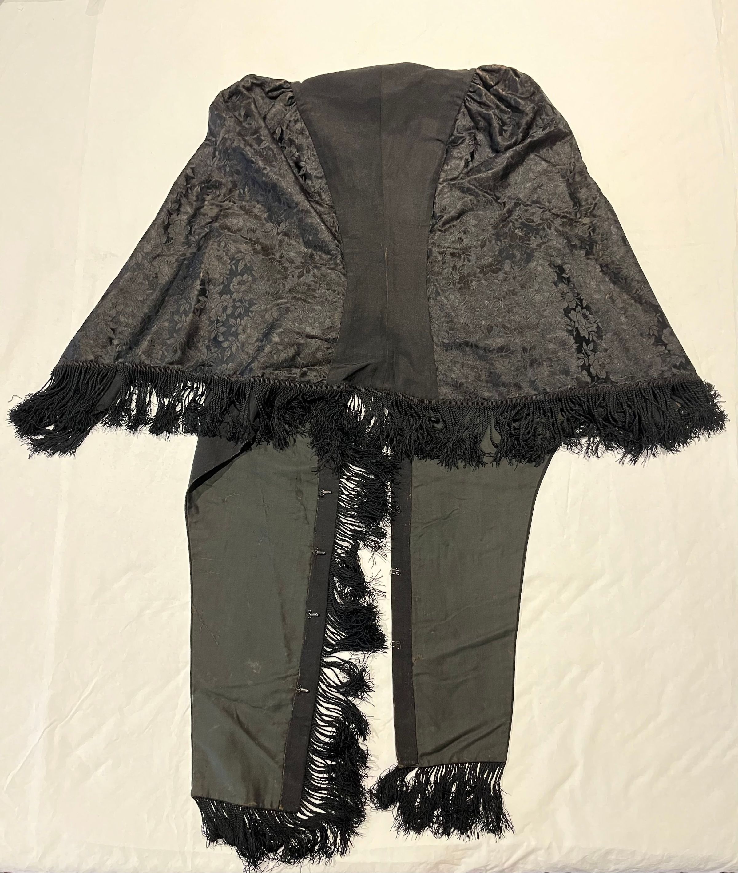 Mantle of ribbed black silk with black silk damask trimmed with 4" long black fringe. The neck opening has no collar and is trimmed with a fairly narrow band of black silk ribbon, now mostly frayed. The body of the garment is constructed of a black ribbed silk fabric. Long lappets in the front extend well past the waistline. They close with a series of 12 large hooks and eyes, with the edge of the left lappet on top; this long edge is trimmed with black fringe, as are the bottoms of both lappets. The sleeves are gathered at the shoulder and are very full to accommodate the large puffed sleeves that were fashionable circa 1890. The back is of the black silk ribbed fabric, with the black damask extending beyond the shoulder area on the sides.Dimensions
