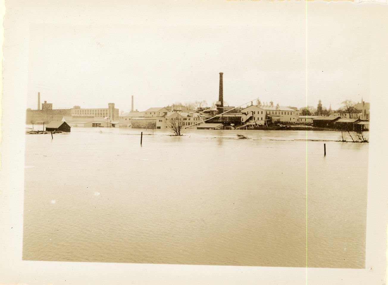 Black and white print photograph of Saco River flooding, with the Saco-Lowell Shop in the background. From the Sawyer House Collection.
