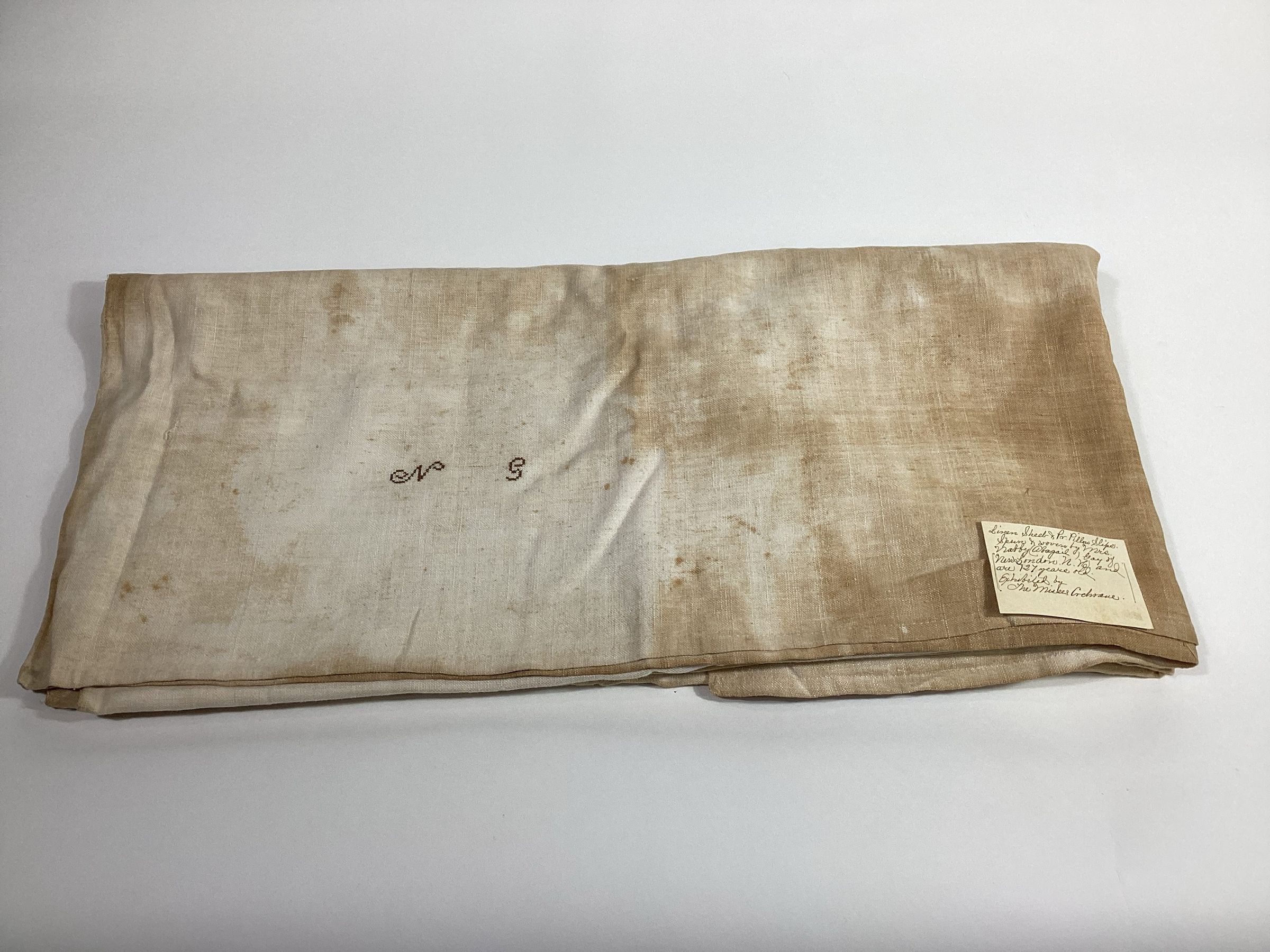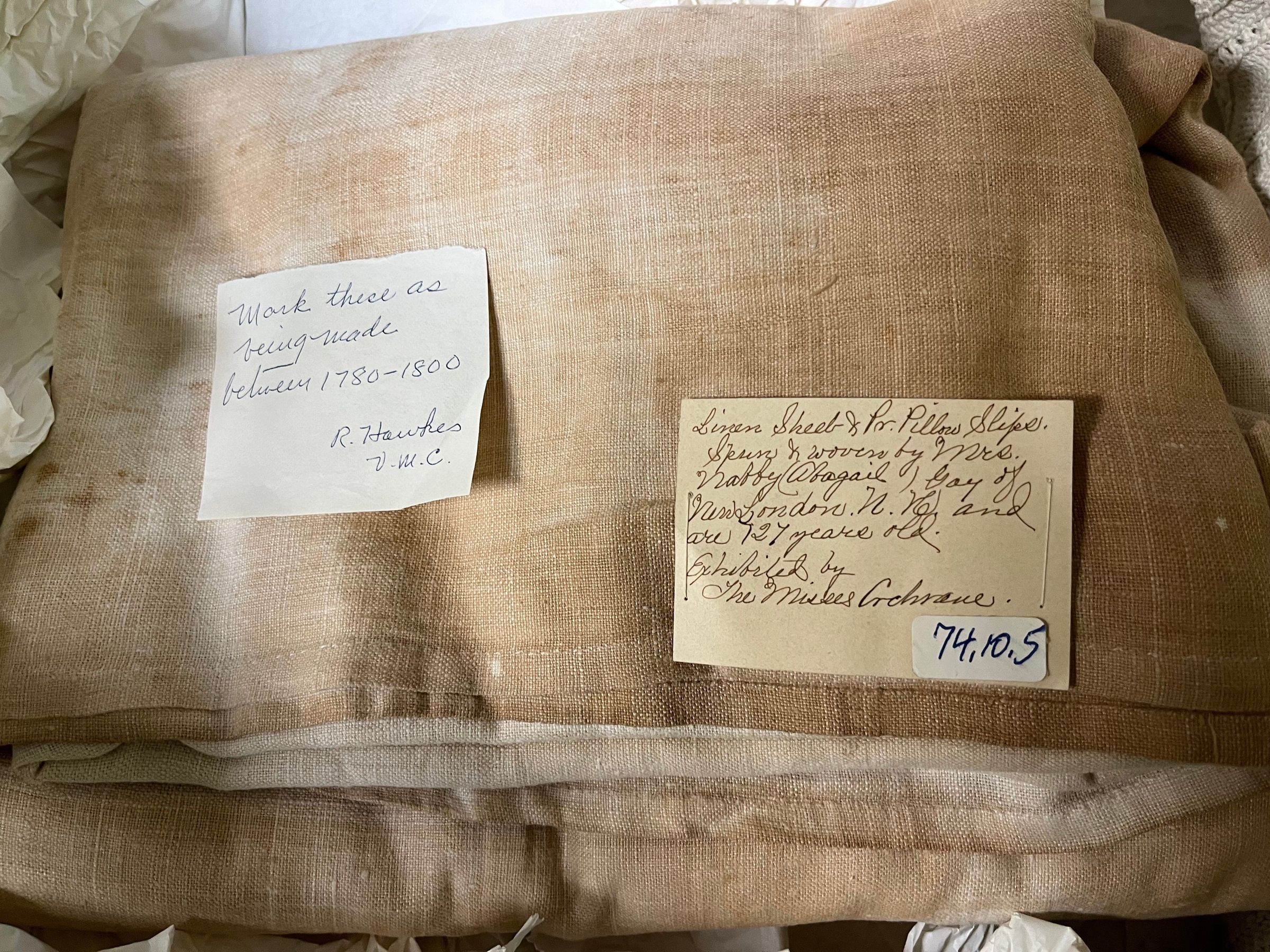 The linen sheet and pair of pillowcases were said to have been spun and woven by Nabby Gay of New London, New Hampshire who married William Gay in the early 1790s. The sheet and pillowcases were woven in a simple plain weave and finished by hand. While she used “N G” to mark the sheet and pillowcases, there is no number for the purposes of rotation.