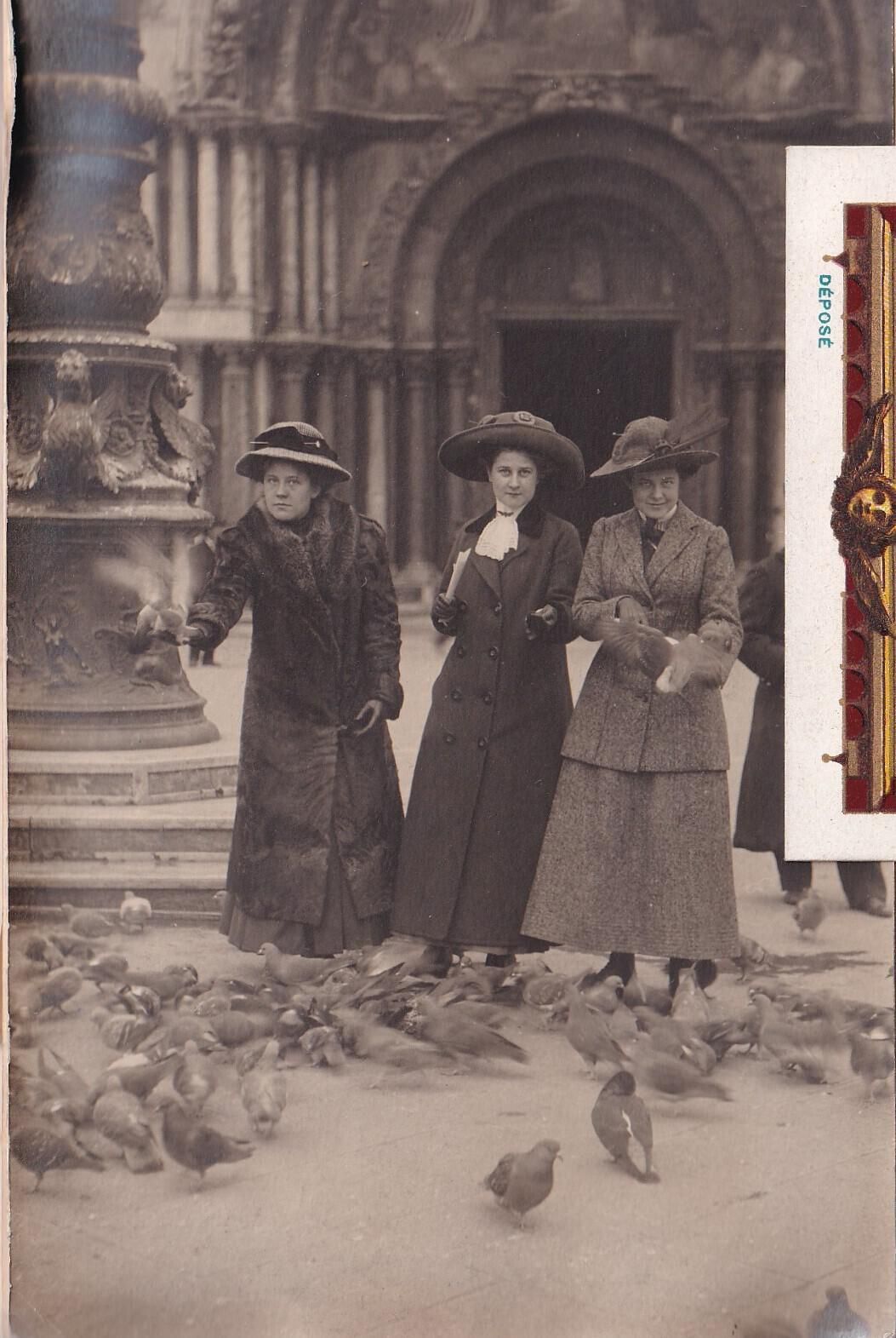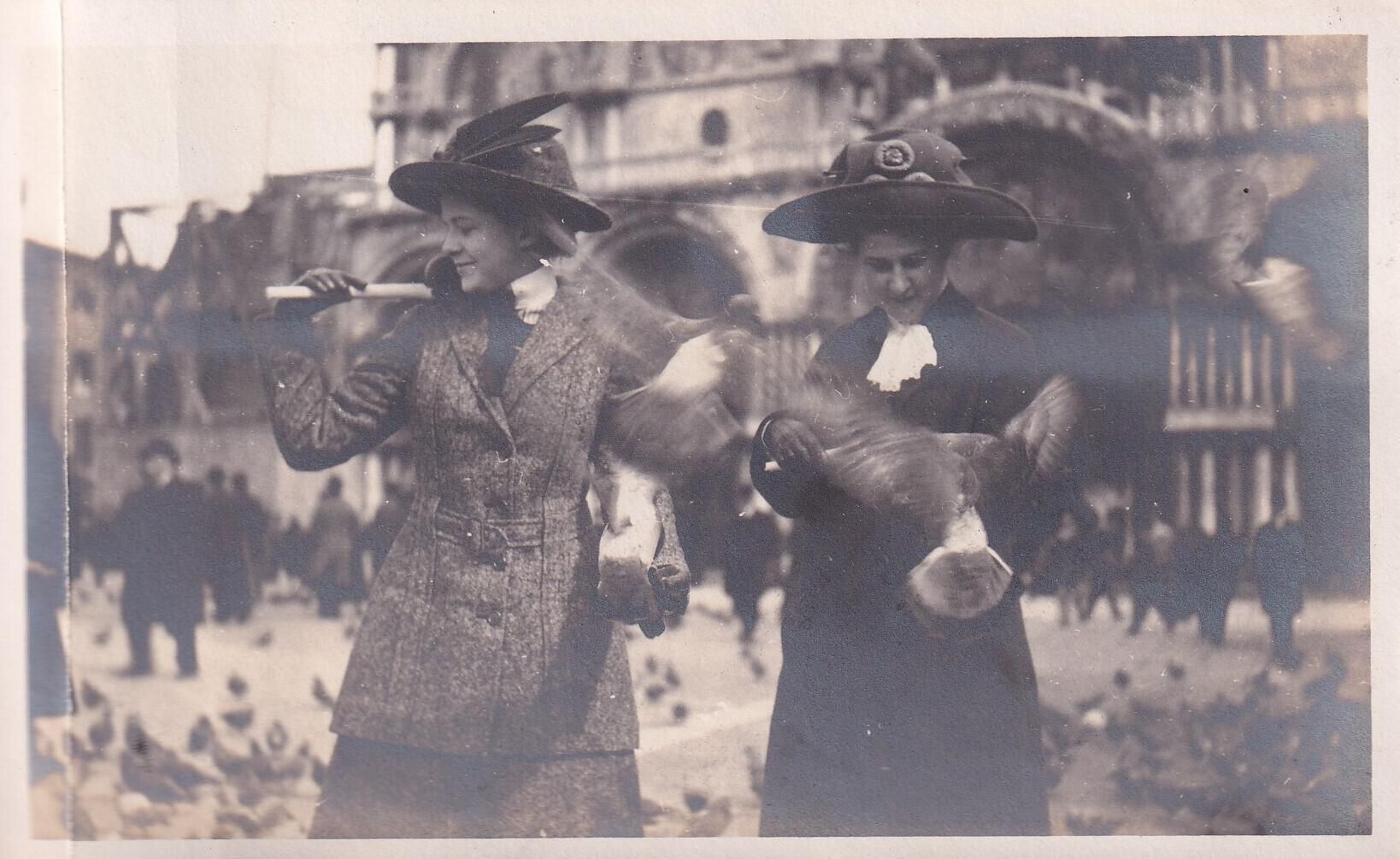 Two of the party feeding pigeons in Piazza San Marco, Venice.