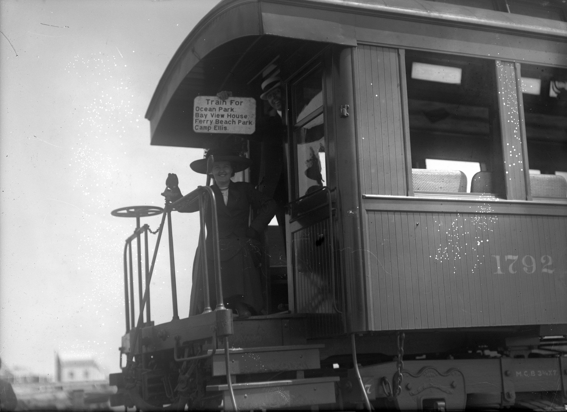 Glass plate negative photo of a woman standing at the back of the Dummy Railroad train that ran along Saco Bay. A man is holding up a sign showing the station stops, which includes Ocean Park, Bay View House, Ferry Beach Park and Camp Ellis.