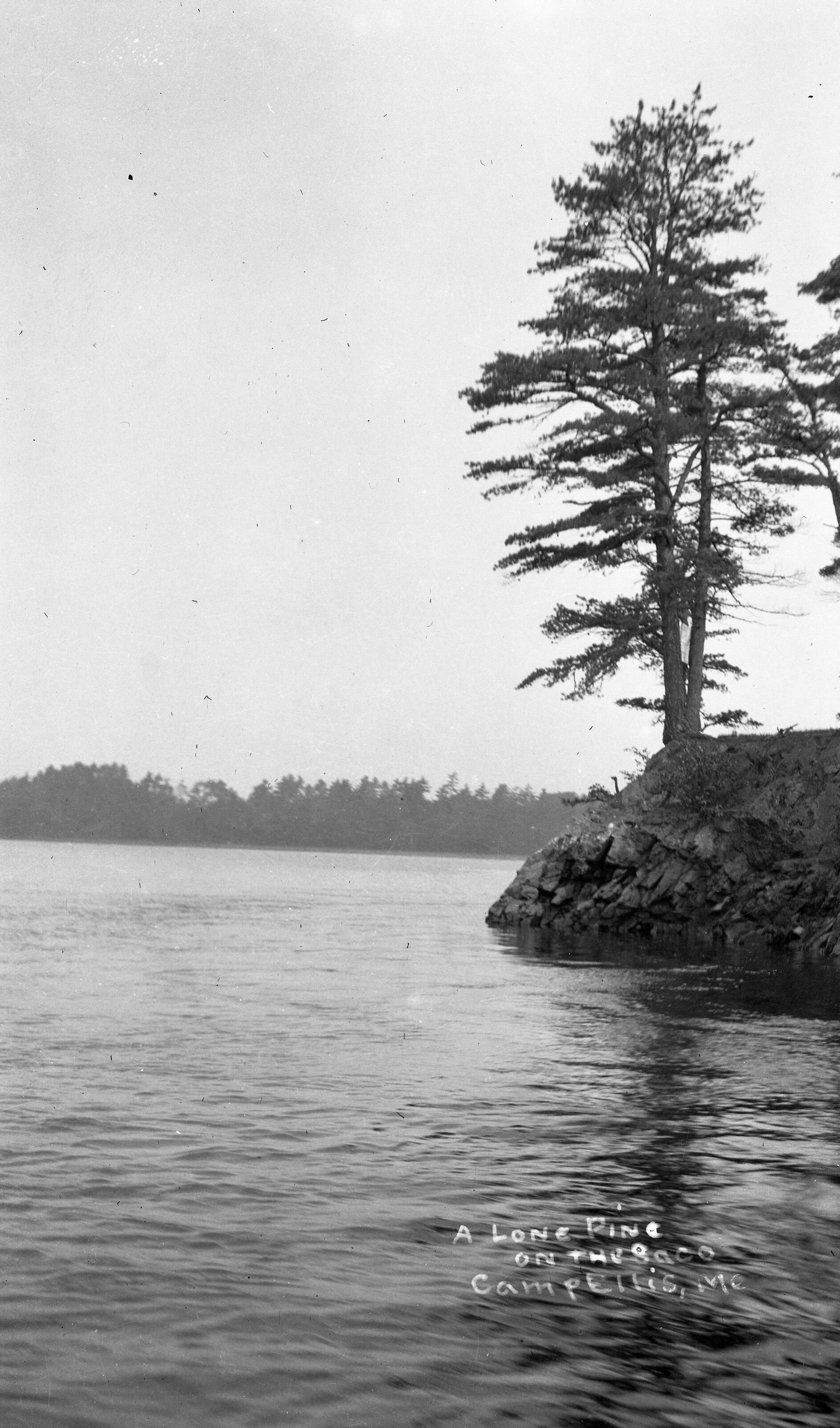 Negative print photo of a pine tree on the shore of the Saco River at Camp Ellis, ME.Made/Created