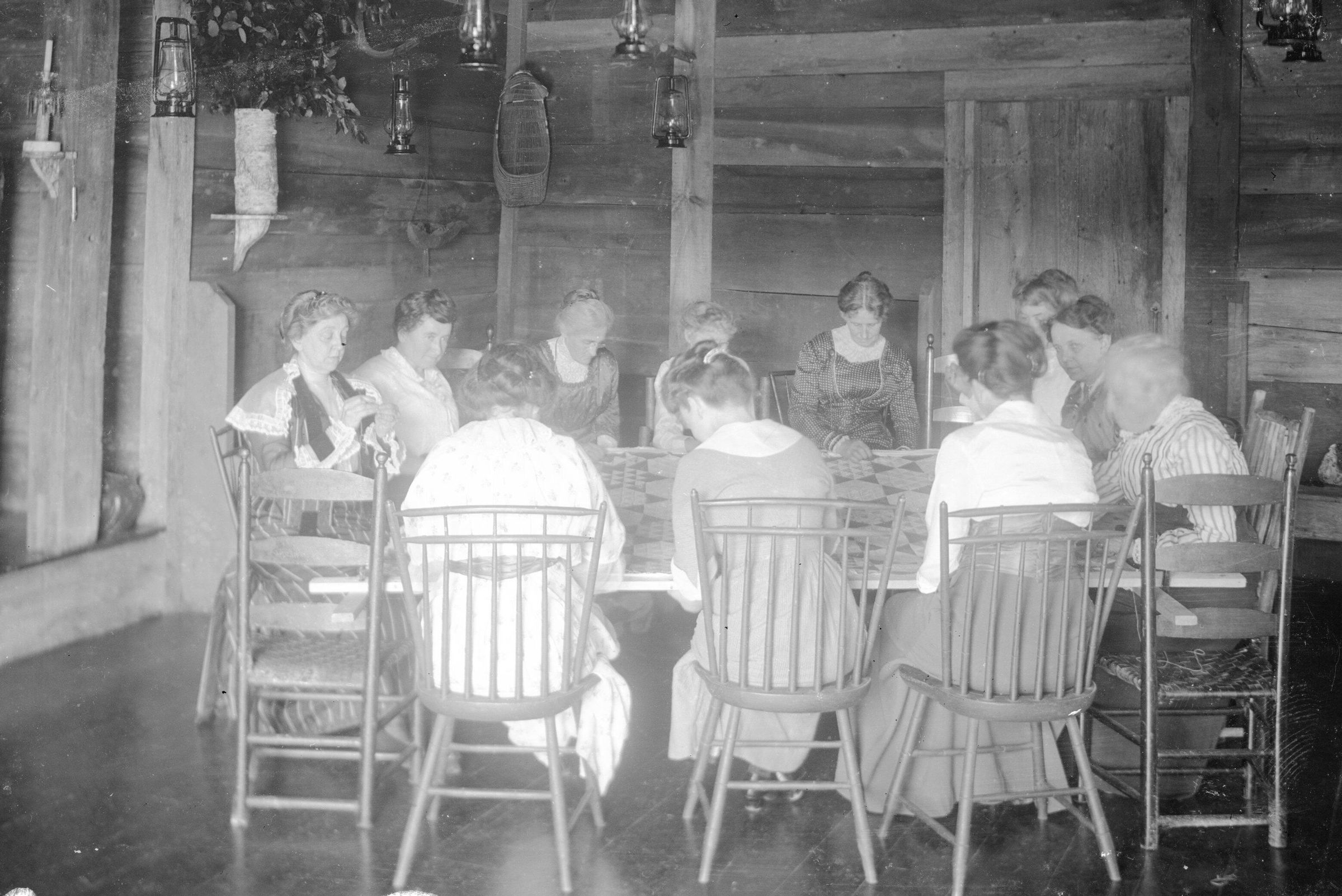 Glass plate negative photo of the cast of The Old Peabody Pew, a play written by Kate Douglas Wiggin, dressed in period costume working on a quilt. This photo was taken at Kate Douglas Wiggin's barn at her "Quillcote" house in Hollis, ME. In the story of the play, the women of the Dorcas Society take it upon themselves to renovate their church by Christmas when community funds are lacking. Included in their tasks is to create their own upholstery, drapery and other materials. Perhaps this is a promotional photo, since it is unlikely the play was performed at the barn. A section of postcard is attached to the back of the plate with "1930" written in pencil.Made/Created
