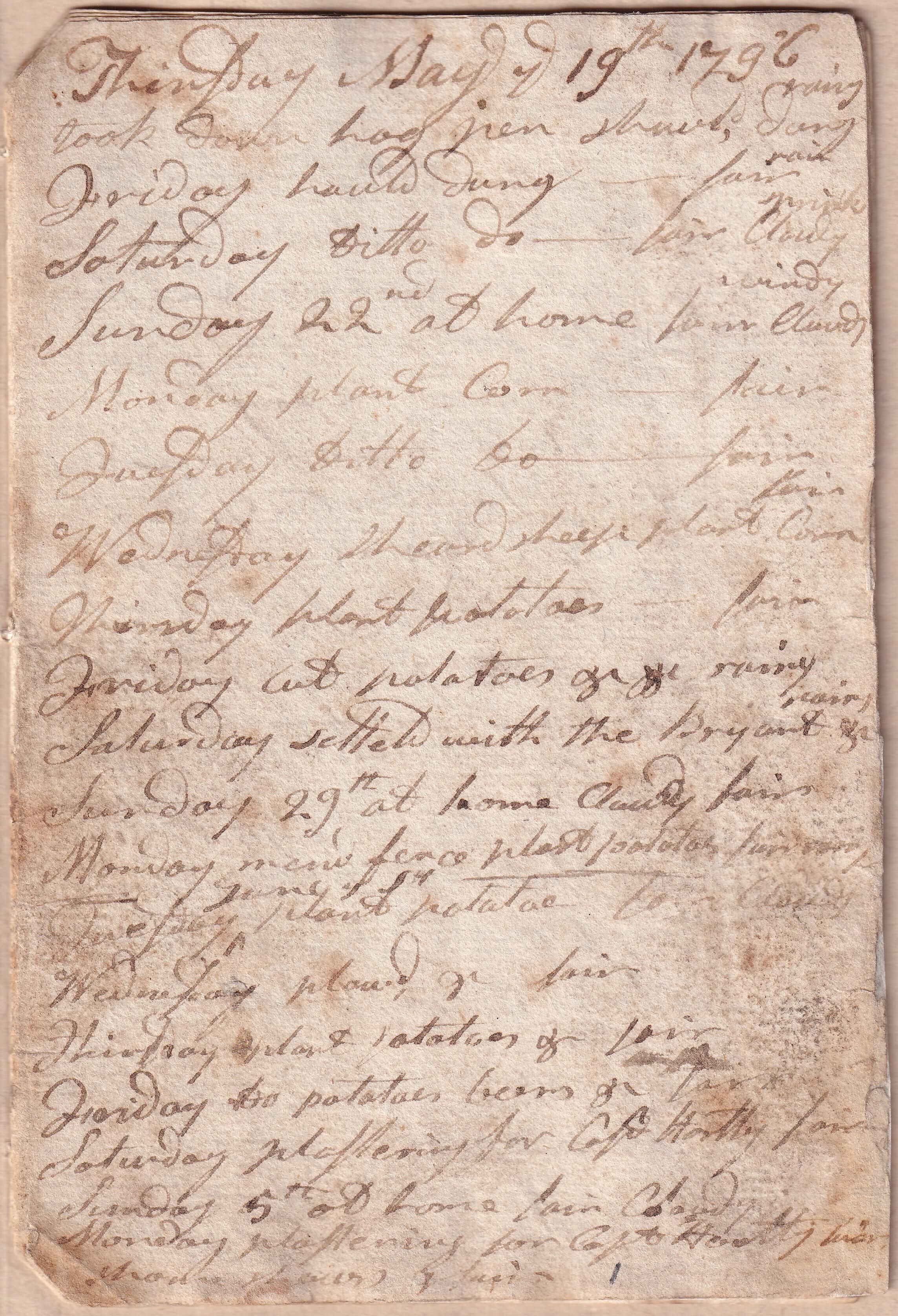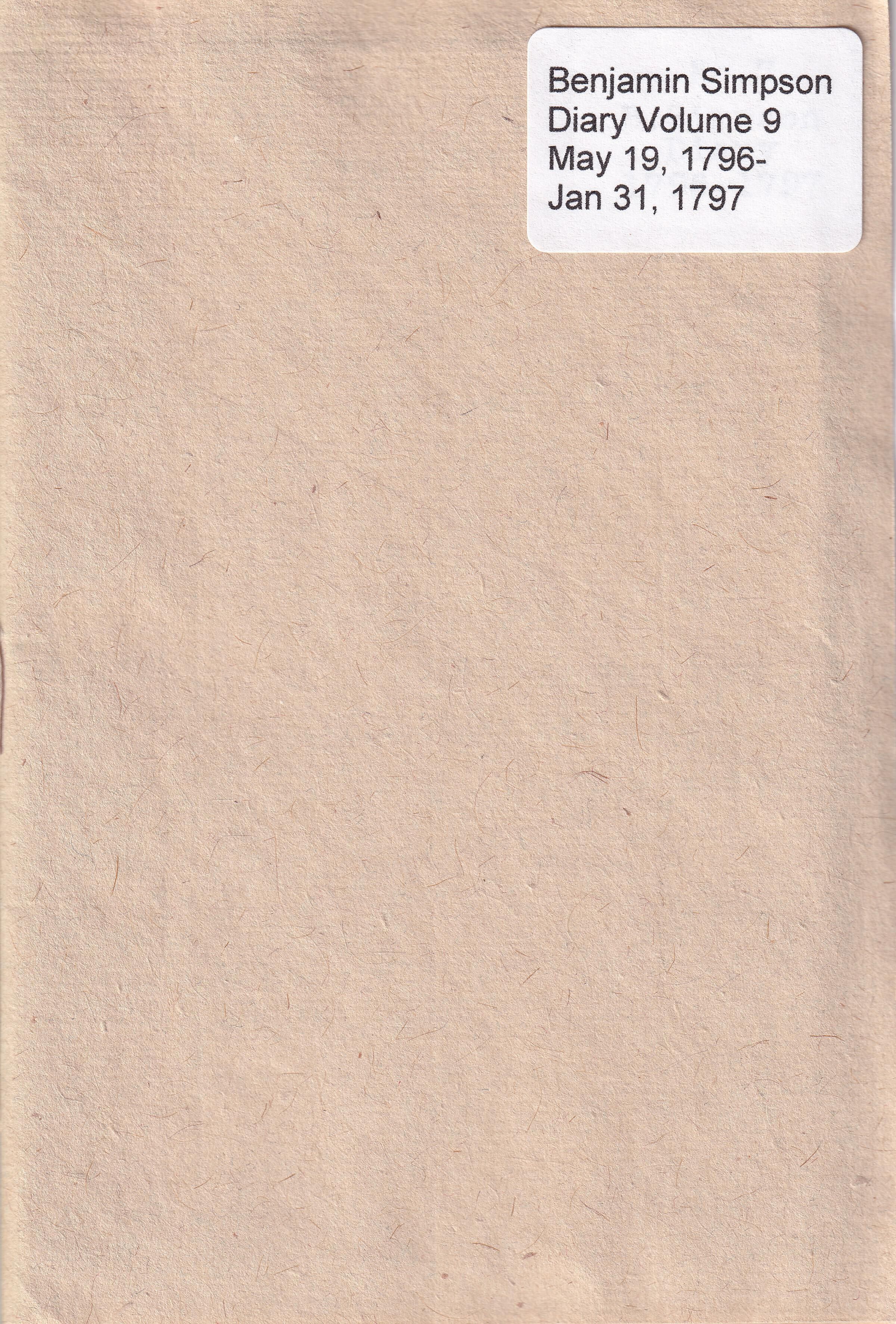 Ninth volume of the diary of Benjamin Simpson of Saco, 1781-1849. This volume covers the period May 19, 1796 through January 31, 1797. It is handwritten in ink on rag paper with a handsewn binding. Most of the entries are a single line. The date is listed at the top of each page, with individual entries (without dates) listed below. Simpson noted his major task of the day and the weather. His entries reflect the seasonal nature of the work of a man who owned a farm but also was a skilled mason.