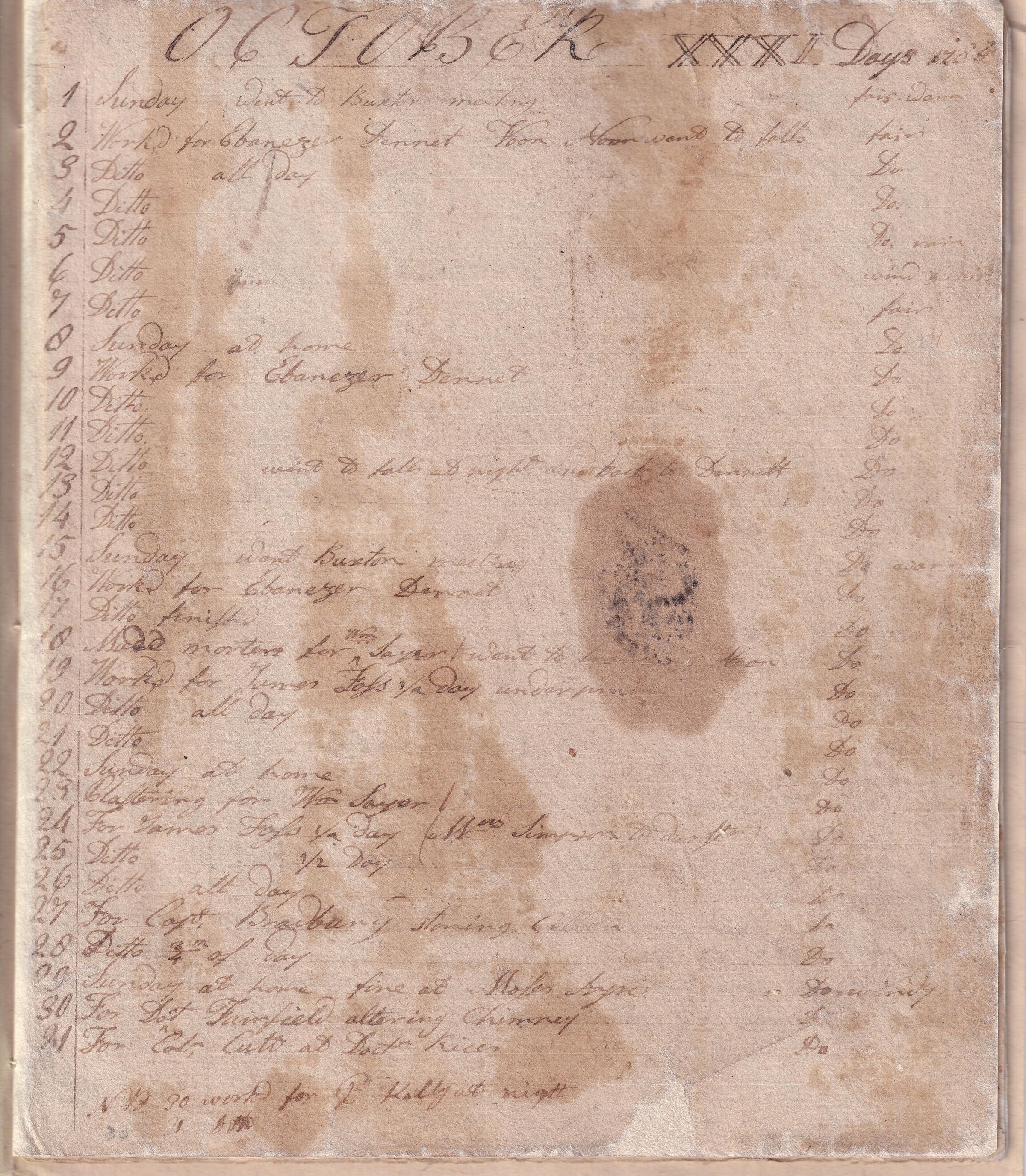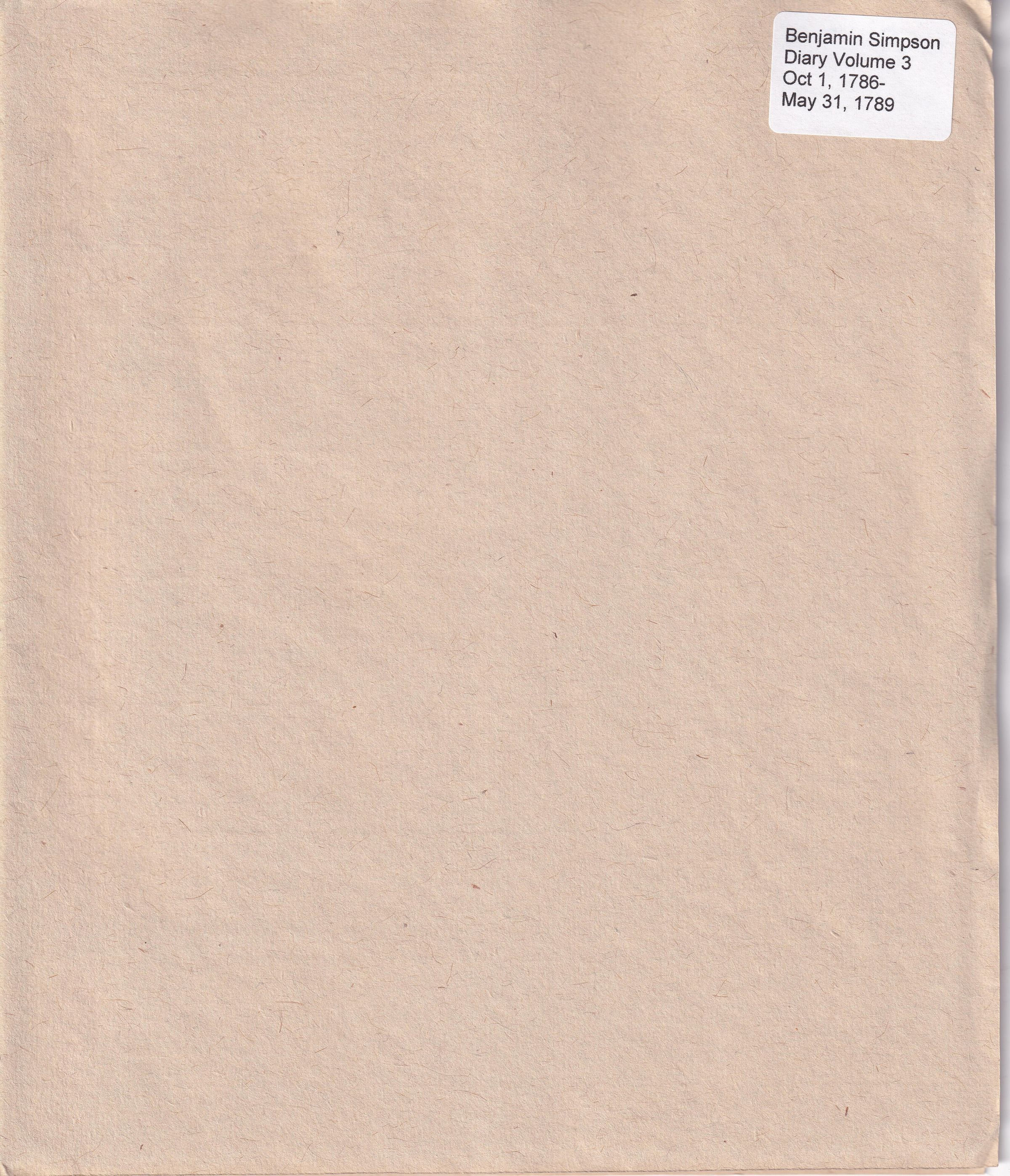 Third volume of the diary of Benjamin Simpson of Saco, 1781-1849. This volume covers the period October 1, 1786 through May 31, 1789. It is handwritten in ink on rag paper with a handsewn binding; it is now housed in a modern paper cover. Most of the entries are a single line. At the top of each page is the heading in fancy script, the number of days in the month, and the year. Individual entries are a single line of text with the weather for the day at the end on the right-hand margin. The days of the week are not indicated. Simpson noted his major task of the day and the weather. His entries reflect the seasonal nature of the work of a man who owned a farm.