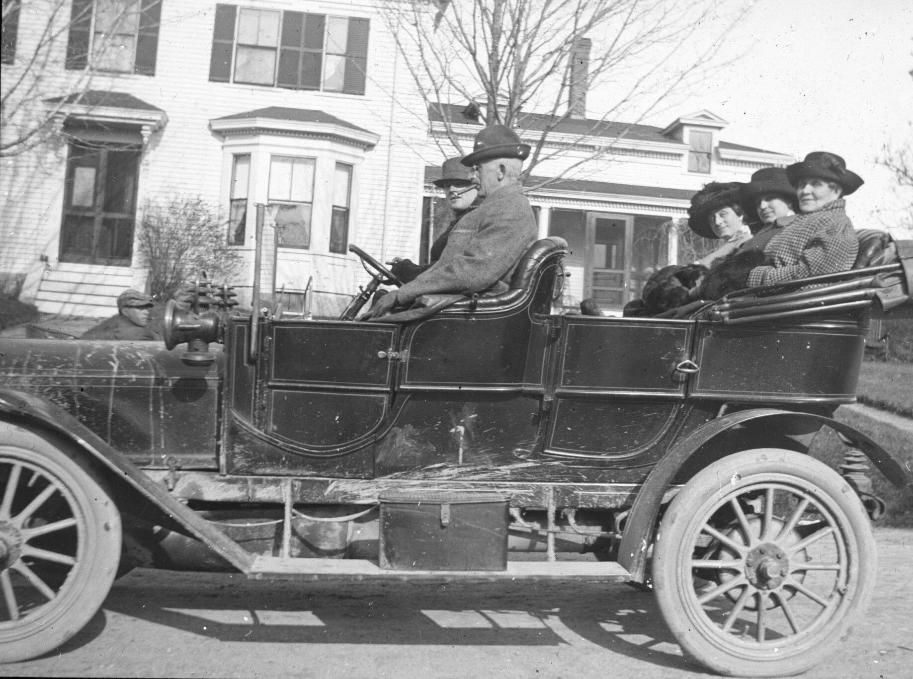 Glass lantern slide of five people in a car in front of a white house. "At the farm 1912, Joy Riders" is written on the label on the slide. This is likely the Cole family farm on Louden Road, in North Saco, that appears in other photos.