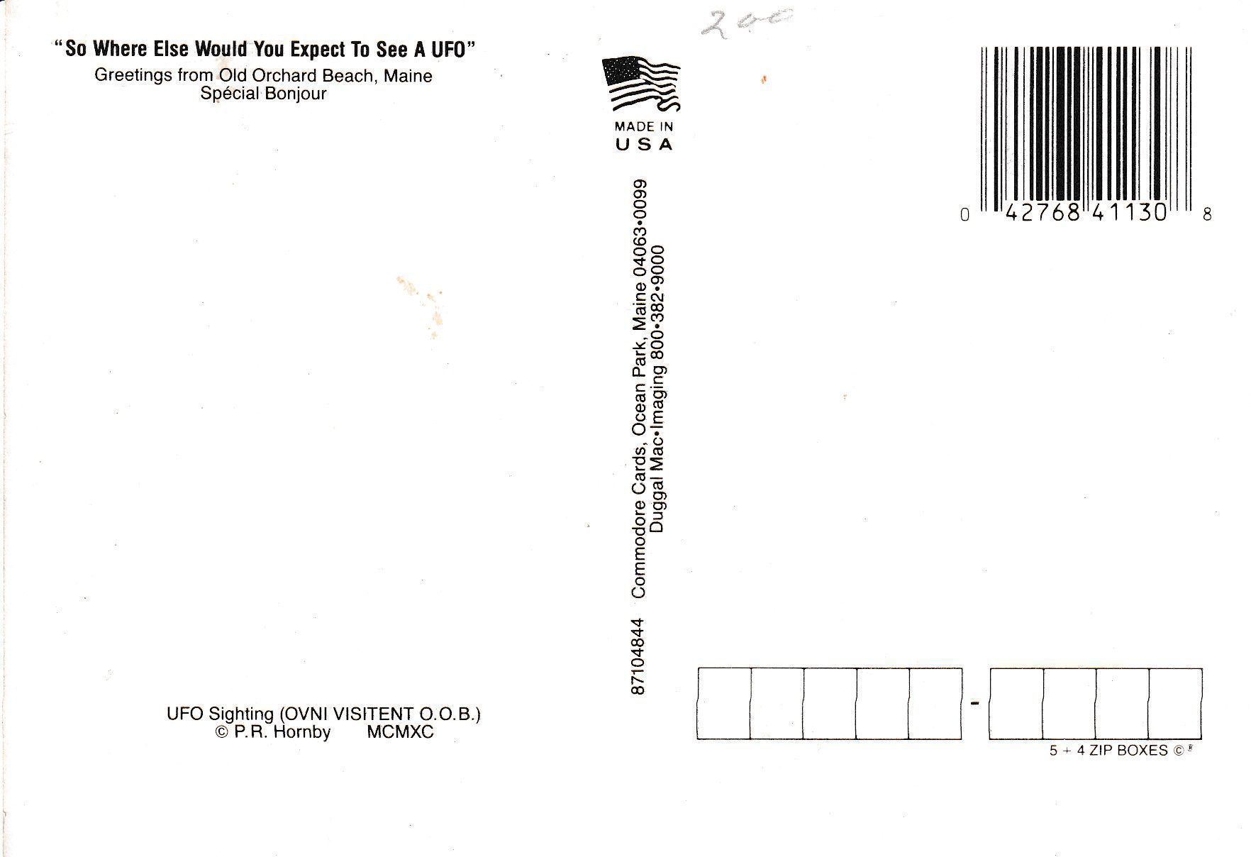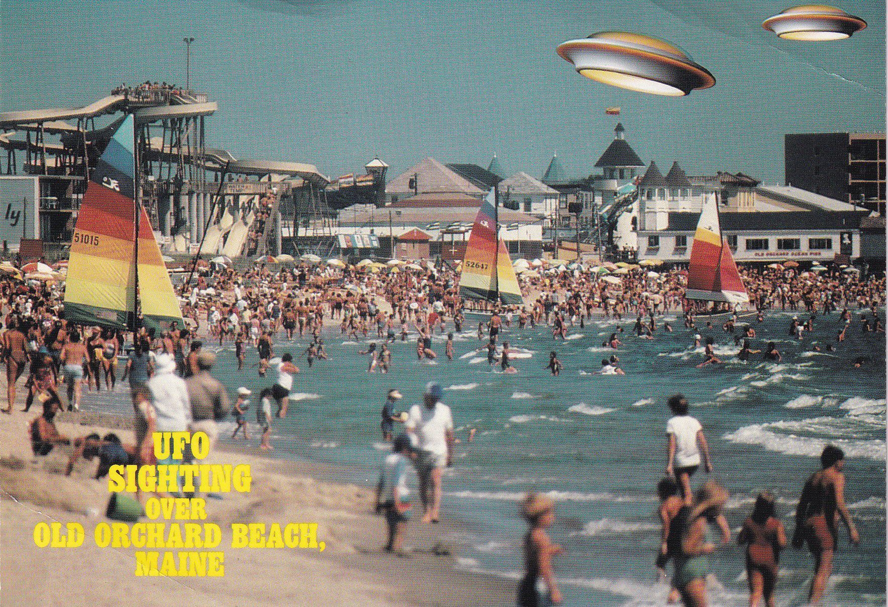 A postcard bearing a color photograph of a crowded beach with two UFOs added to the image.