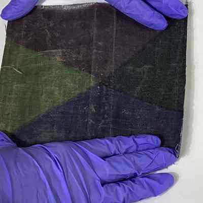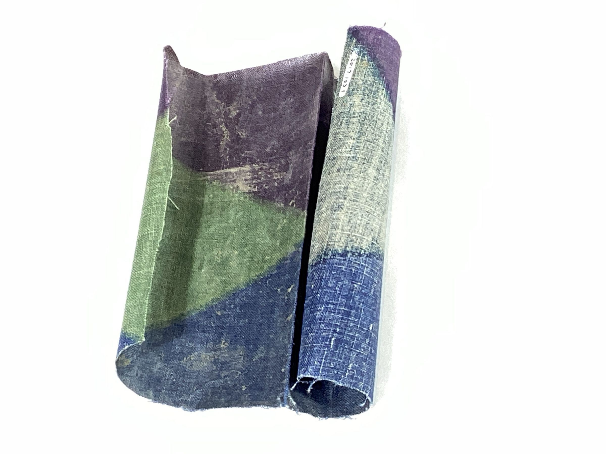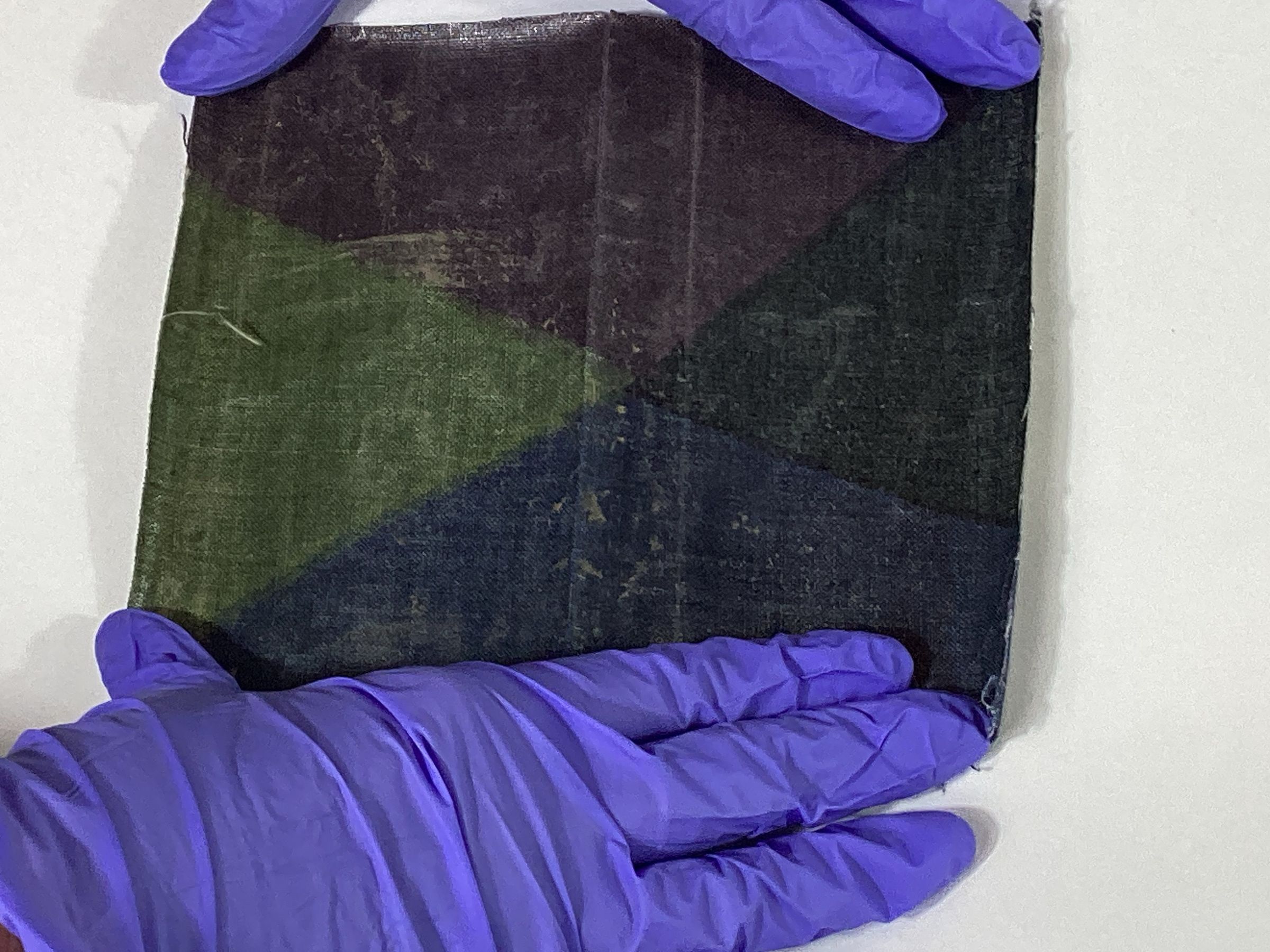 Woven material from the fuselage of wrecked plane from World War II. Camoflage pattern in green, back, and purple with a waterproof coating on the outside.Materials