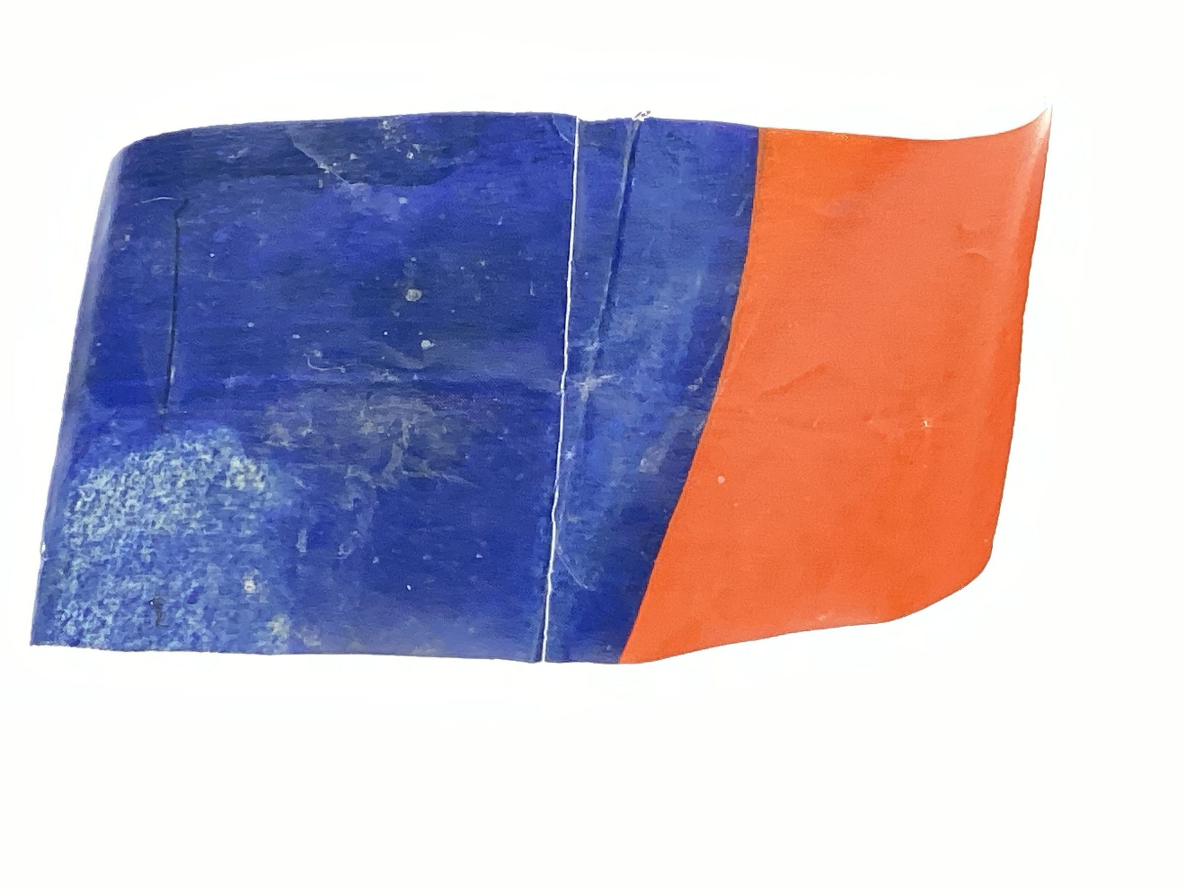Woven fabric from the fuselage of wrecked plane from World War II. Canvas with a waterproof coating over orange and blue color.