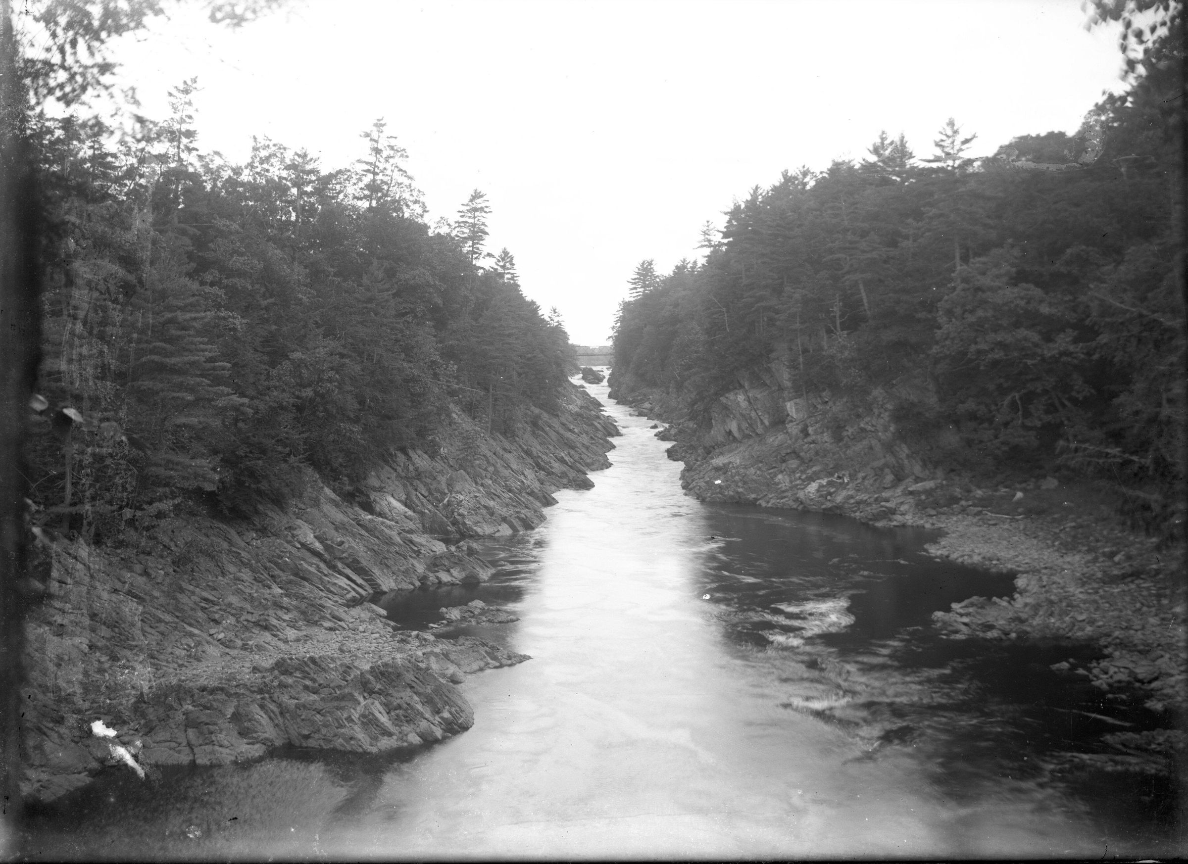 Glass plate negative photo of the Saco River, likely in the Buxton-Hollis area.