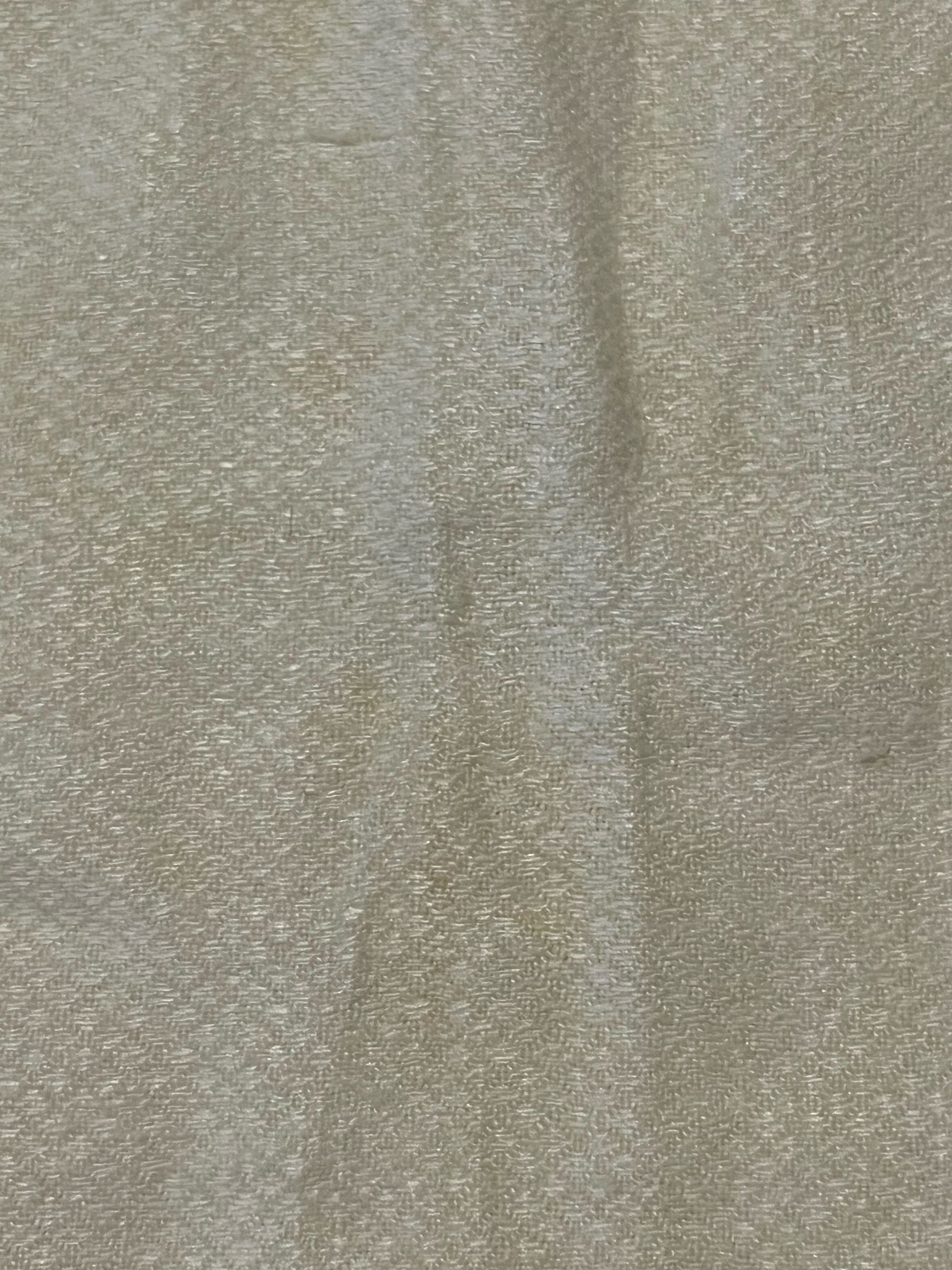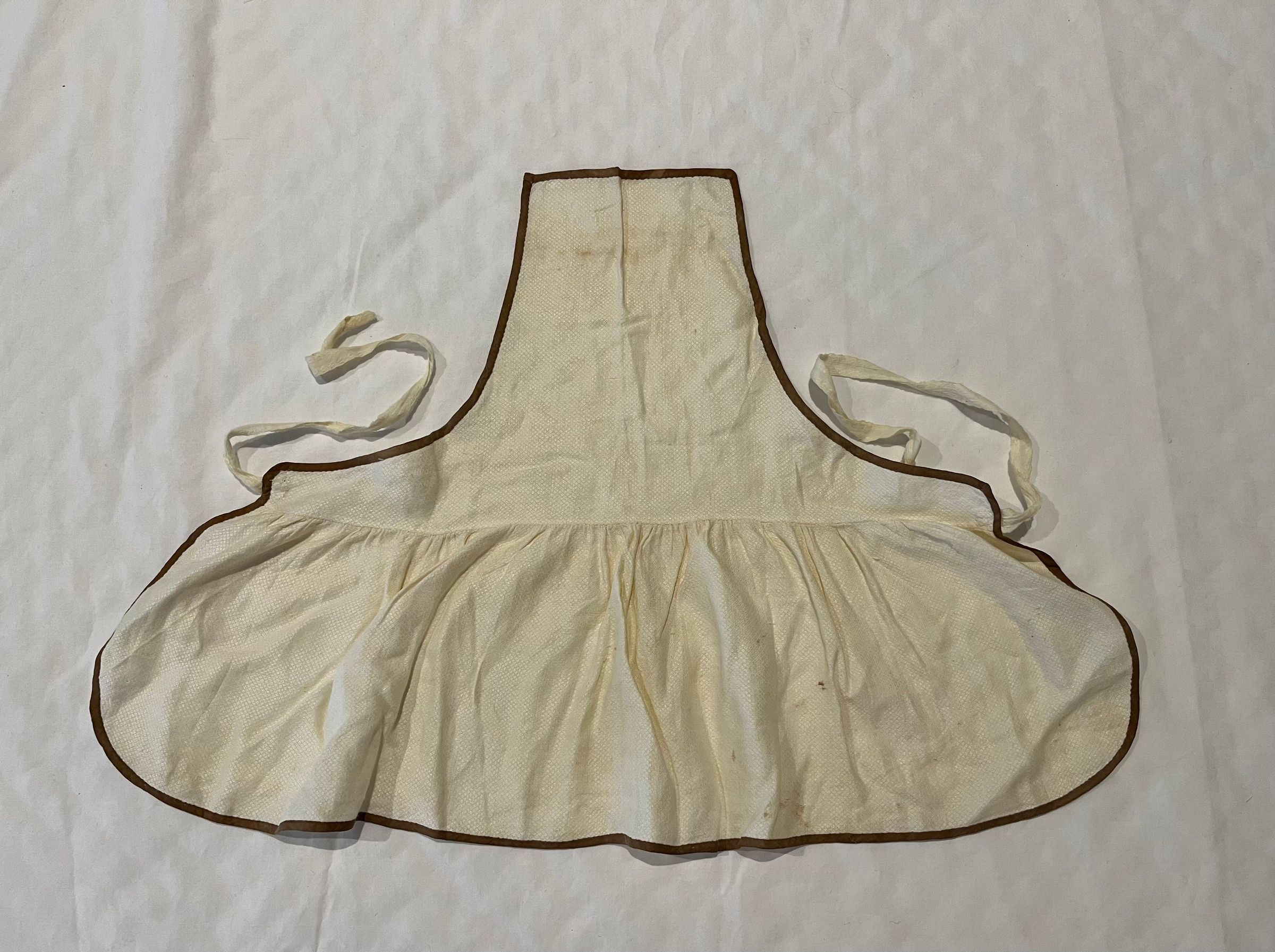 Child's apron of lightweight cotton woven in a diamond pattern. Trimmed with a fine woven brown cotton tape. Ties at the waist with twill tapes.