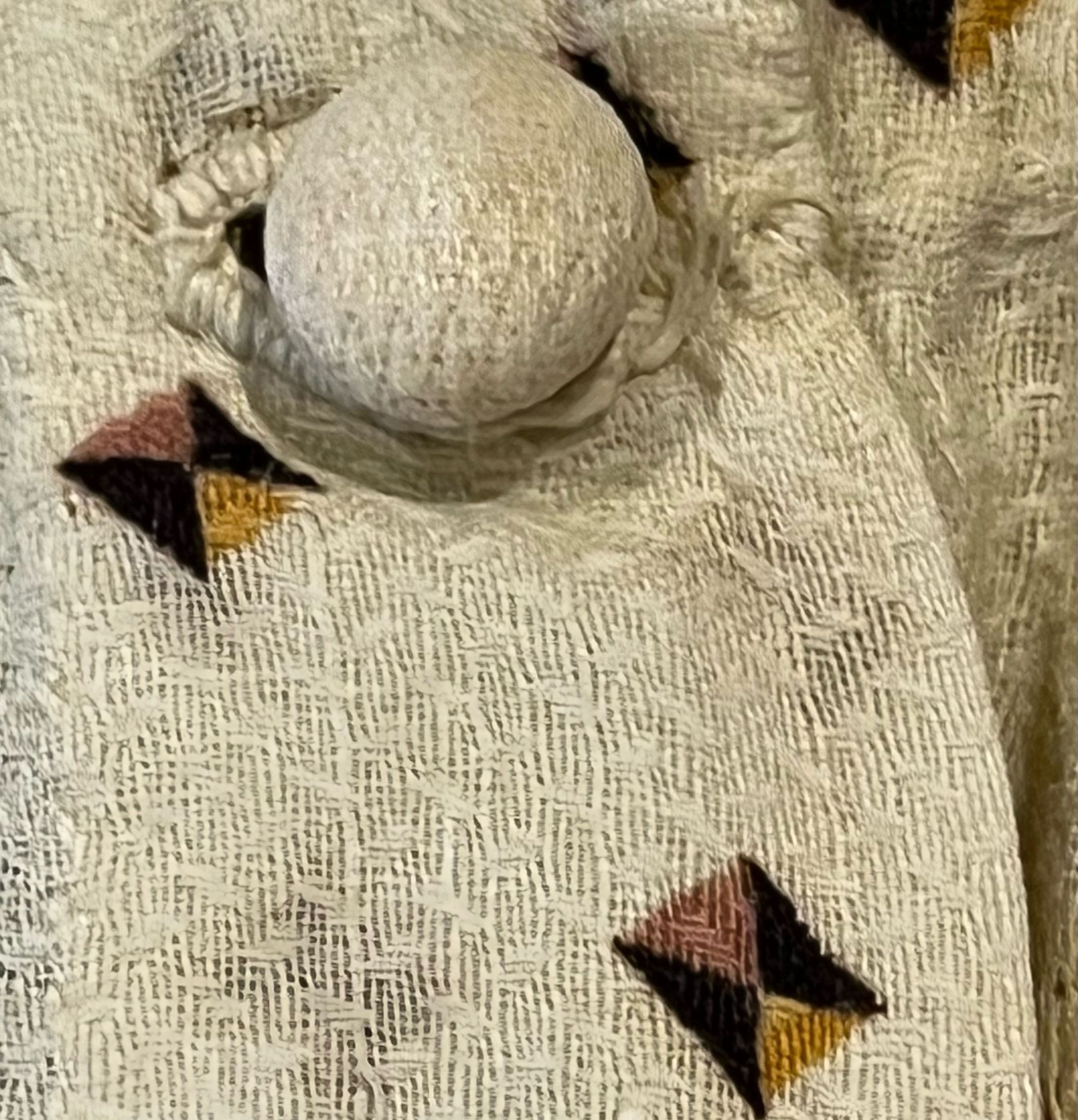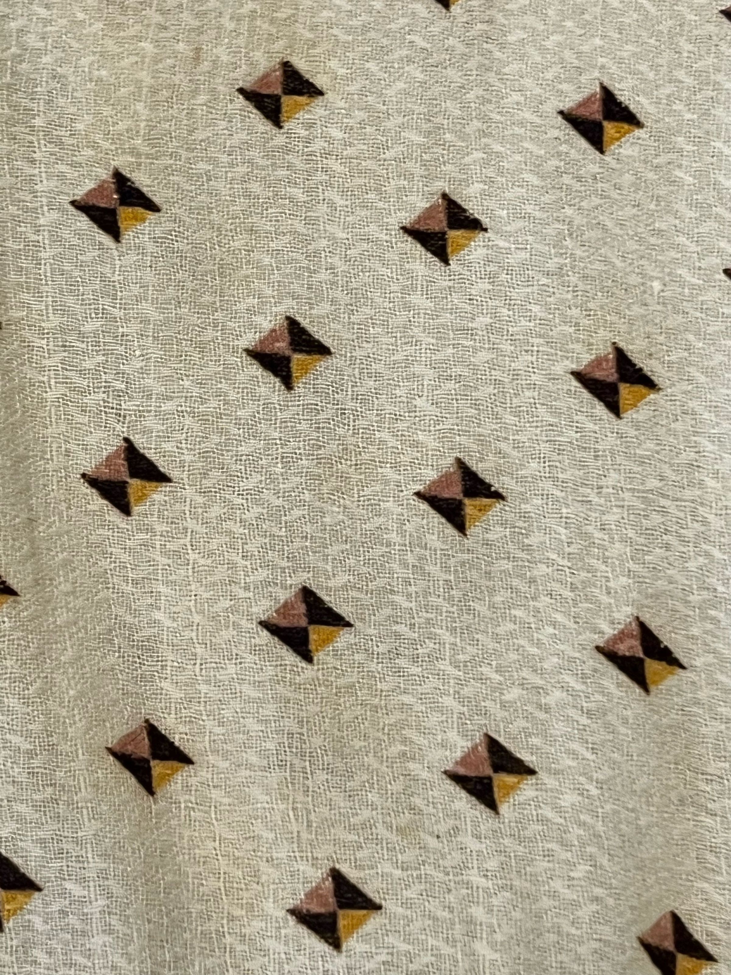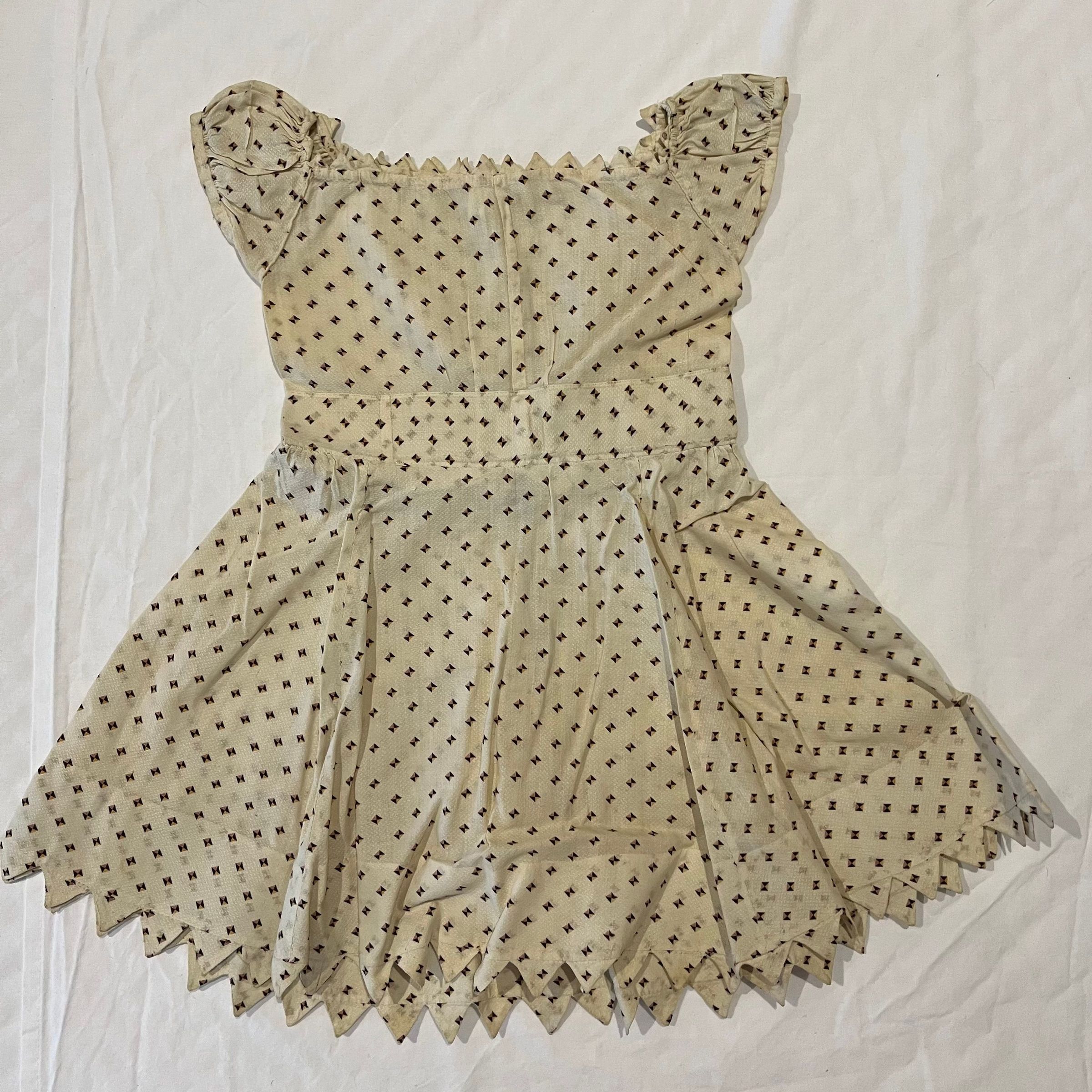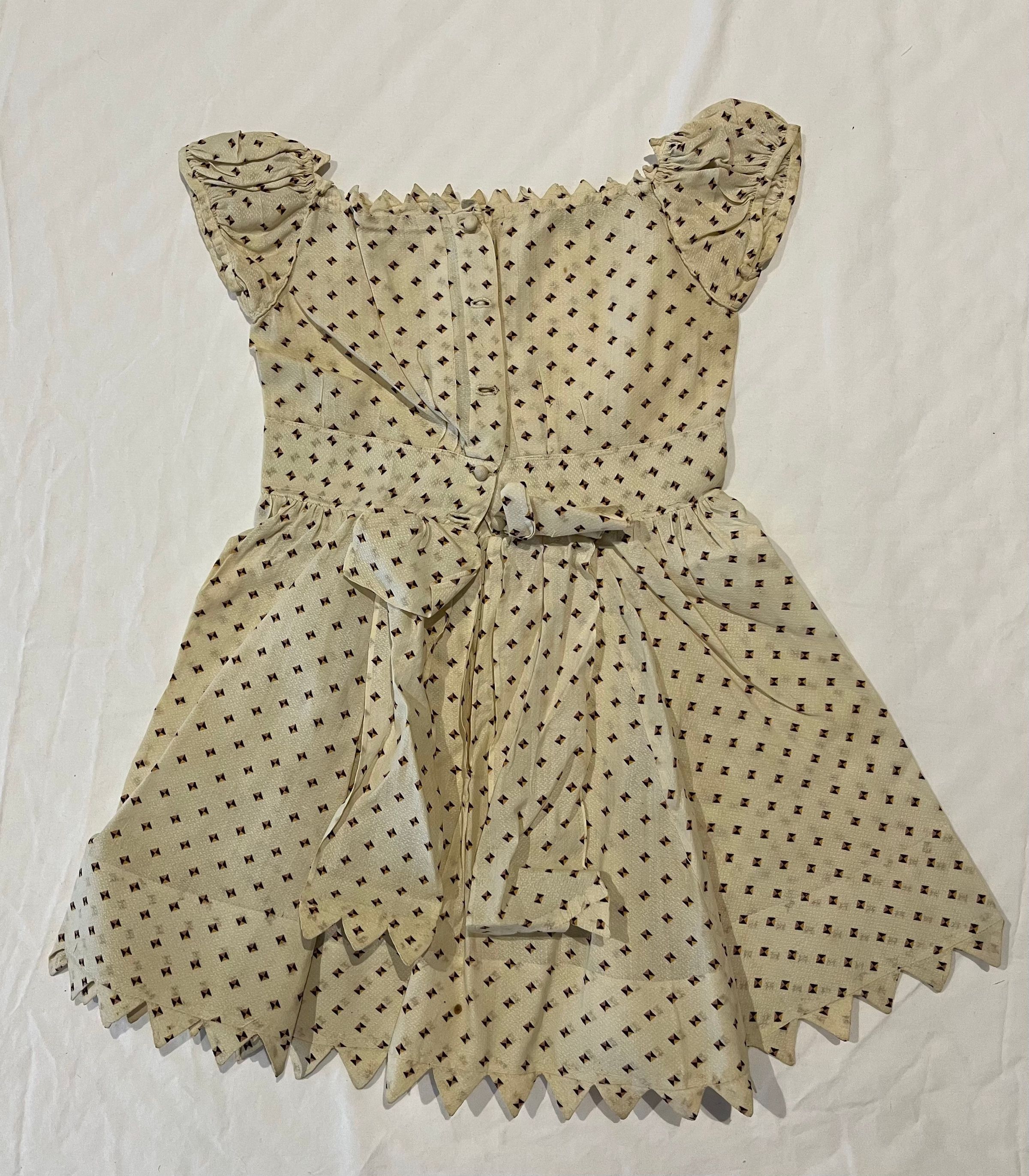 Child's dress of cream cotton with a small geometric print in dark brown, gold, and a muted pink. The neckline and skirt hem have vandyke trim. Full skirt. Small gathered puffed sleeves. Opens down the back with five small cloth-covered round buttons between the neckline and the waist; it is open below the waistline. At the back waistline are two applied self fabric "bows" with hanging ties that have vandyke trim.